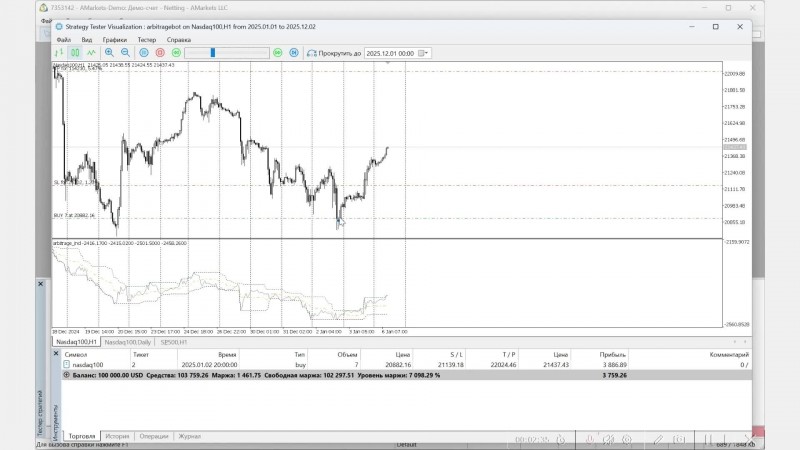 В этом видео показываю, как торговал робот со стратегией одноногий арбитраж на паре Nasdaq и SnP500 в 2025 году.