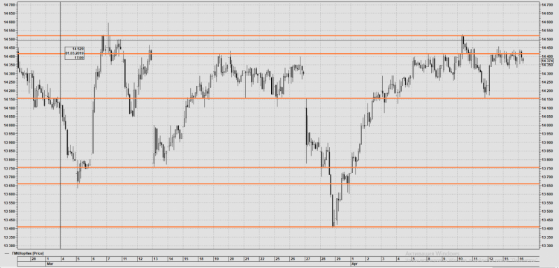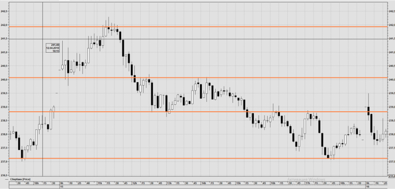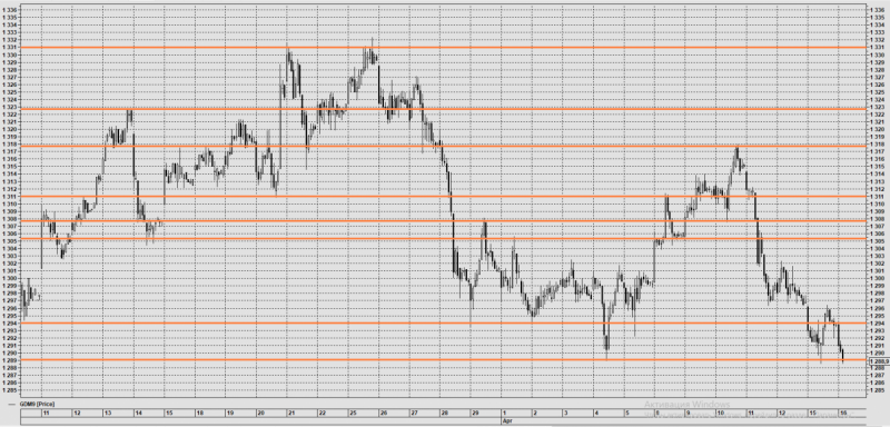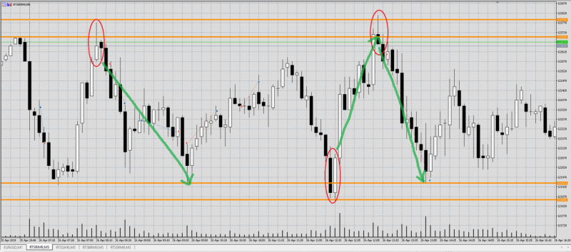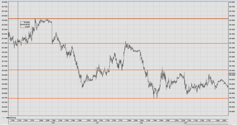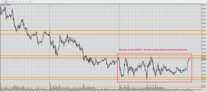 По окончании торговой сессии 26 апреля можно понять, что сегодня цена ходила в боковике между ценовыми уровнями. С хорошим размахом в 700-800 пунктов. Можно было, особо не напрягаясь, прибыльно поторговать.