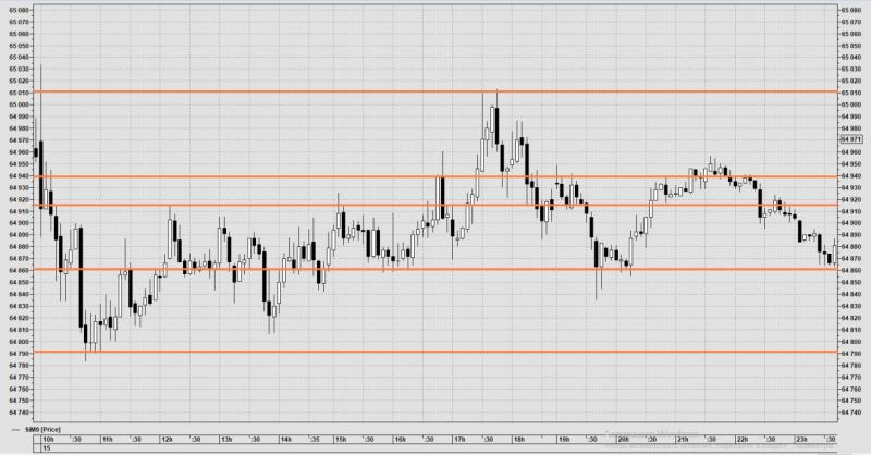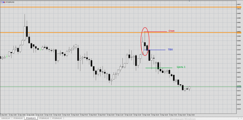 Причина входа: на ценовой зоне 64525/64419 на ТФ 15 минут сформировалась свечная модель пин-бар. Сделка в шорт.