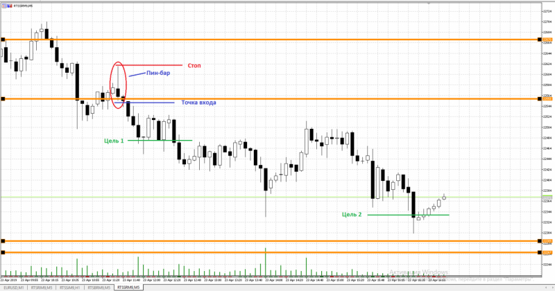 Причина входа: на ценовой зоне 22670/22558 сформировалась свечная модель пин-бар. Сделка в шорт.