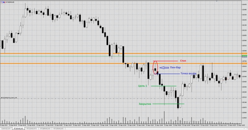 Причина входа: на ценовой зоне 125804/125670 сформировалась свечная модель пин-бар. Сделка в шорт.