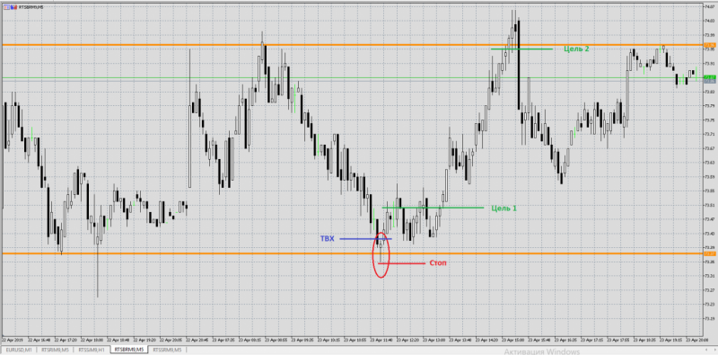 Причина входа: на ценовом уровне 73.37 сформировалась свечная модель пин-бар. Сделка в лонг.