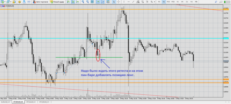 Дождался ретеста, как я подумал, "нужного" уровня. На пинбаре донабрал позицию +2 контракта.