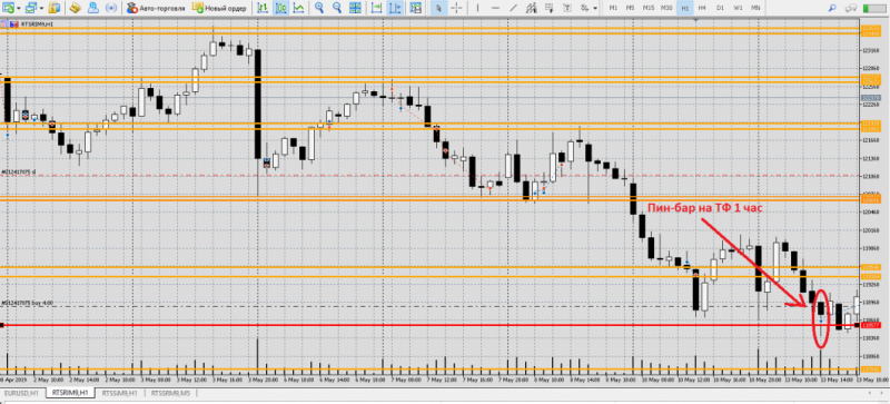 Дожидаемся свечной модели. В данном случае - пин-бар.