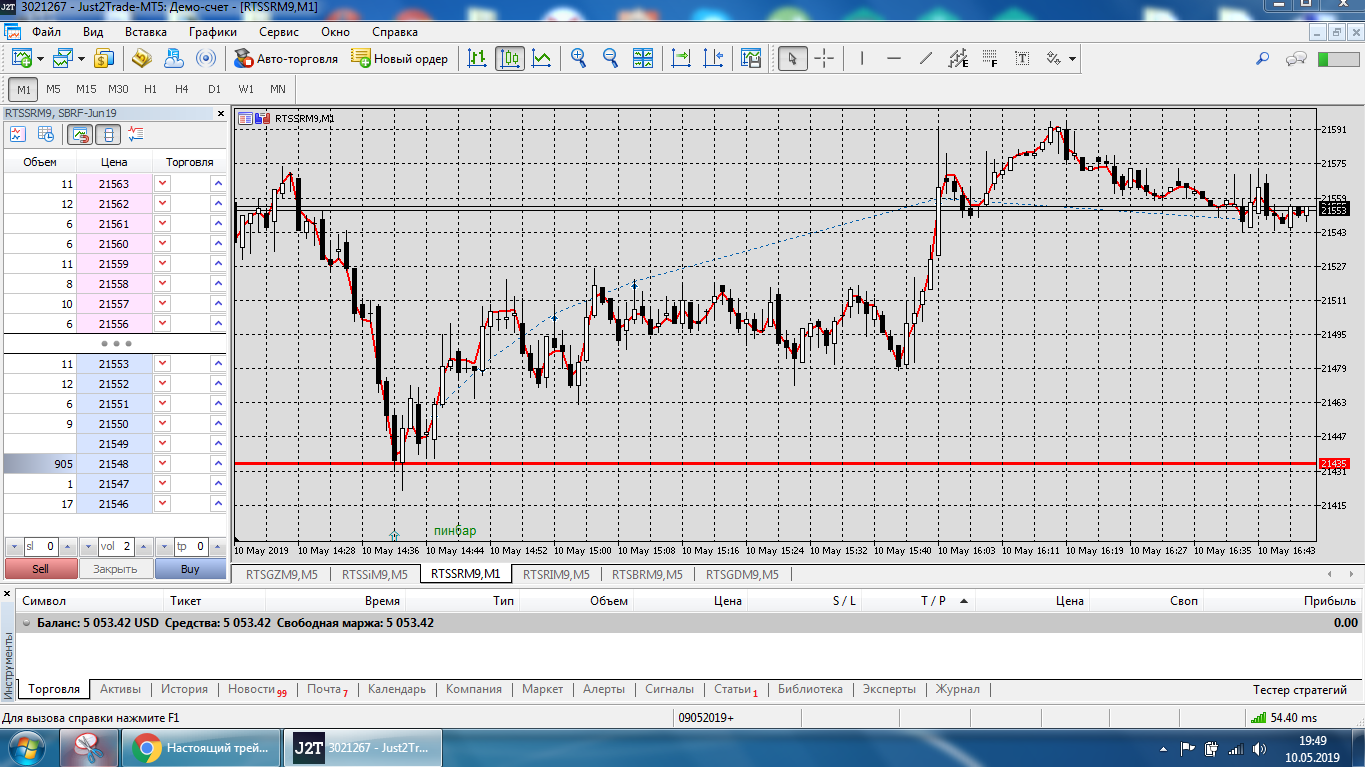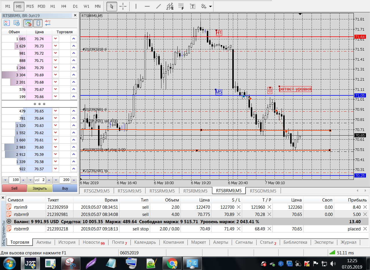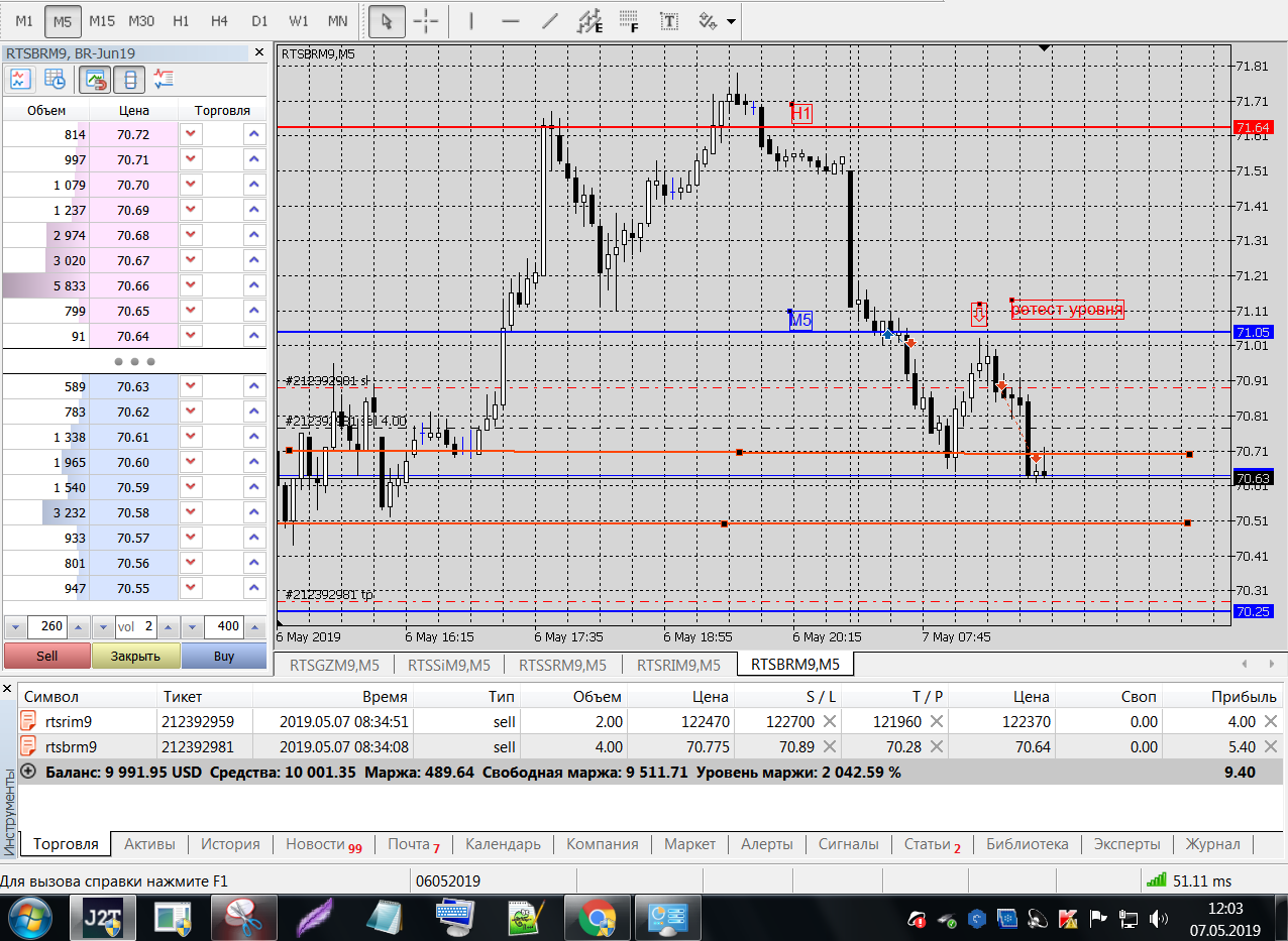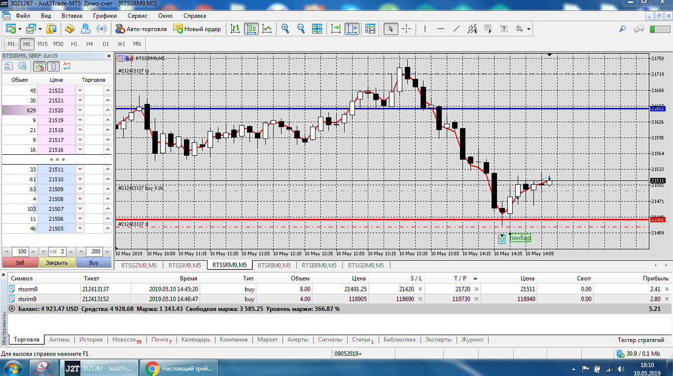 SRM9, входил по пин-бару от уровня Н1 по 2 контракта, выходил по стопу