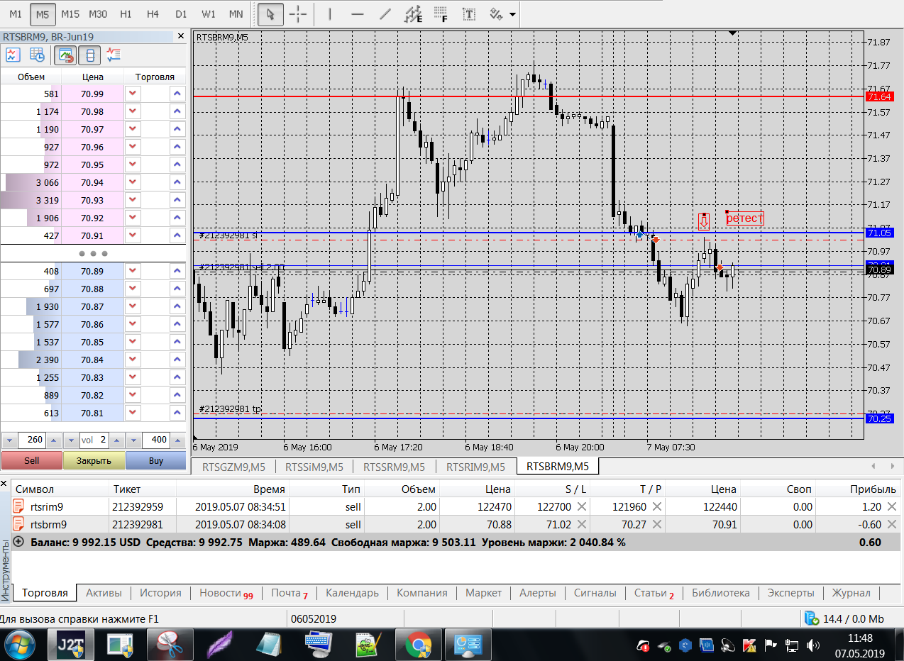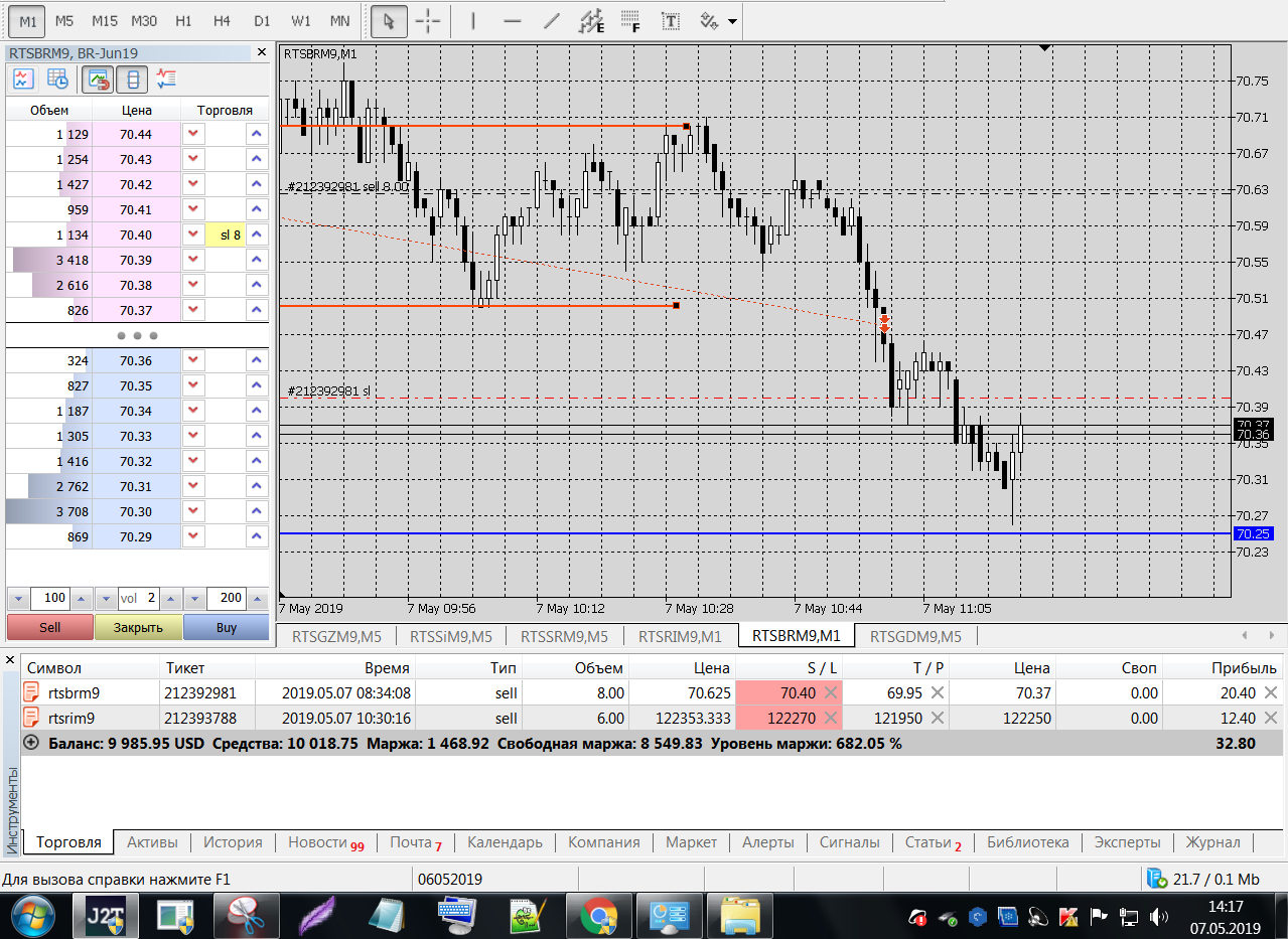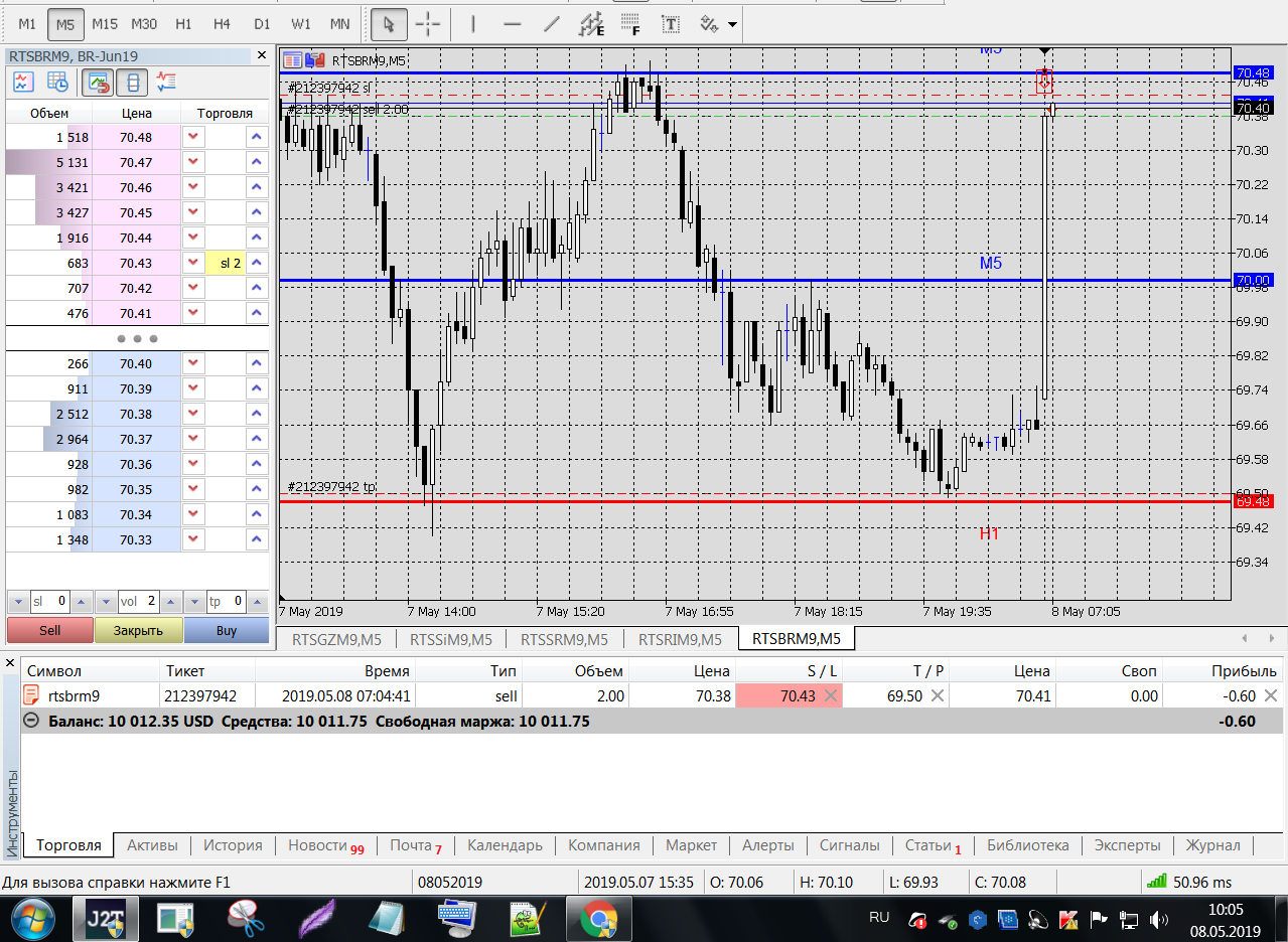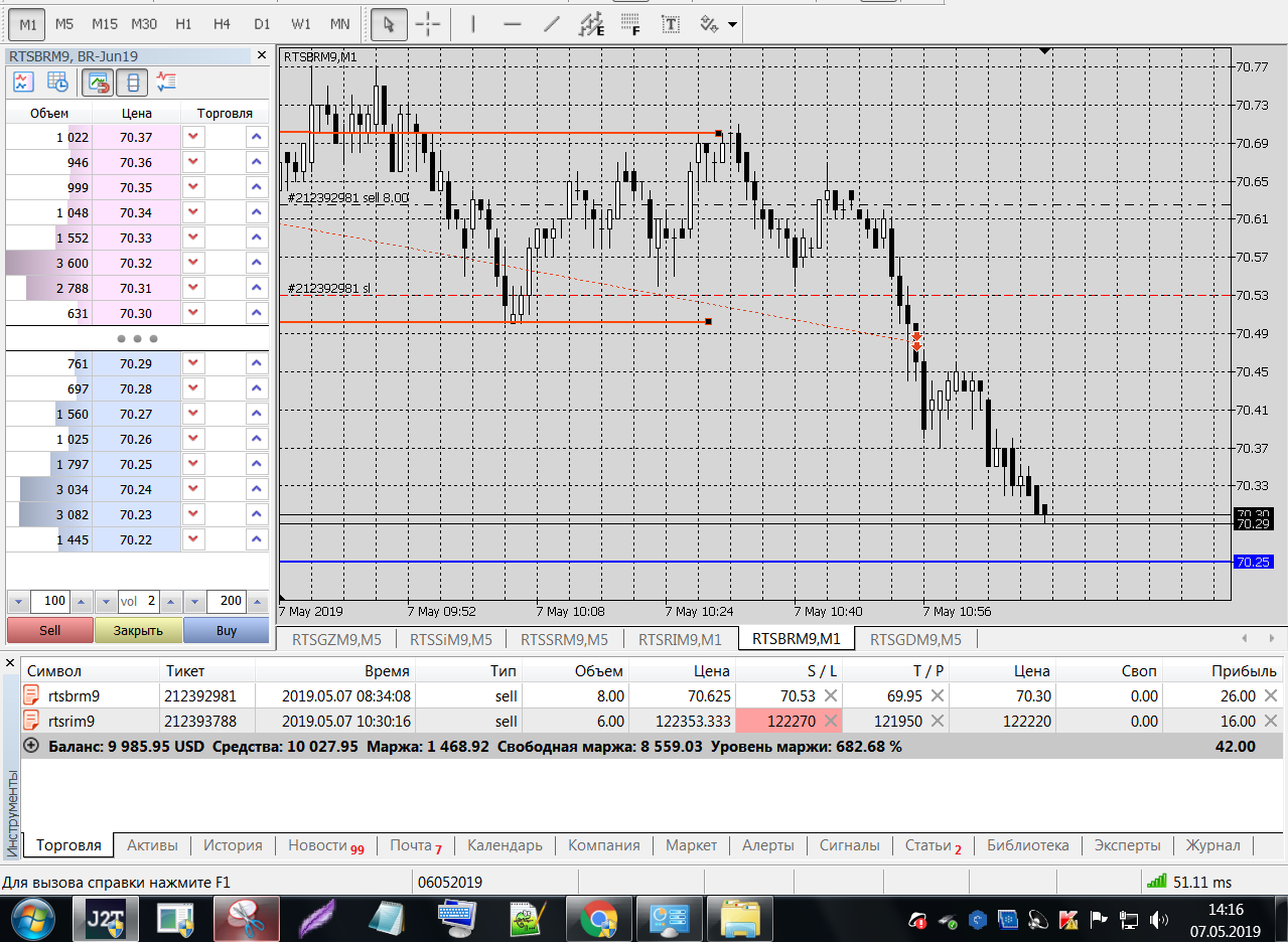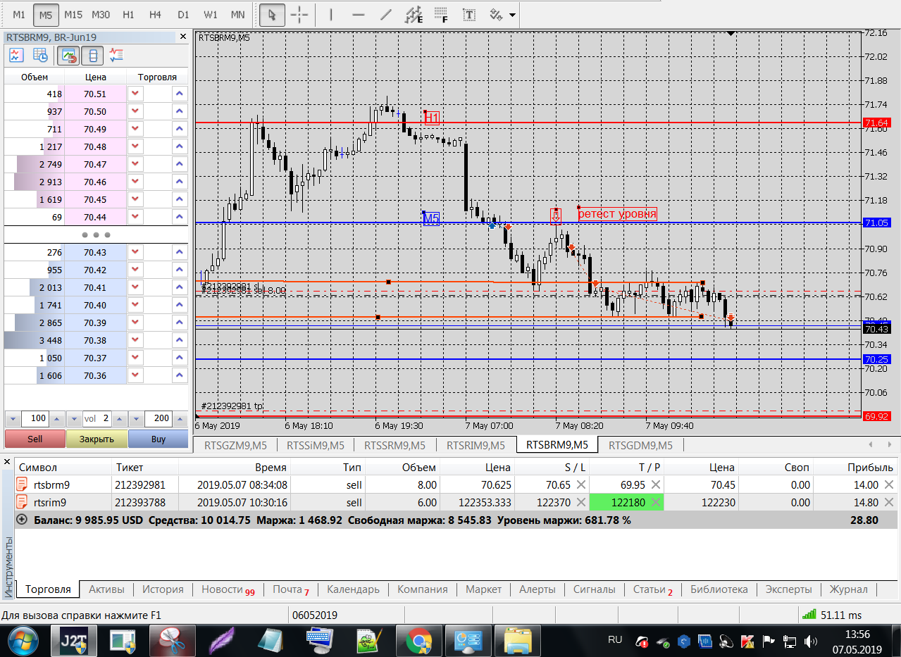 BRM9 утром резко (+0.70) ушел вверх, решил торговать вниз до Н1