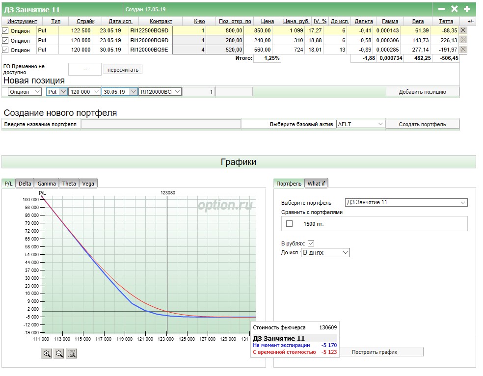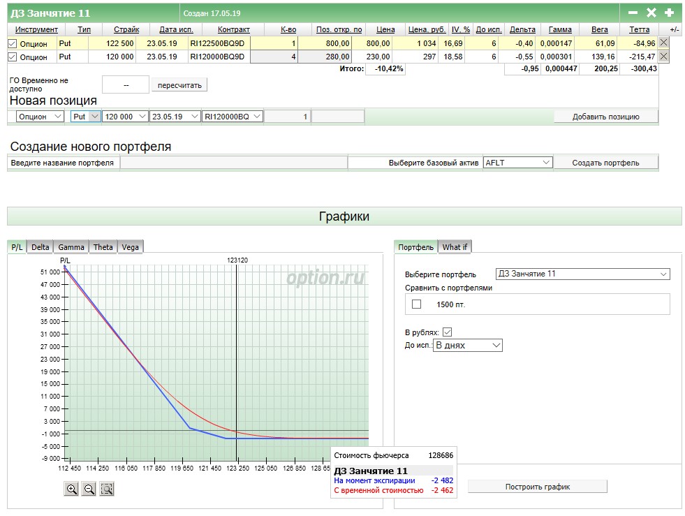 Пока в опционном аналитике экспирация 30.05.19 не отображается (но в квике доступны), поэтому в аналитике эти опционы взять не могу. Как только они там станут доступны, добавлю в позицию еще ПУТы 120 000 страйка (4 шт. по 520 пт.)