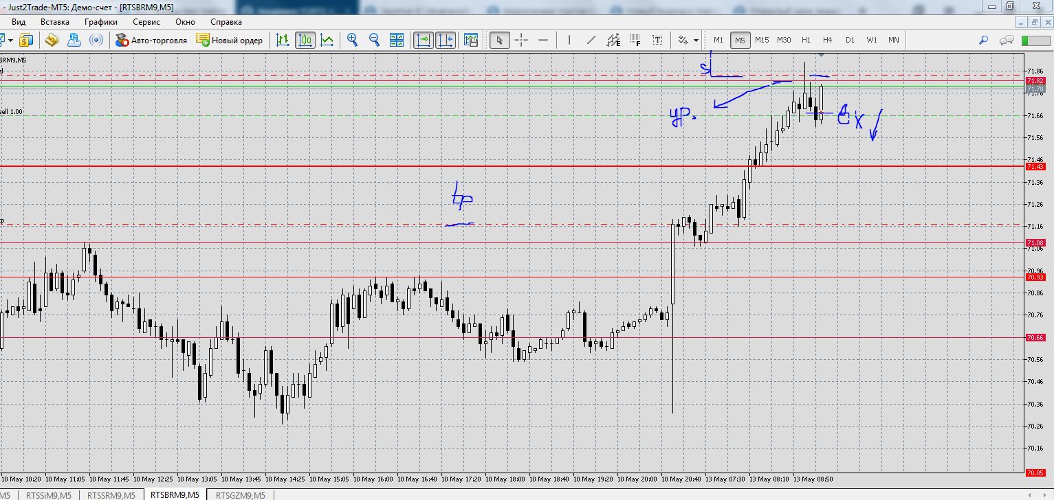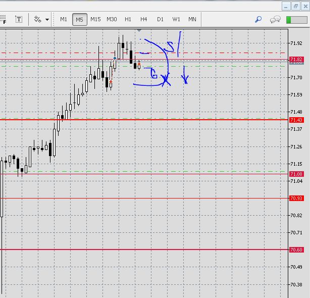 Все тот же отбой от уровня 71.82, отбой и вход по пин-бару, чуть ниже (вход получился не совсем правильный , так как запутался с кнопками немного).