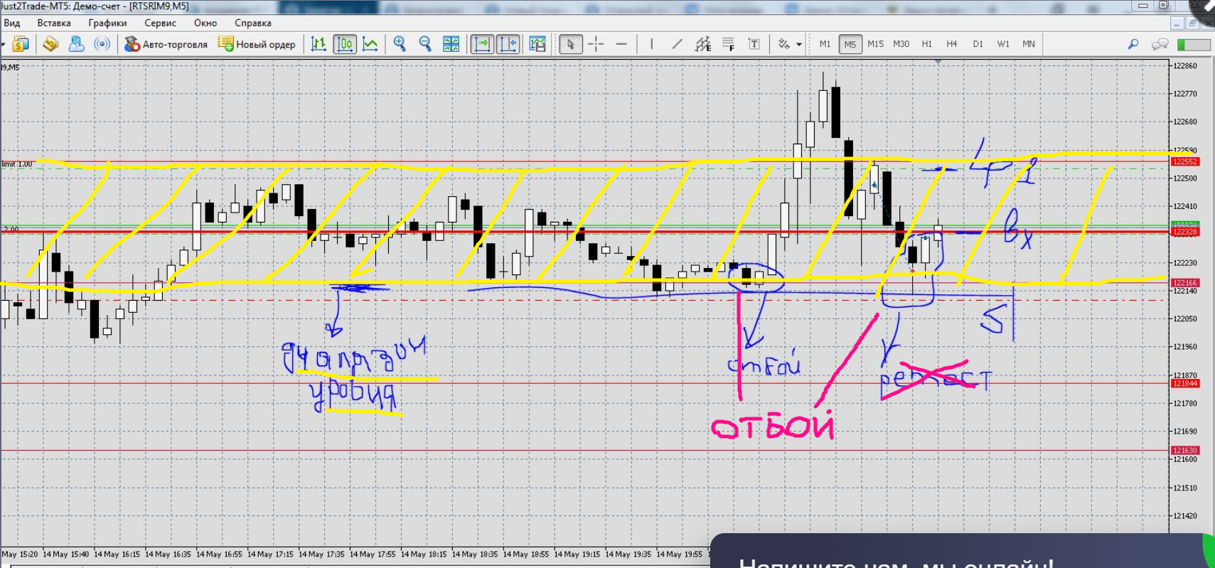 2) отбой с ретестом от локального уровня 122 166 (он же входит в диапазон основного уровня 122 328), вход выше пин - бара, стоп под него.