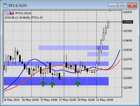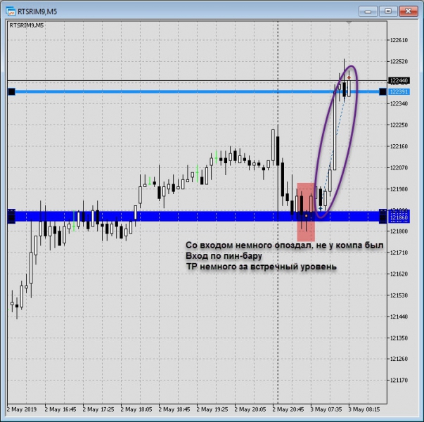 Борис, Вы правы оказались. Цена после открытия торгового дня ушла вверх к уровню на отбой или пробой, пока не понятно (самая крайняя свеча).