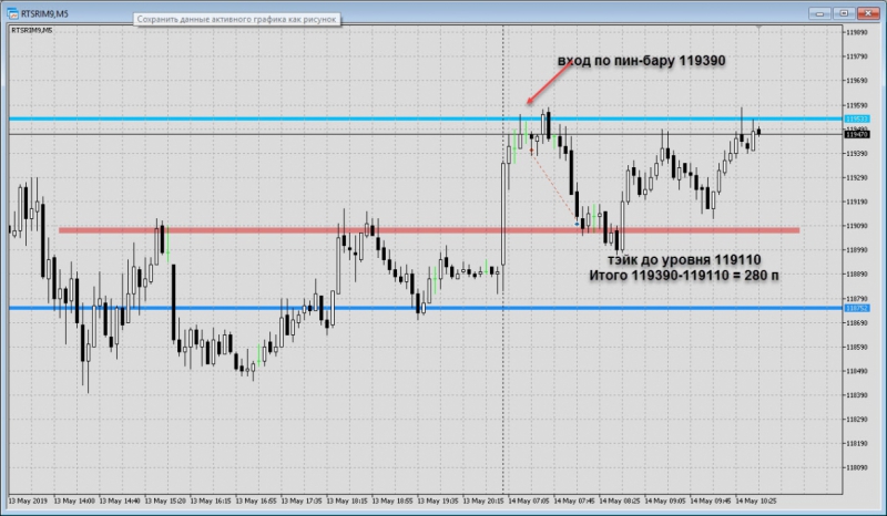 Зато сейчас, если объединить перед предпоследнюю свечу с предпоследней, то получим пин-бар для ЛОНГа от уровня. И после подтверждения сигнала, можно рассматривать сделку в ЛОНГ.