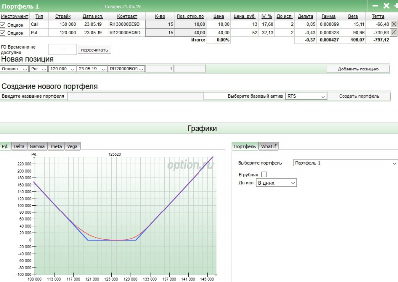 Беру 5000 п. вверх и вниз. Это будут 120 000 и 130 000 страйки. На этих страйках покупаю 15 колов и 15 путов. Вот мой первый стренгл.