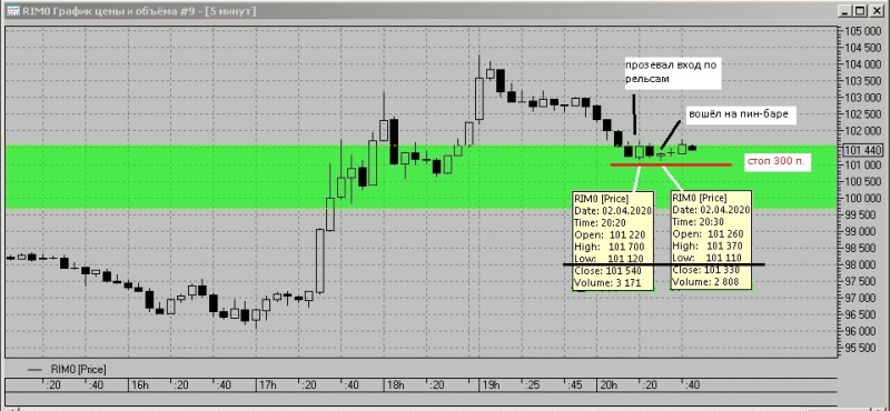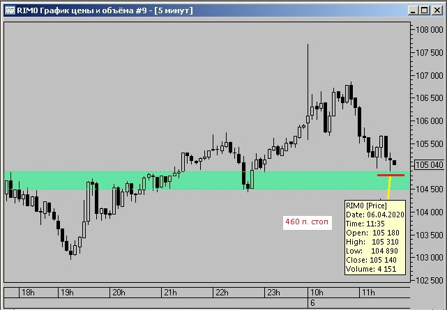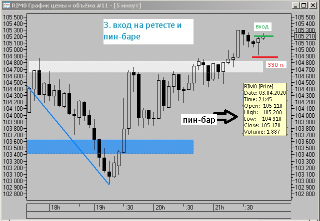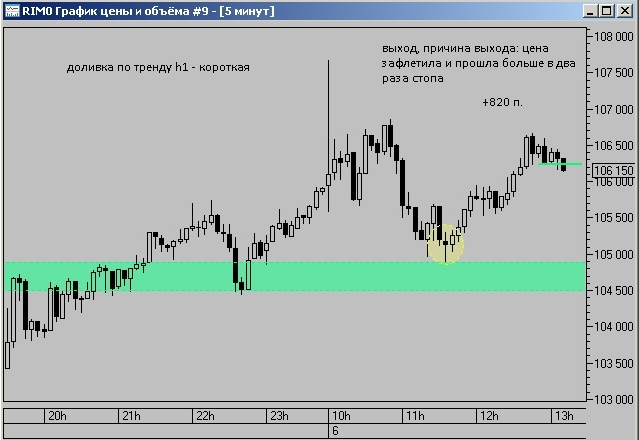Что-то фьючерсная торговля, начинает мне не нравится, вторая неделя нормальных входов нет, попробовал совершить сделку в Лонг с ретеста, правда пин бар в боковике был.