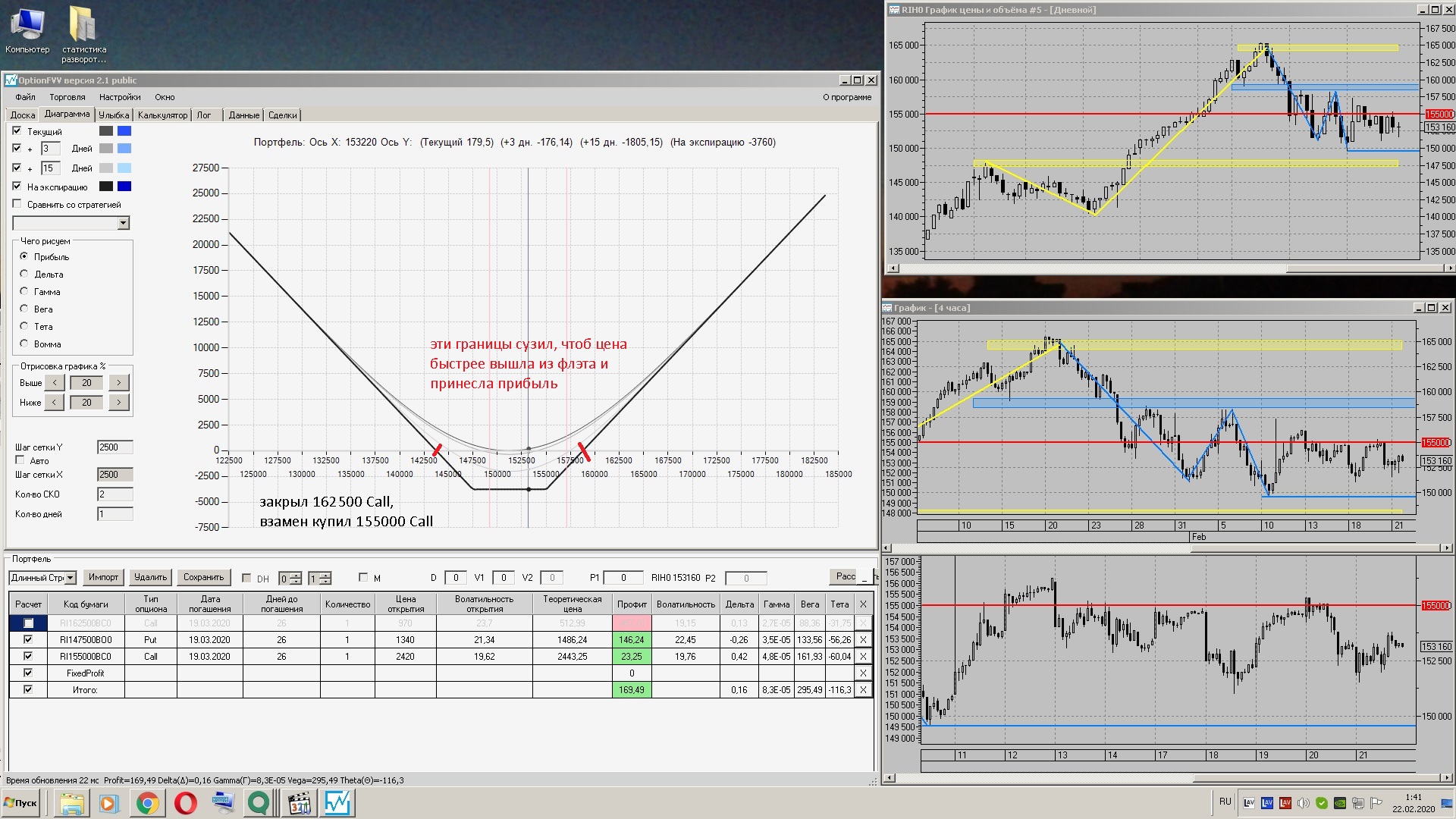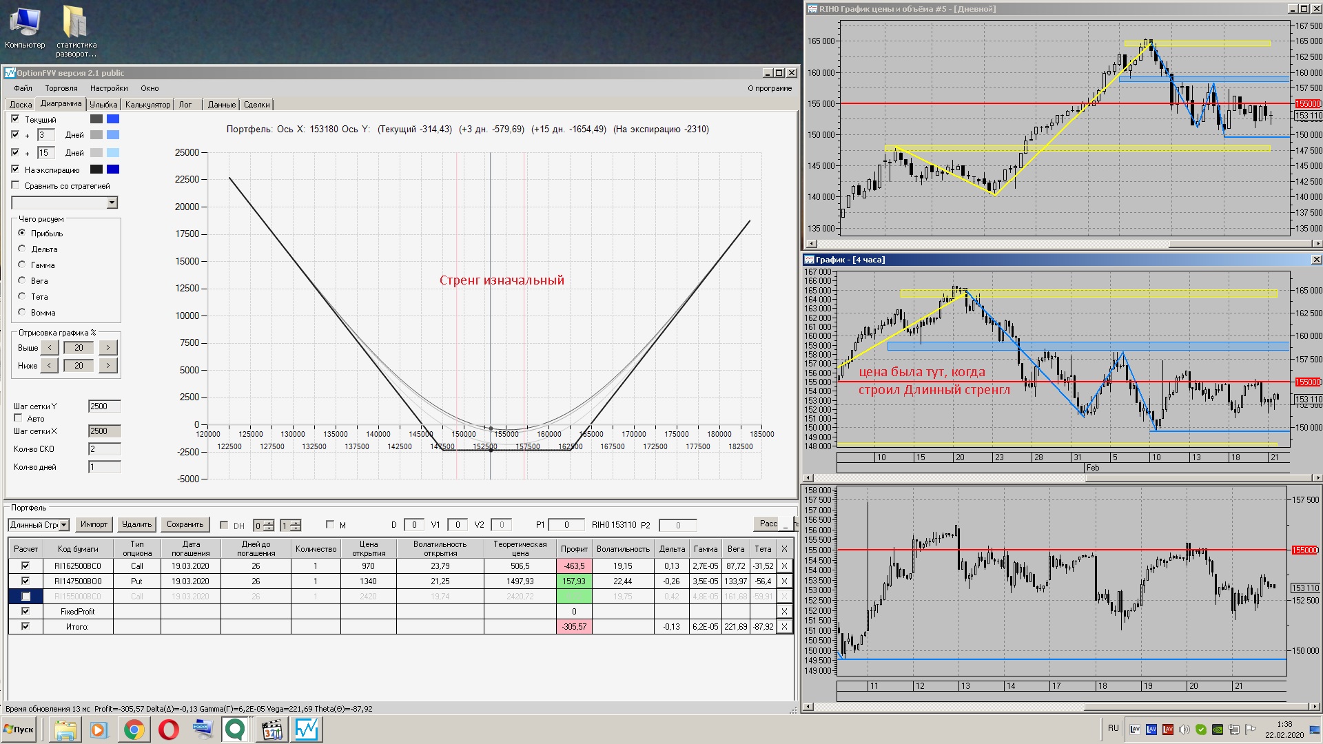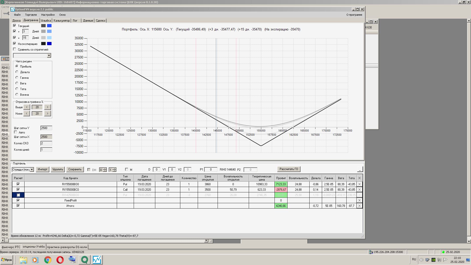 Цена по фьючерсу не прошла 2500 пунктов от построения опционных конструкций, ничего не трогал, решил поработать над занятием-7