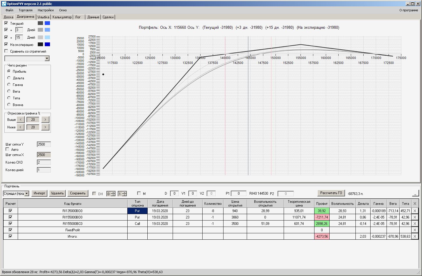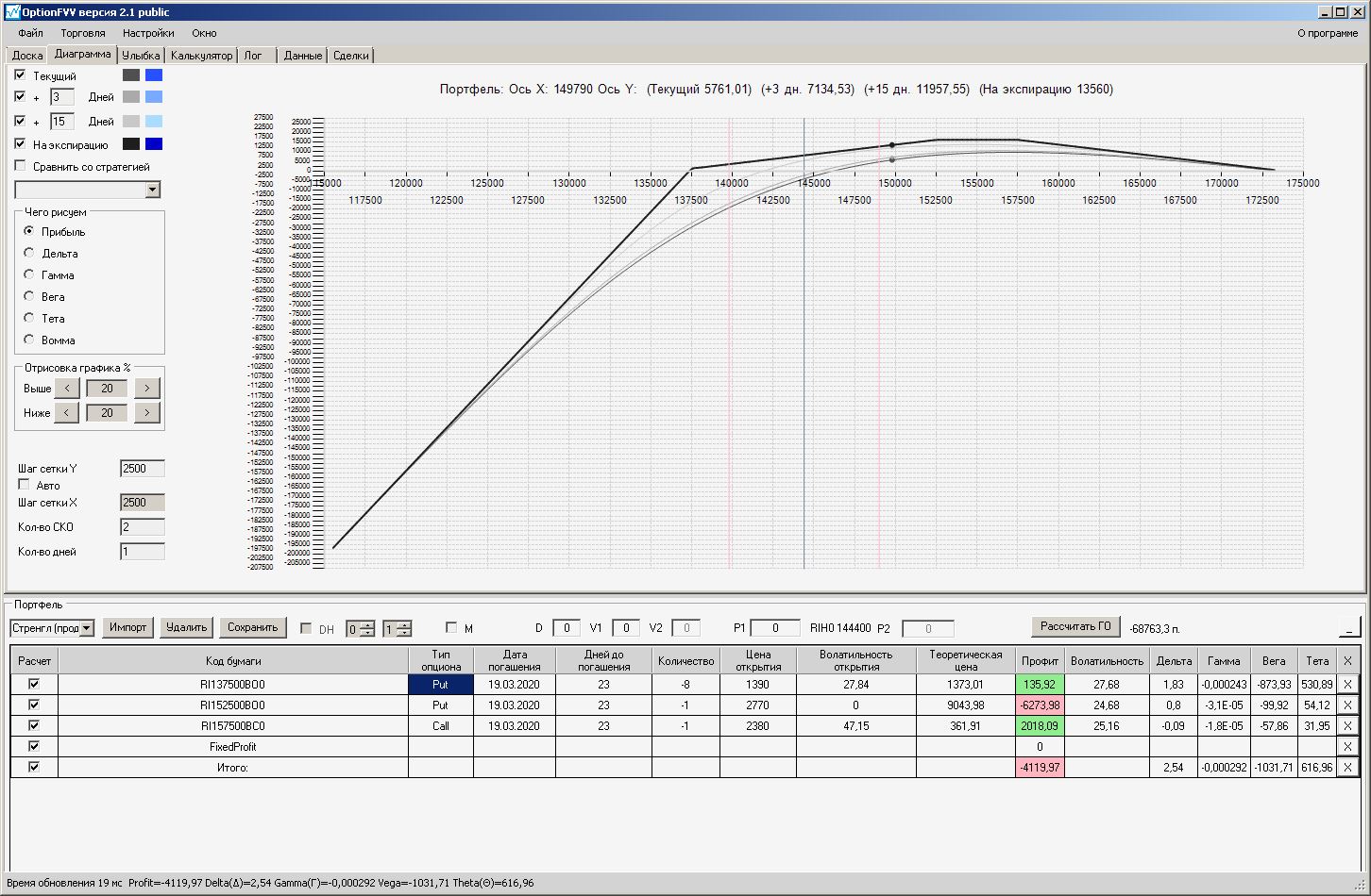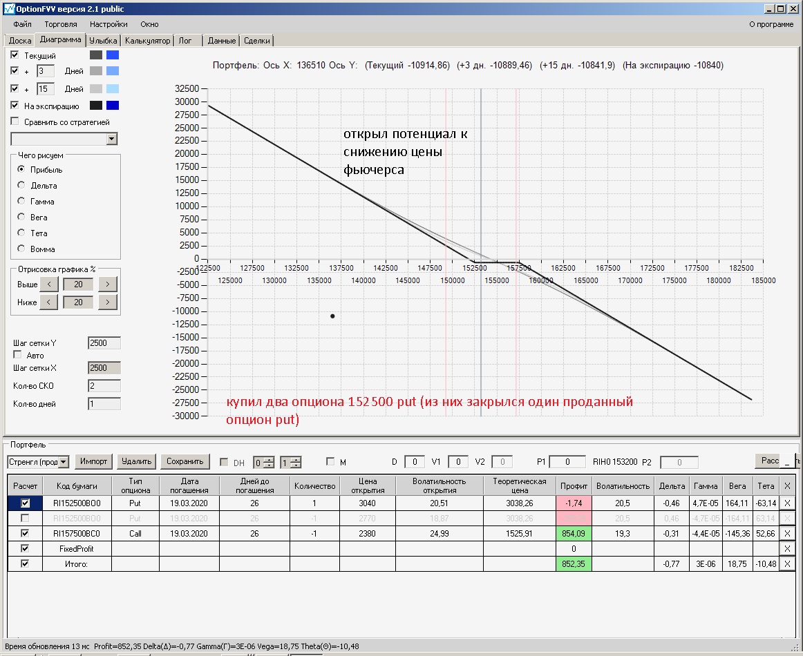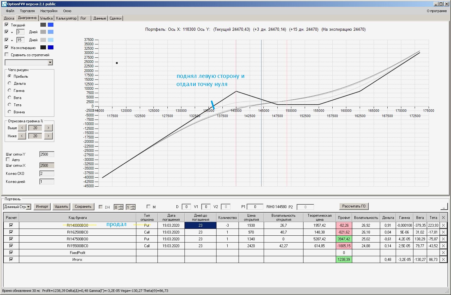 пытался проданный стренгл приподнять левый край покупкой путов, не получилось, получается приподнимать только проданными путами левее текущей цены, либо продавать колы правее от текущей цены.