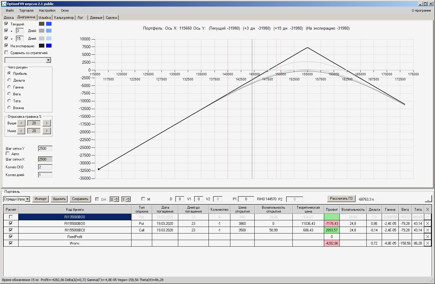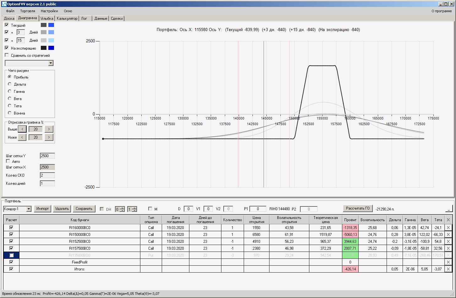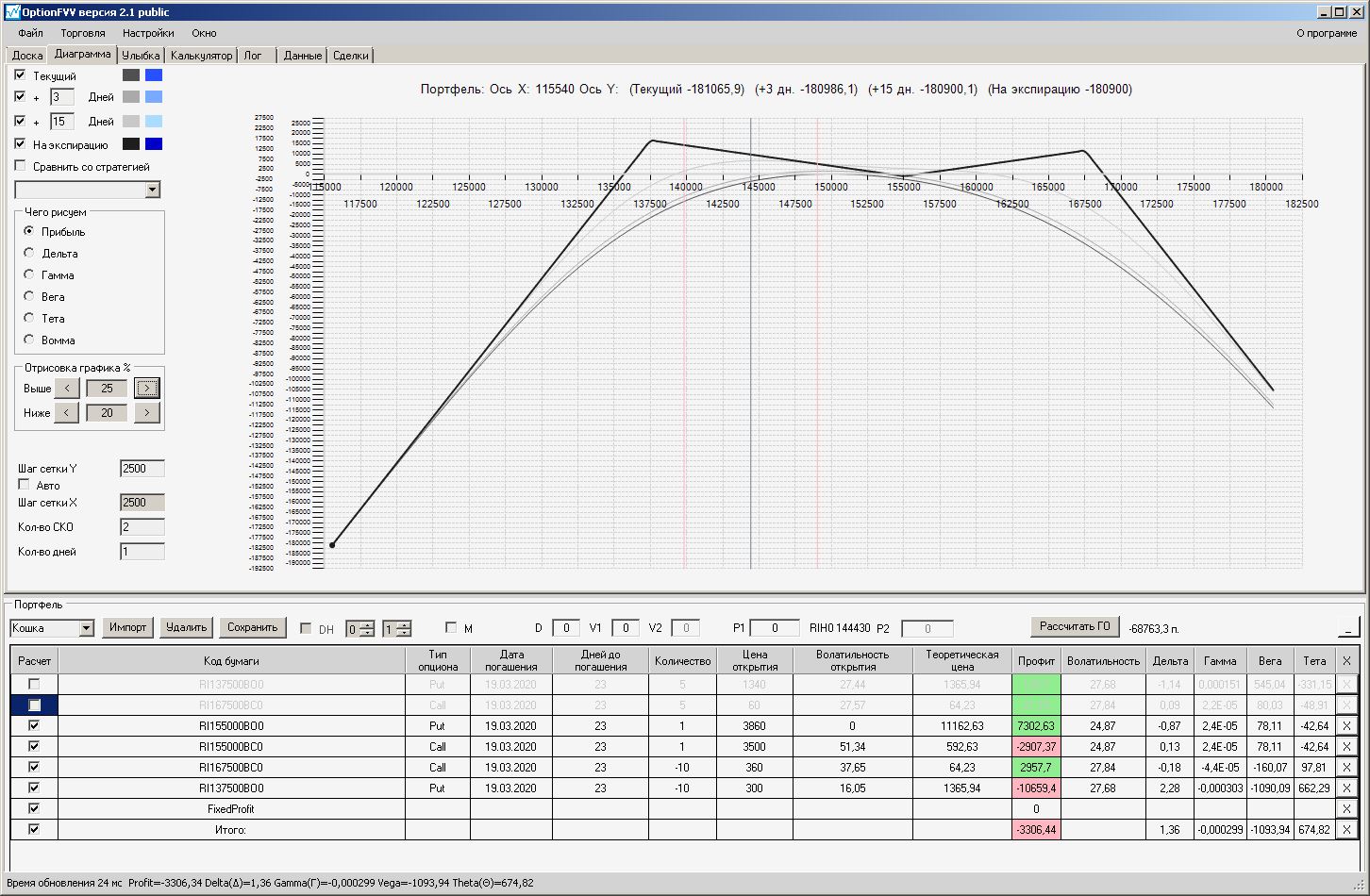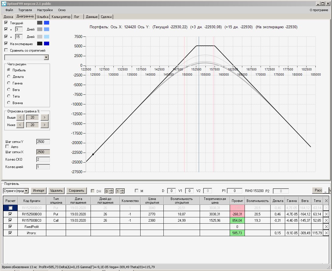 пытался проданный стренгл приподнять левый край покупкой путов, не получилось, получается приподнимать только проданными путами левее текущей цены, либо продавать колы правее от текущей цены.