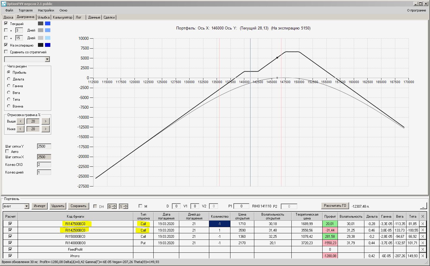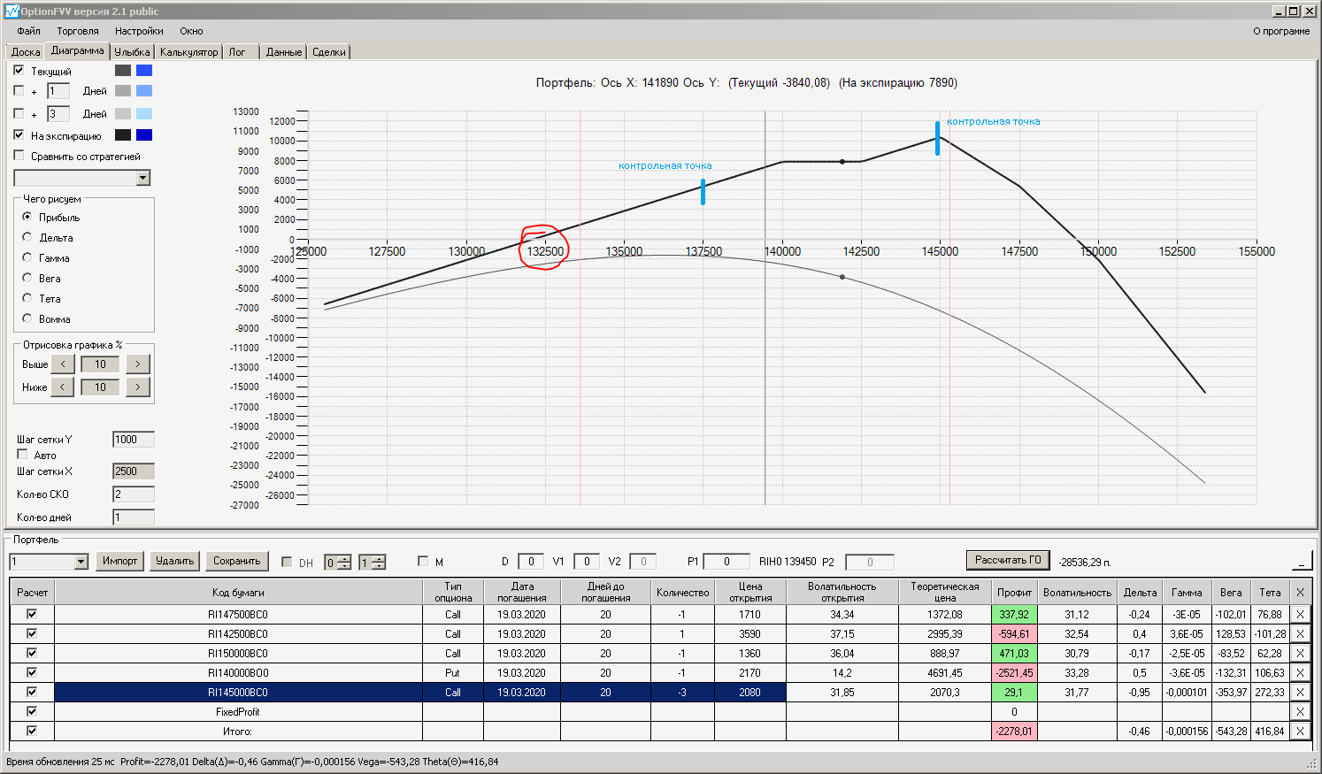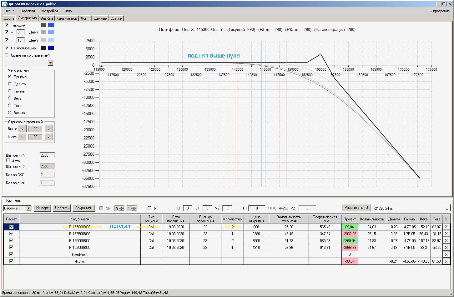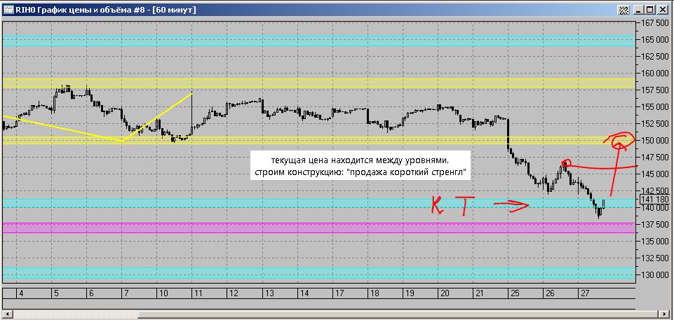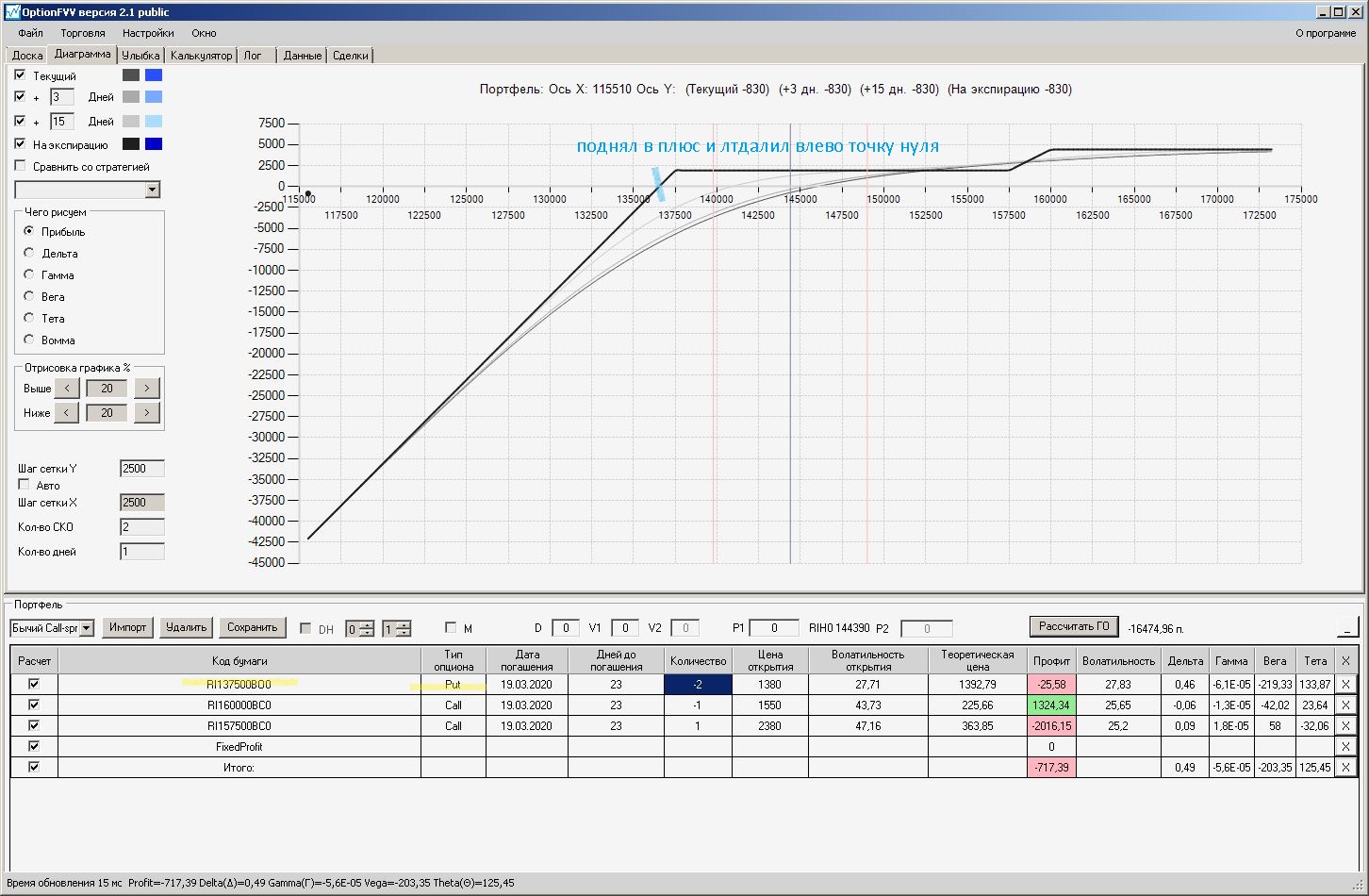 Сейчас цена в районе 140000. Начинаем "вмешиваться" в ОК (опционная конструкция) через 2500 пунктов.140000 - 2500 = 137500, 140000 + 2500 = 142500 (а не 145000). Если цена резко начнёт расти, то до "красивой" (плюсовой) части толстой линии на экспирацию мы можем не дойти. Или я не прав?