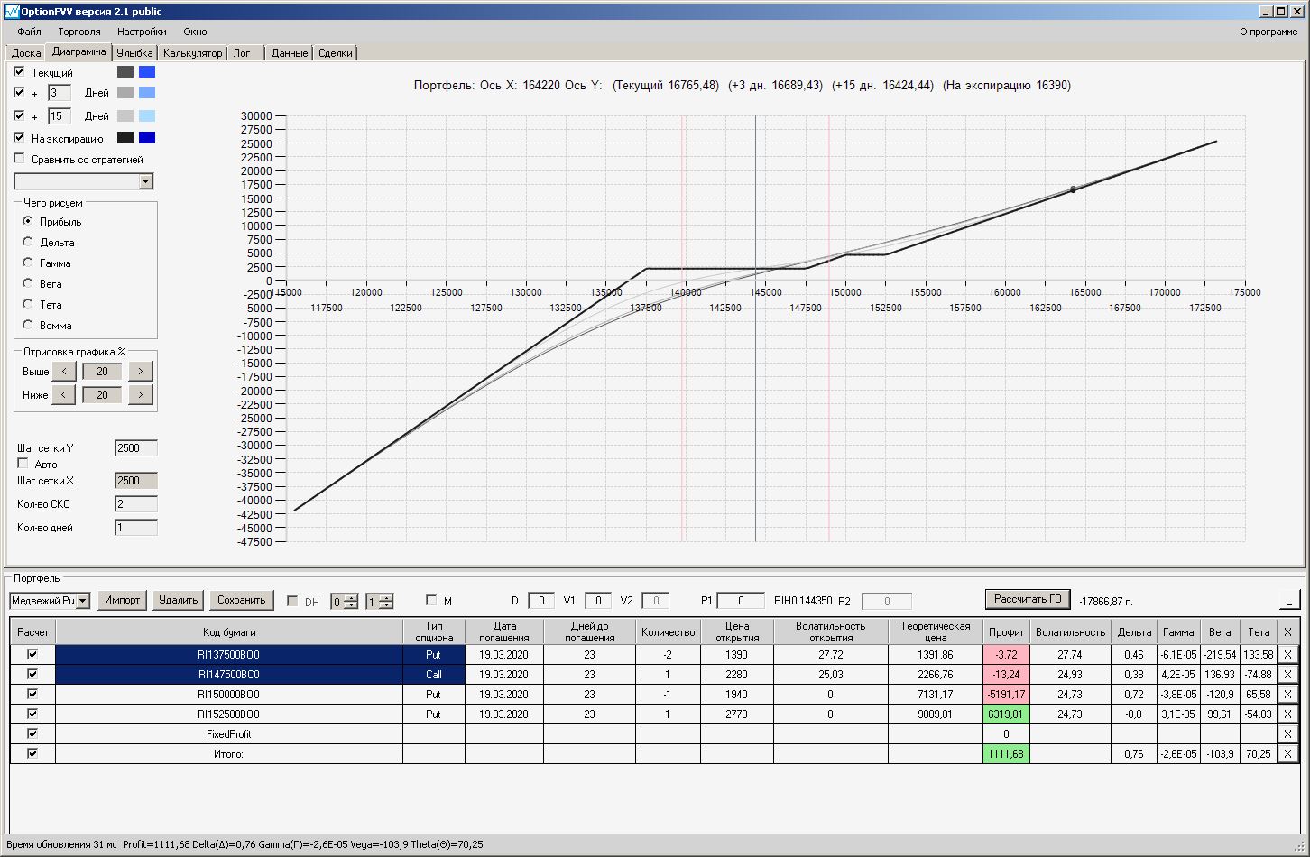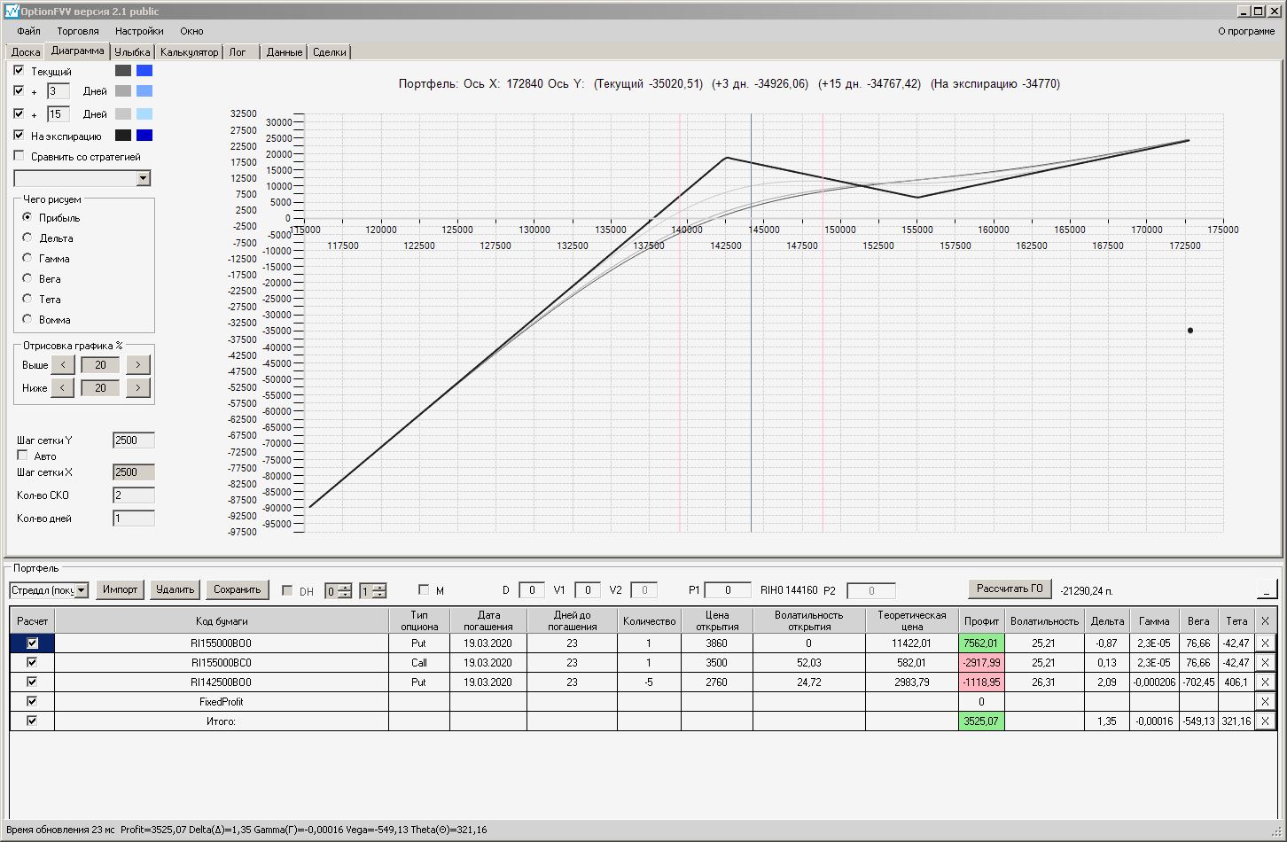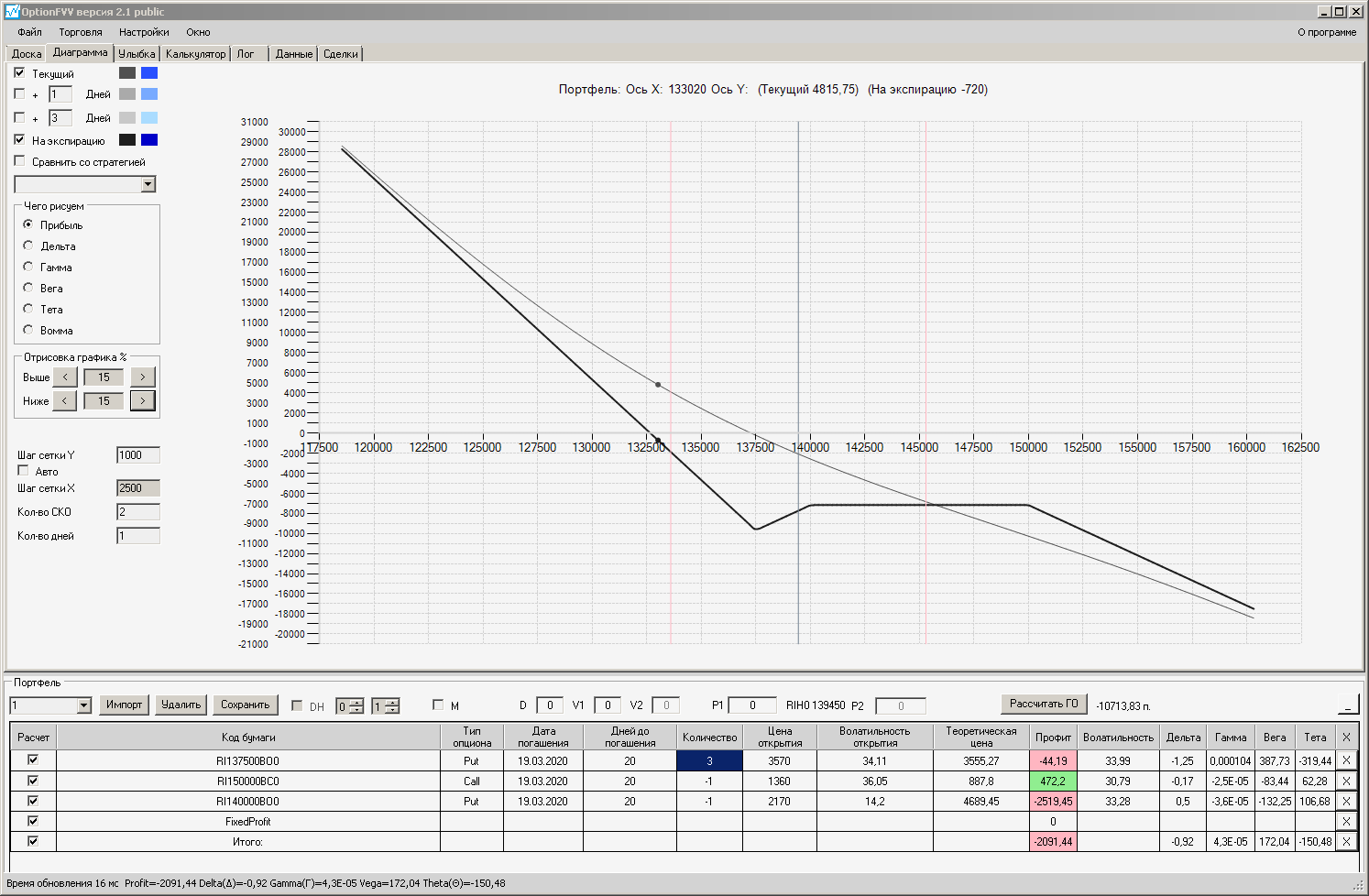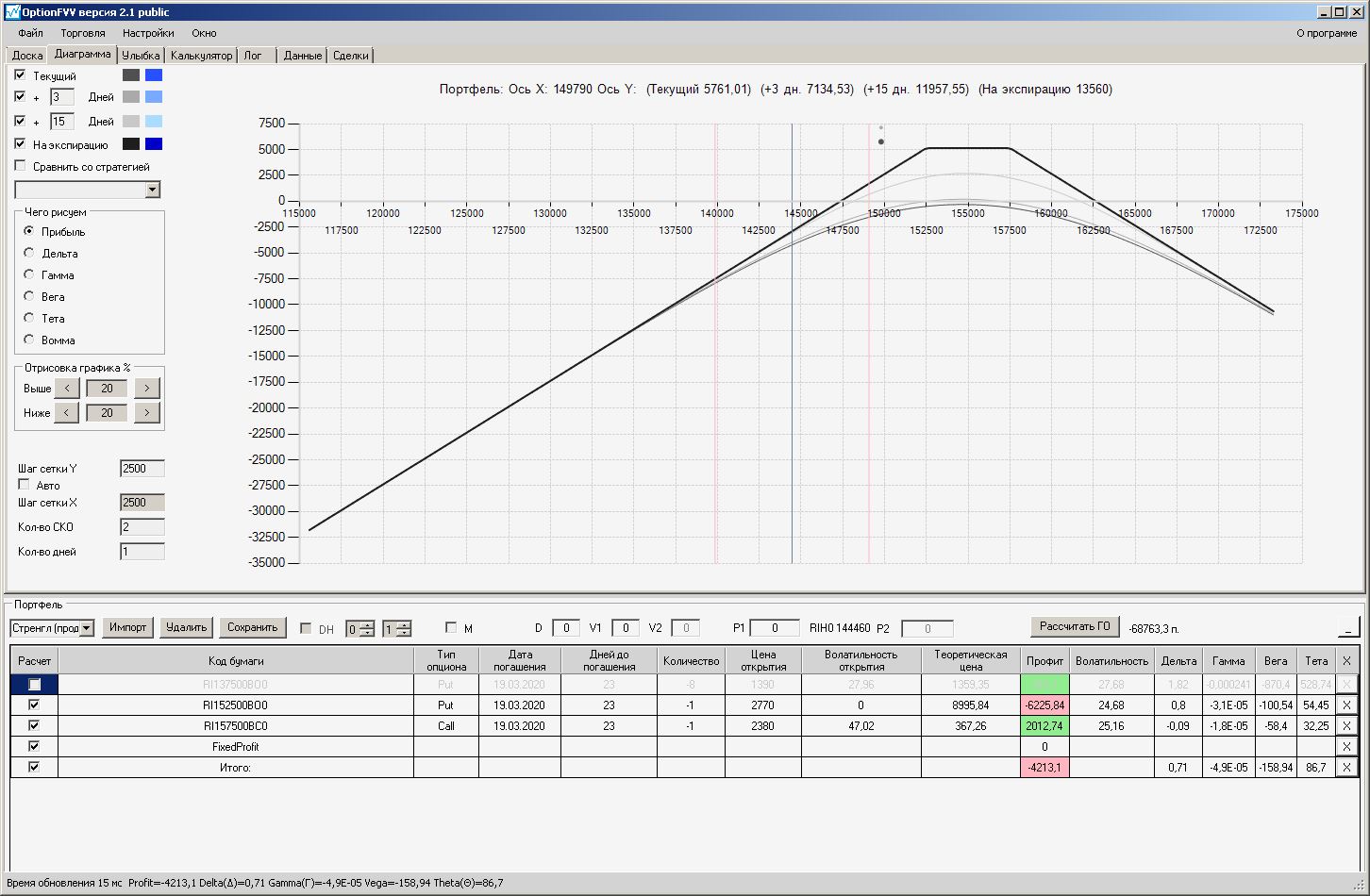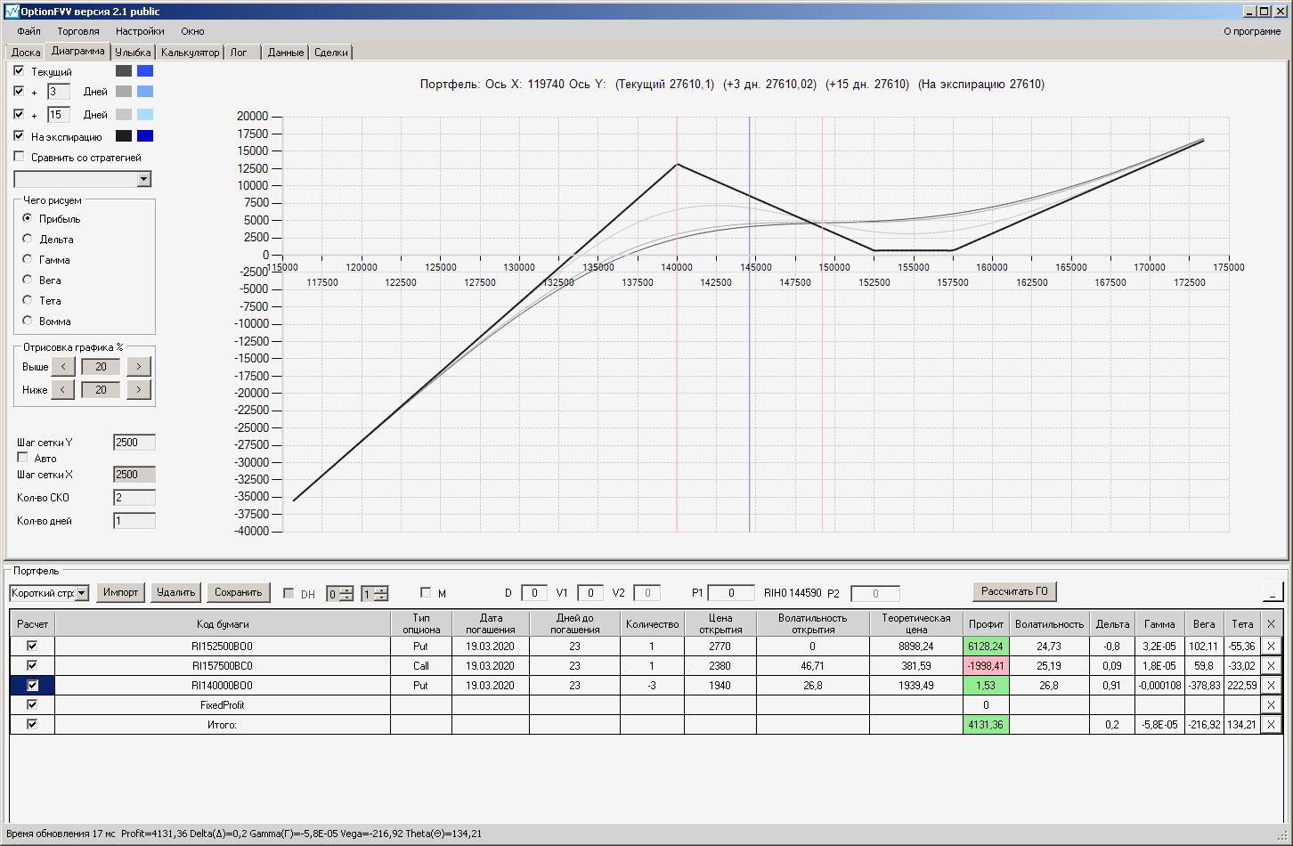 Сейчас цена в районе 140000. Начинаем "вмешиваться" в ОК (опционная конструкция) через 2500 пунктов.140000 - 2500 = 137500, 140000 + 2500 = 142500 (а не 145000). Если цена резко начнёт расти, то до "красивой" (плюсовой) части толстой линии на экспирацию мы можем не дойти. Или я не прав?