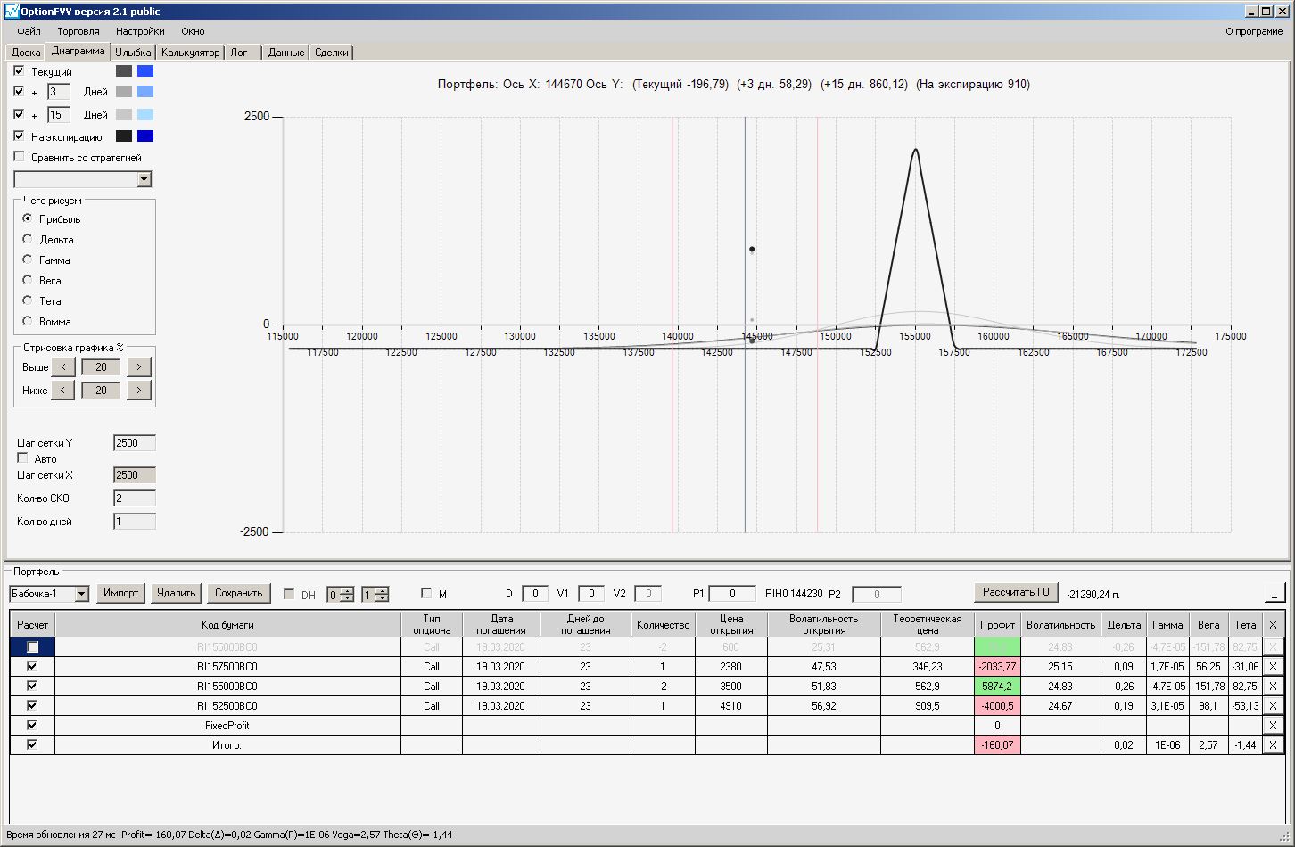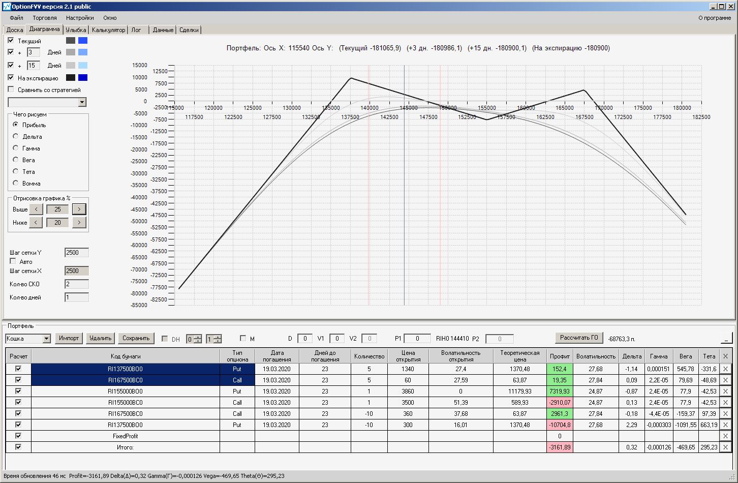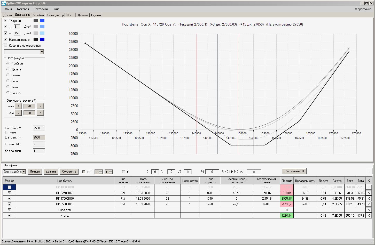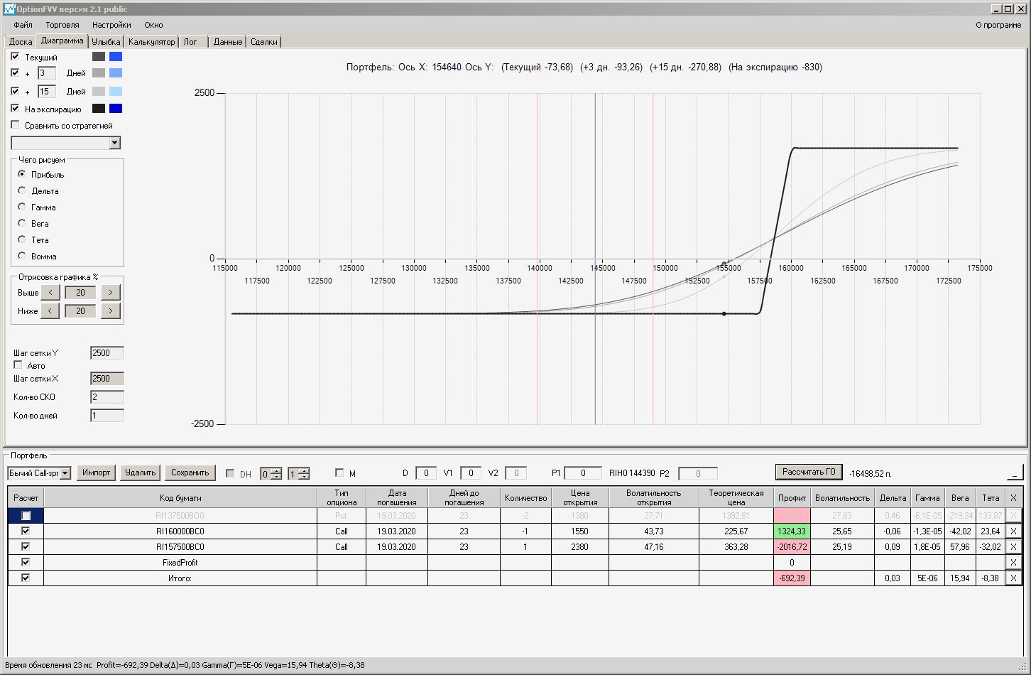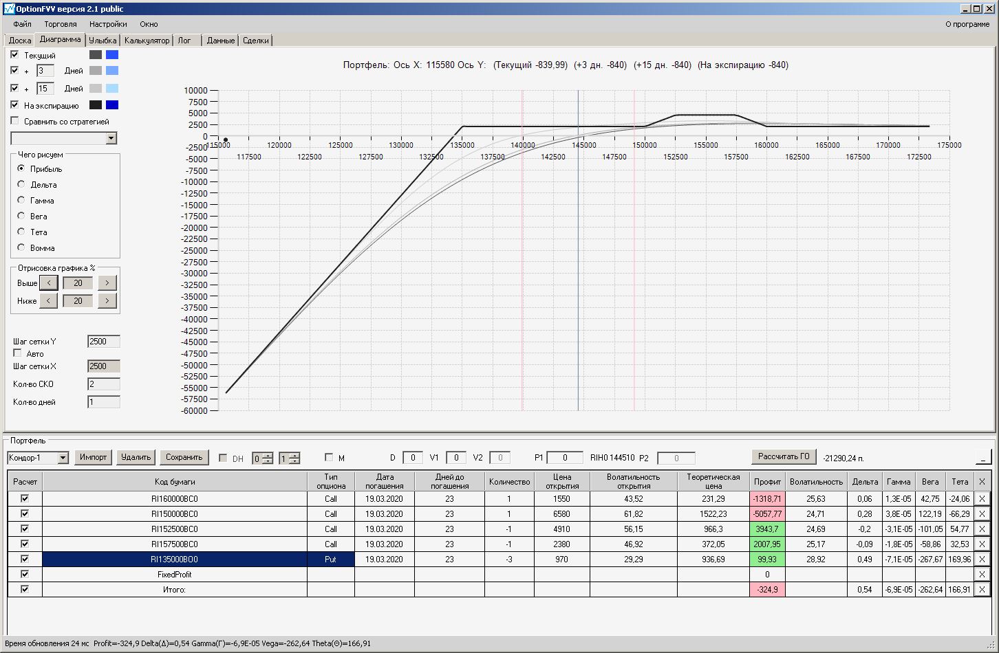 Сейчас цена в районе 140000. Начинаем "вмешиваться" в ОК (опционная конструкция) через 2500 пунктов.140000 - 2500 = 137500, 140000 + 2500 = 142500 (а не 145000). Если цена резко начнёт расти, то до "красивой" (плюсовой) части толстой линии на экспирацию мы можем не дойти. Или я не прав?