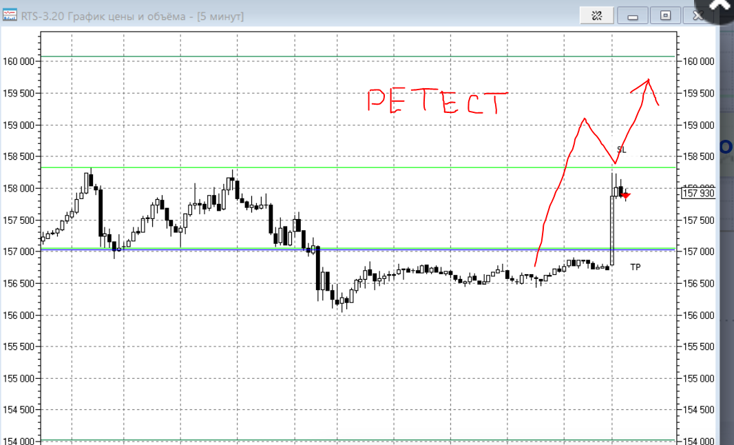 Вы торгуете второй отбой от уровня, внутри дня. Цель 156800. Хотя повода для сделки не было.