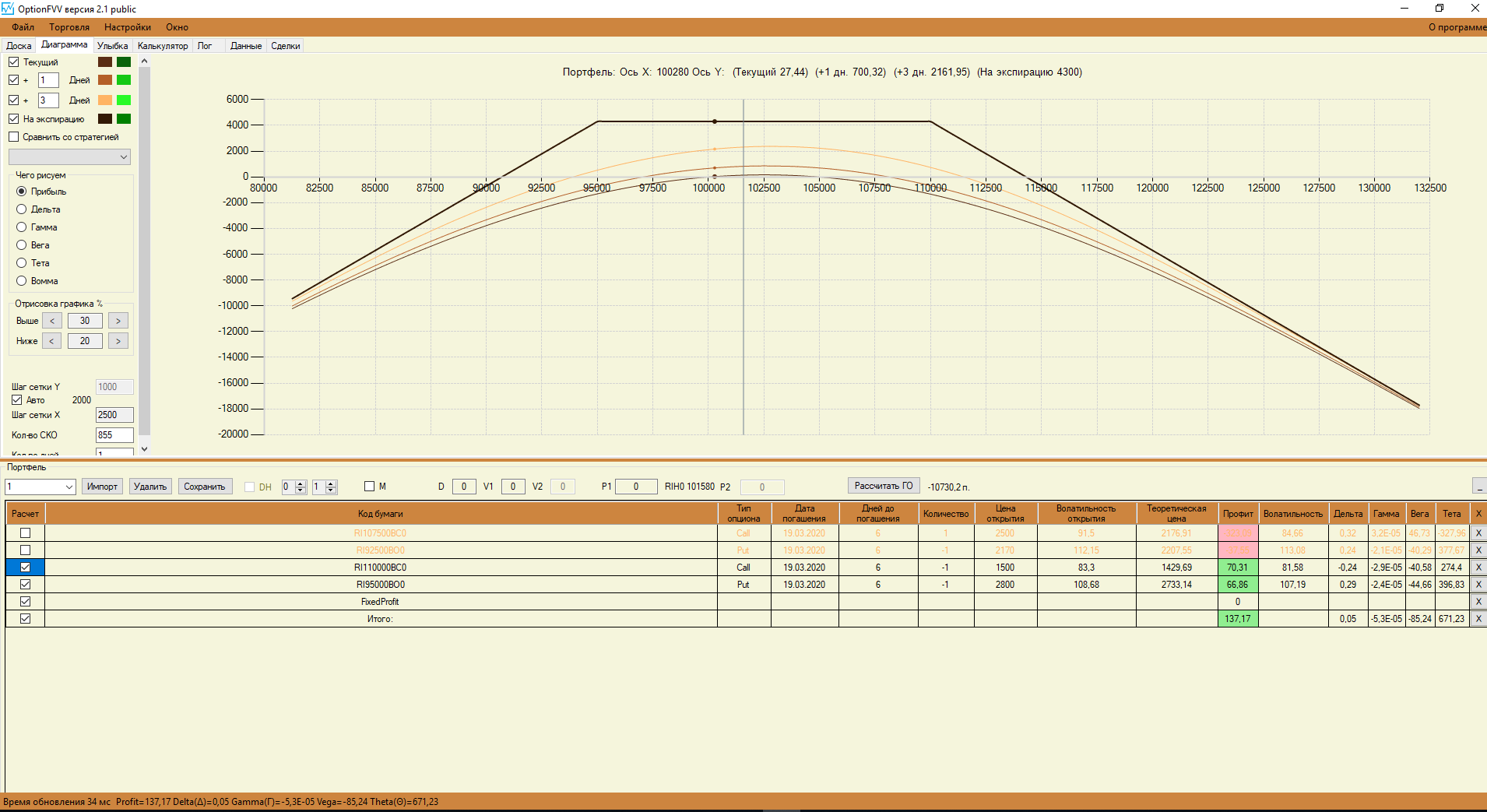 Если, например, вначале я купил 105 Пут сегодня, затем когда цена дошла до 102500, я купил 102 Пут, опустилась до 100000, я купил 100 Пут.