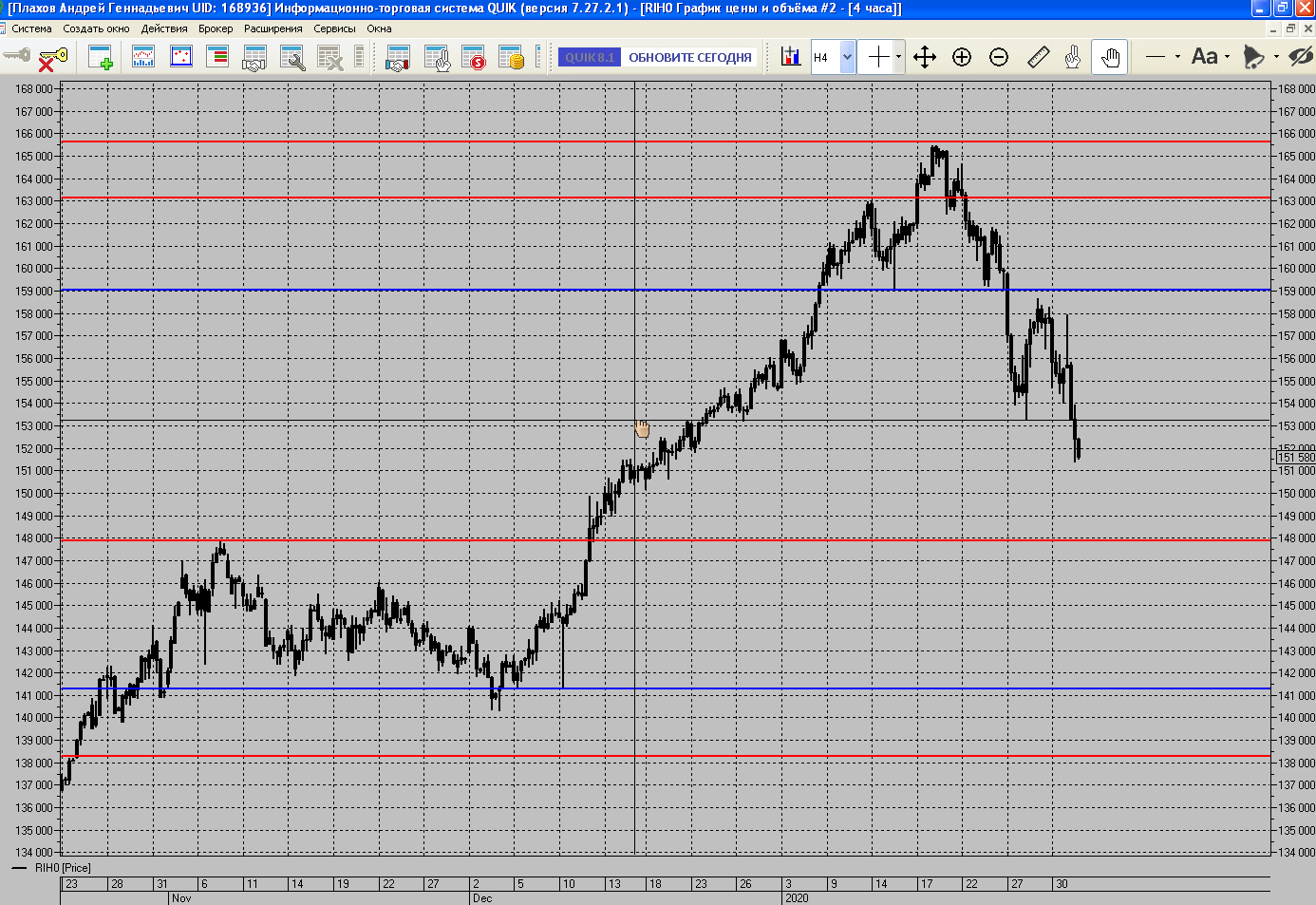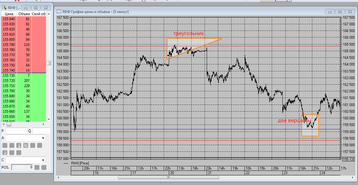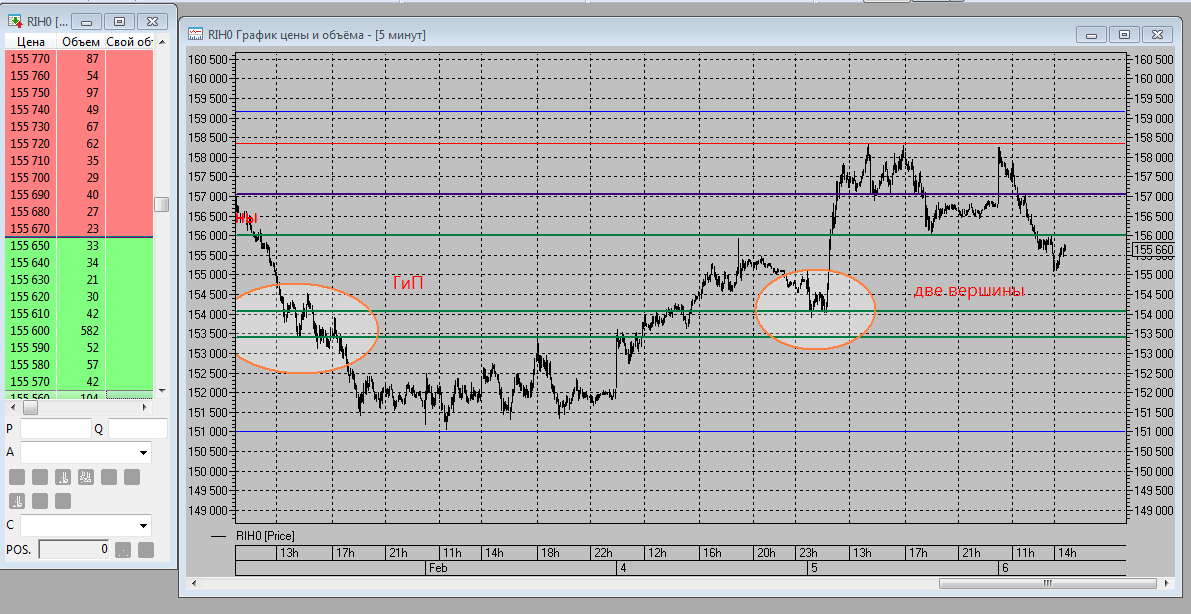 Андрей, на Вашем скрине 6 фигурой "Две вершины" цена скорректировалась. А фигура "ГиП" находится в боковике. Значит эти фигуры не рассматриваем при анализе. По правилам, цена должна подойти к фигуре сверху/ снизу, развернуться на ней и пойти в другую сторону, если это разворотная фигура (ГиП, НР, Д/Т вершина).