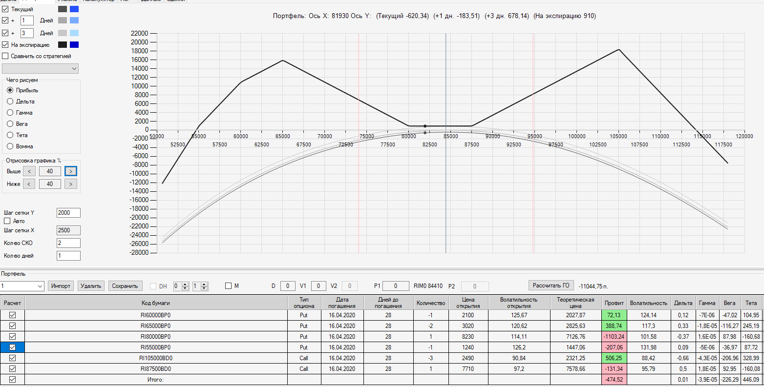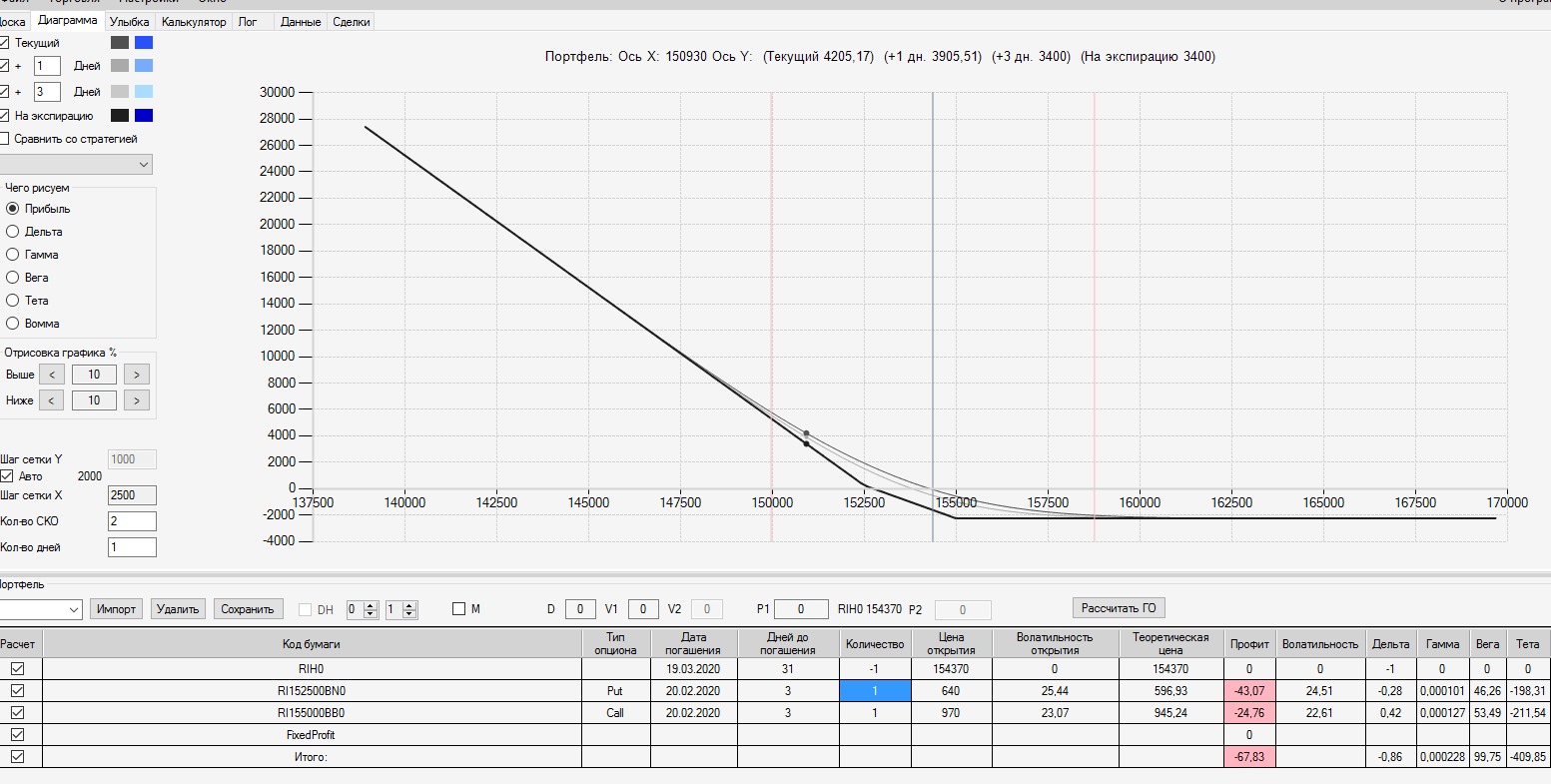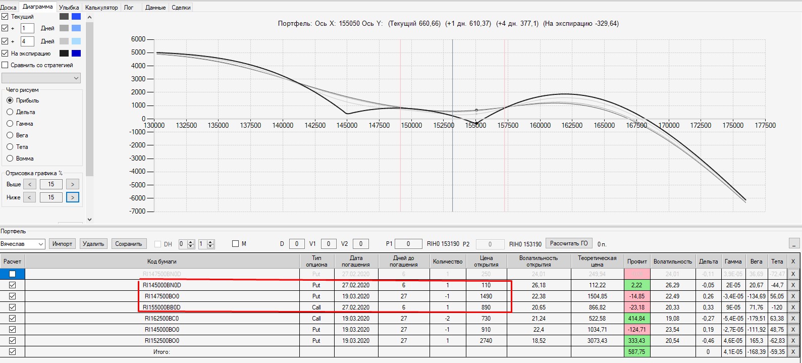 В общем добавил в нее КОЛЛ 27.02, чтобы поднять правую часть, продал 145-й ПУТ 19.03, чтобы поднять правую часть конструкции и добавил дальних дешевых ПУТов 27.02, чтобы профиль в левой части наверх шел. В итоге получился тоже не плохой вариант. Сохраняется рост прибыли при падении РТС, при этом и правая часть выглядит достойно.
