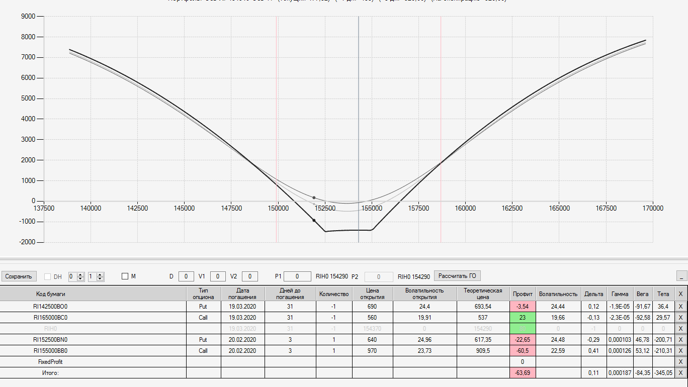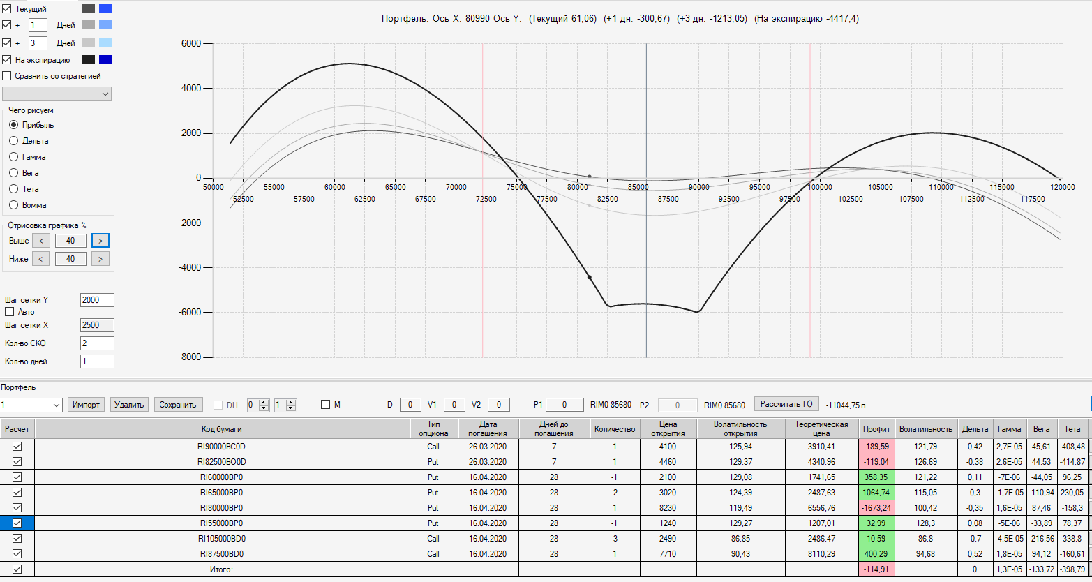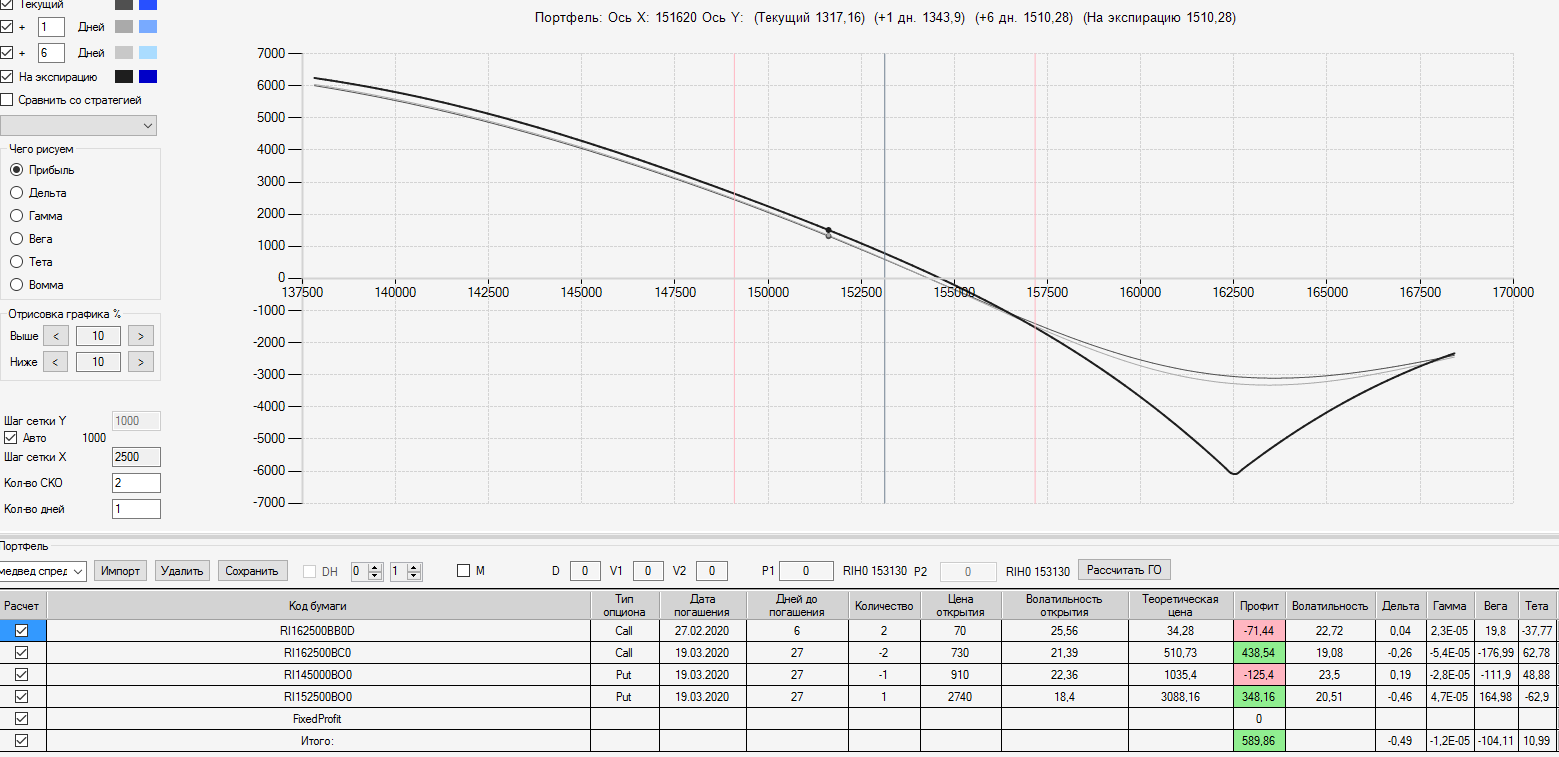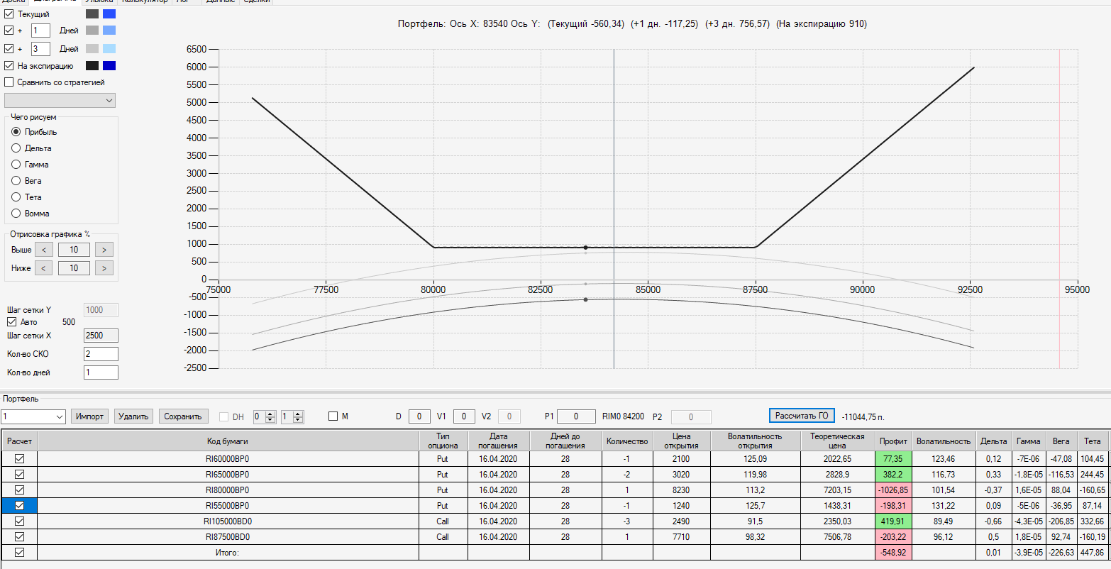 В общем добавил в нее КОЛЛ 27.02, чтобы поднять правую часть, продал 145-й ПУТ 19.03, чтобы поднять правую часть конструкции и добавил дальних дешевых ПУТов 27.02, чтобы профиль в левой части наверх шел. В итоге получился тоже не плохой вариант. Сохраняется рост прибыли при падении РТС, при этом и правая часть выглядит достойно.