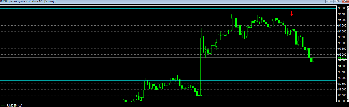 Продажа фьюча 94800 - причина 3 вершины - цель 91500 - выбило в б\у свечой со стрелкой