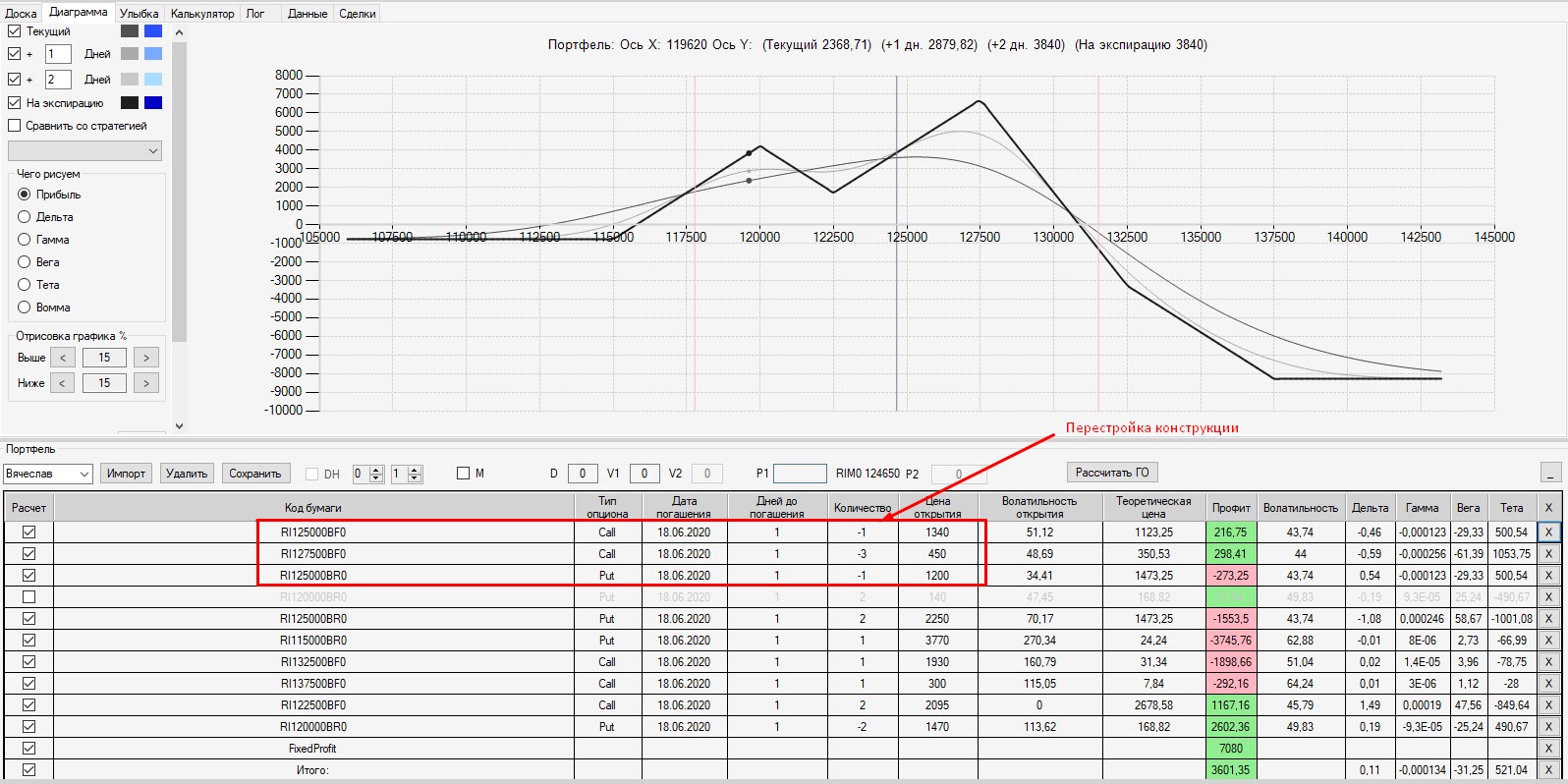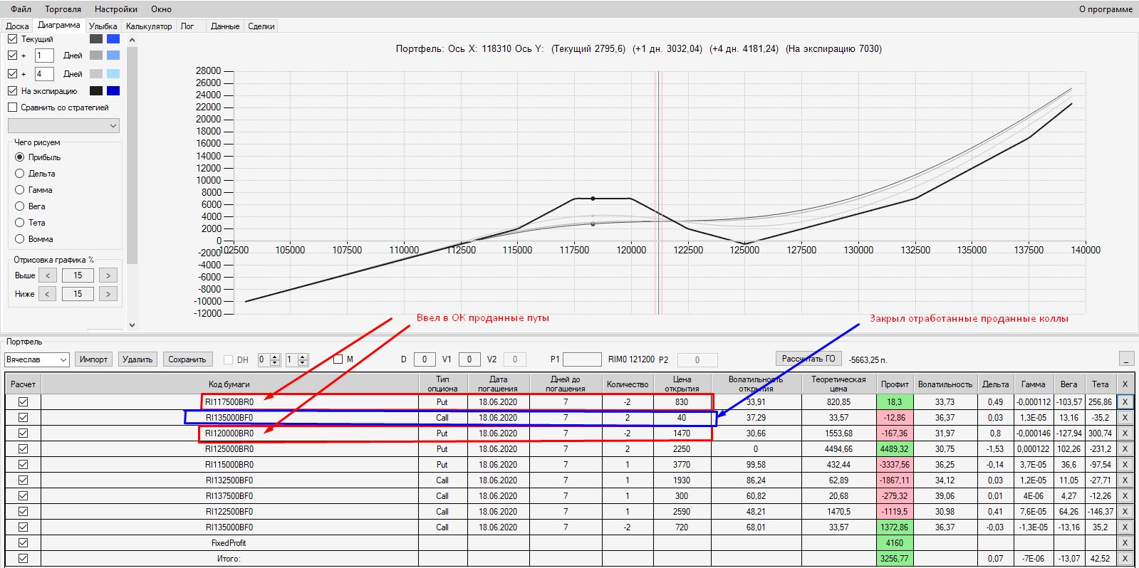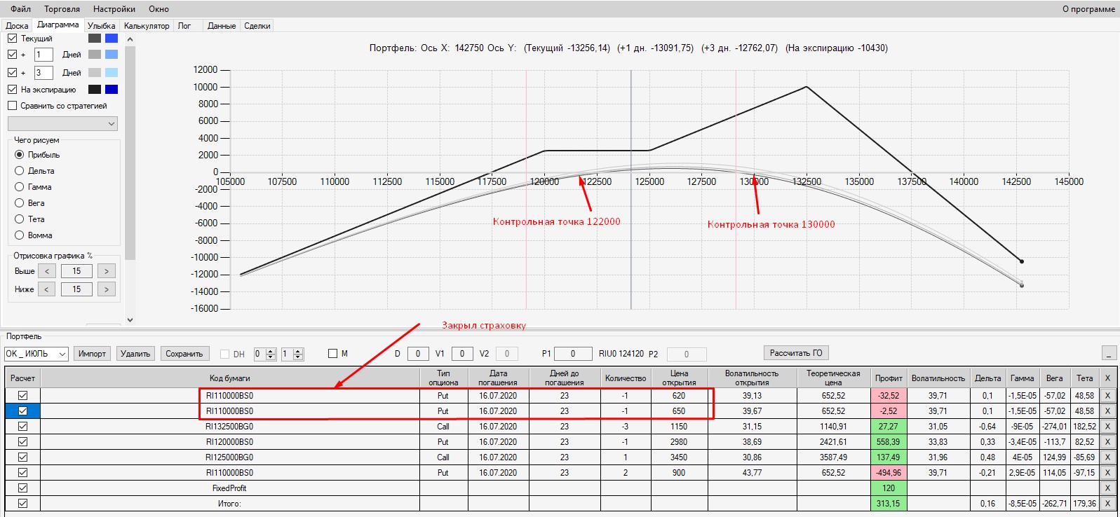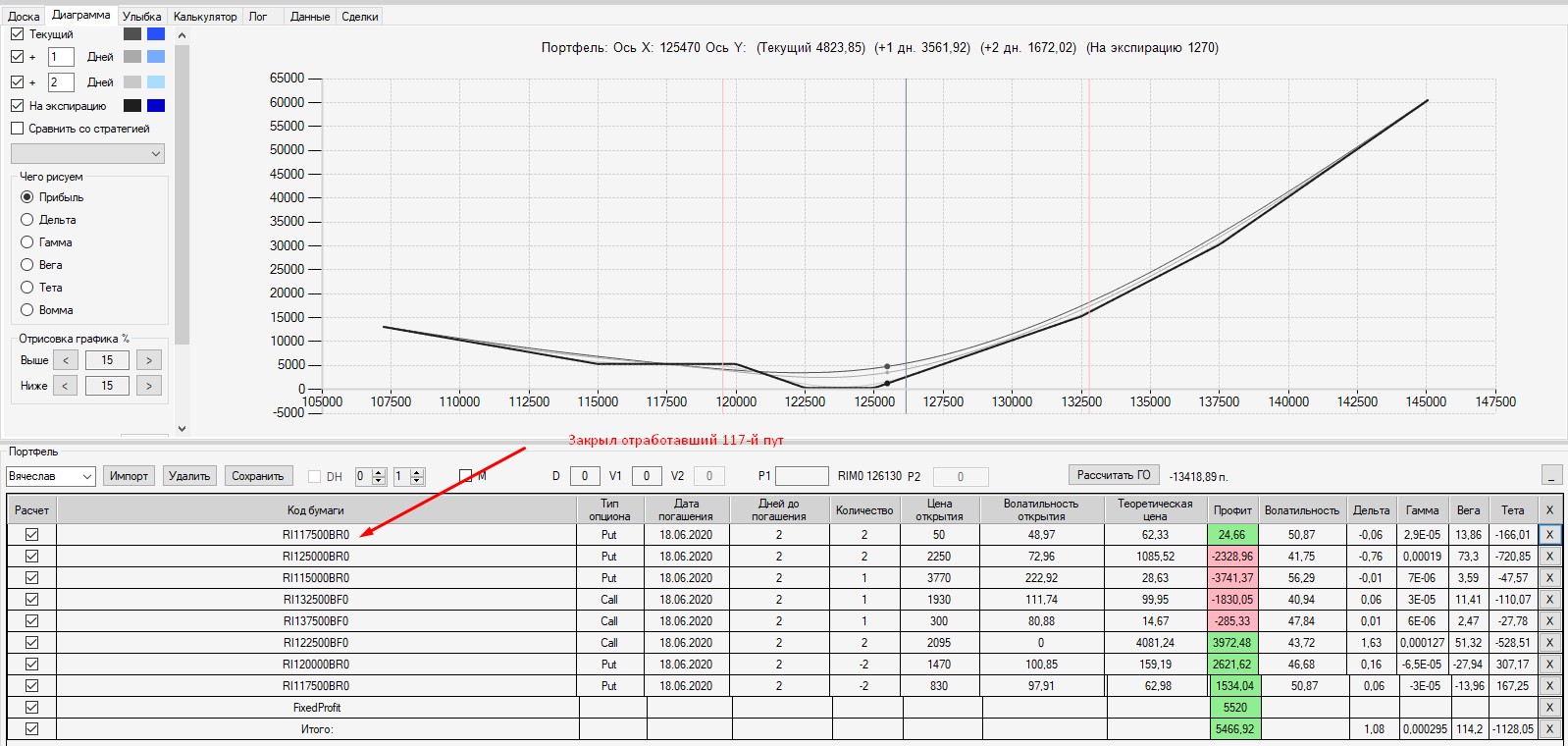 Если Вы собрали конструкцию, а потом с течением времени хотите закрыть какой-то из опционов из состава конструкции, то ОБЯЗАТЕЛЬНО нужно в аналитике этот опцион откупить (если он был изначально продан) или продать (если он был куплен), а затем сохранить данную сделку в аналитике. При нажатии на наименование портфеля (слева в аналитике), результат данной сделки (прибыль или убыток) будет отображен (учтен) в строке Fixed Profit.