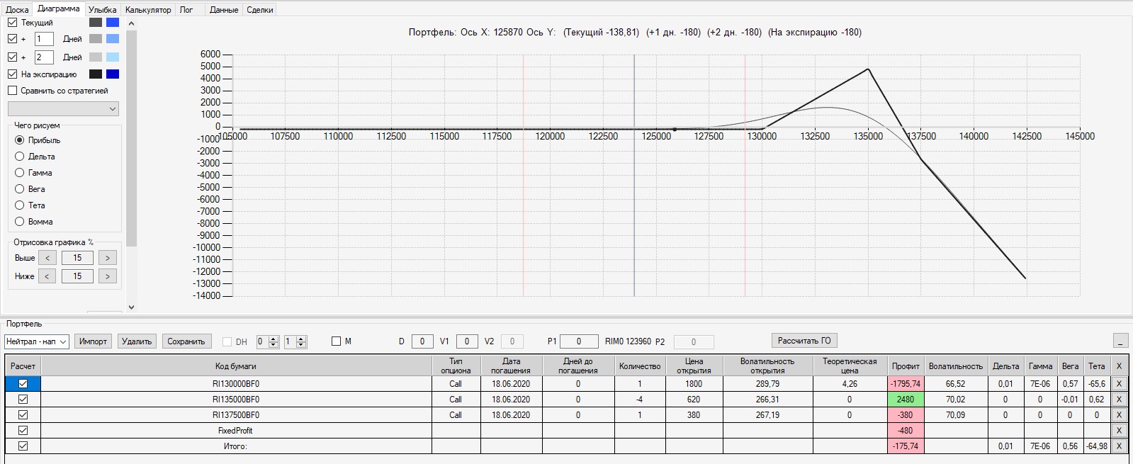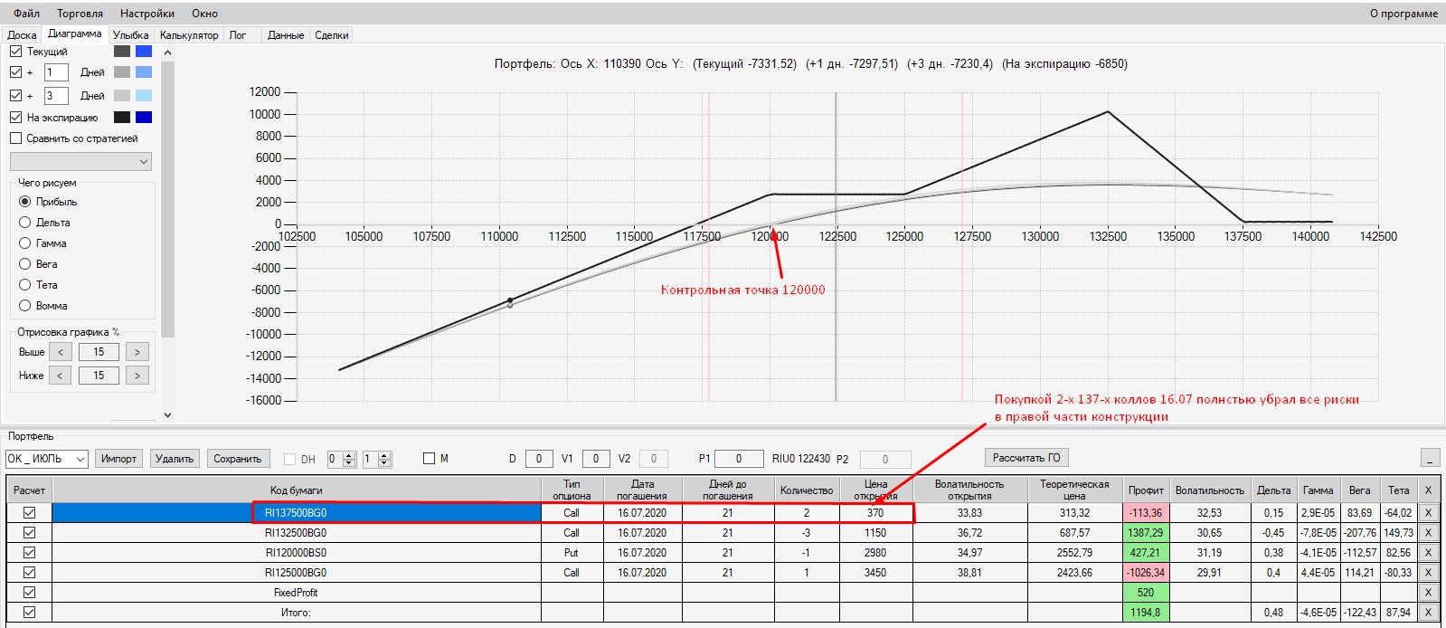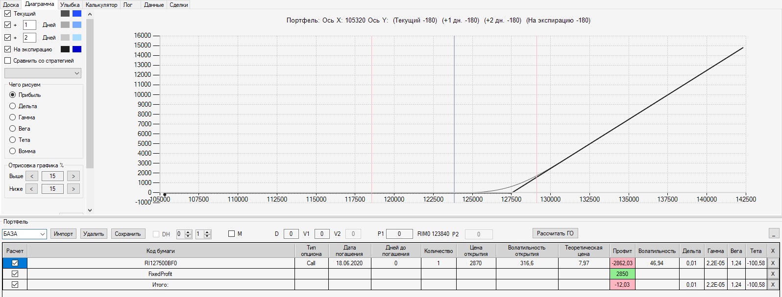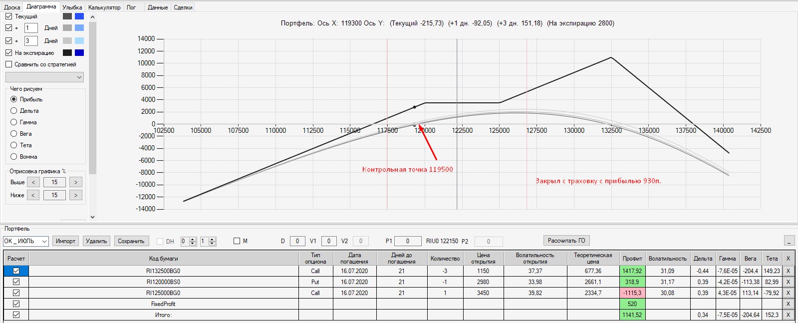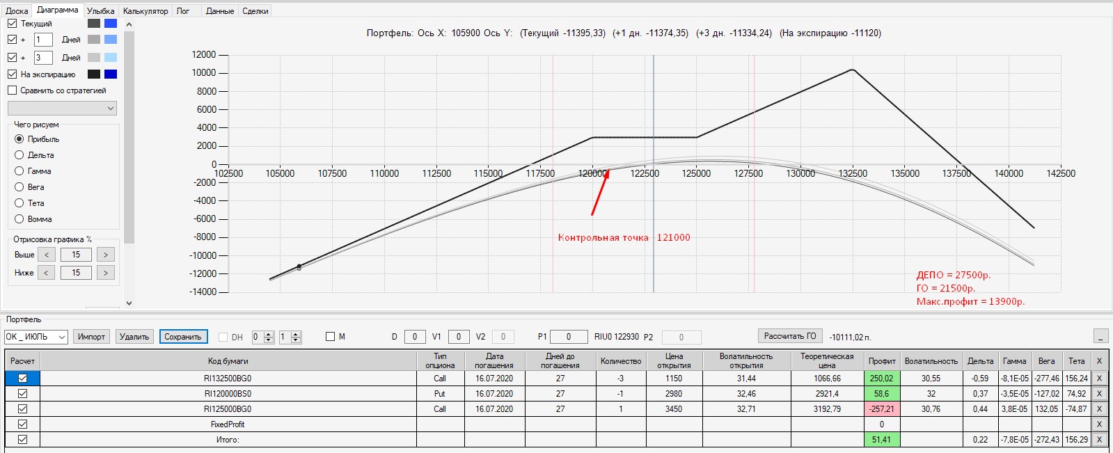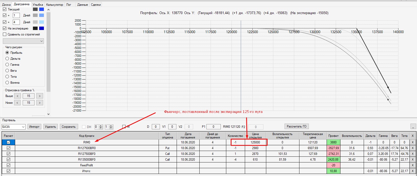 Интересно, что если выходить на экспмрацию 125-м путом, то в конструкцию был бы поставлен фьючерс в шорт по цене 125000. В этом случае сейчас по конструкции был бы околонулевой результат (зона безубытка). Поэтому, в данной конструкции было бы выгодно выходить на экспирацию.