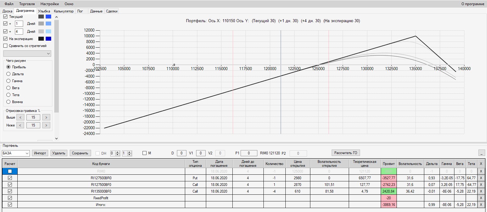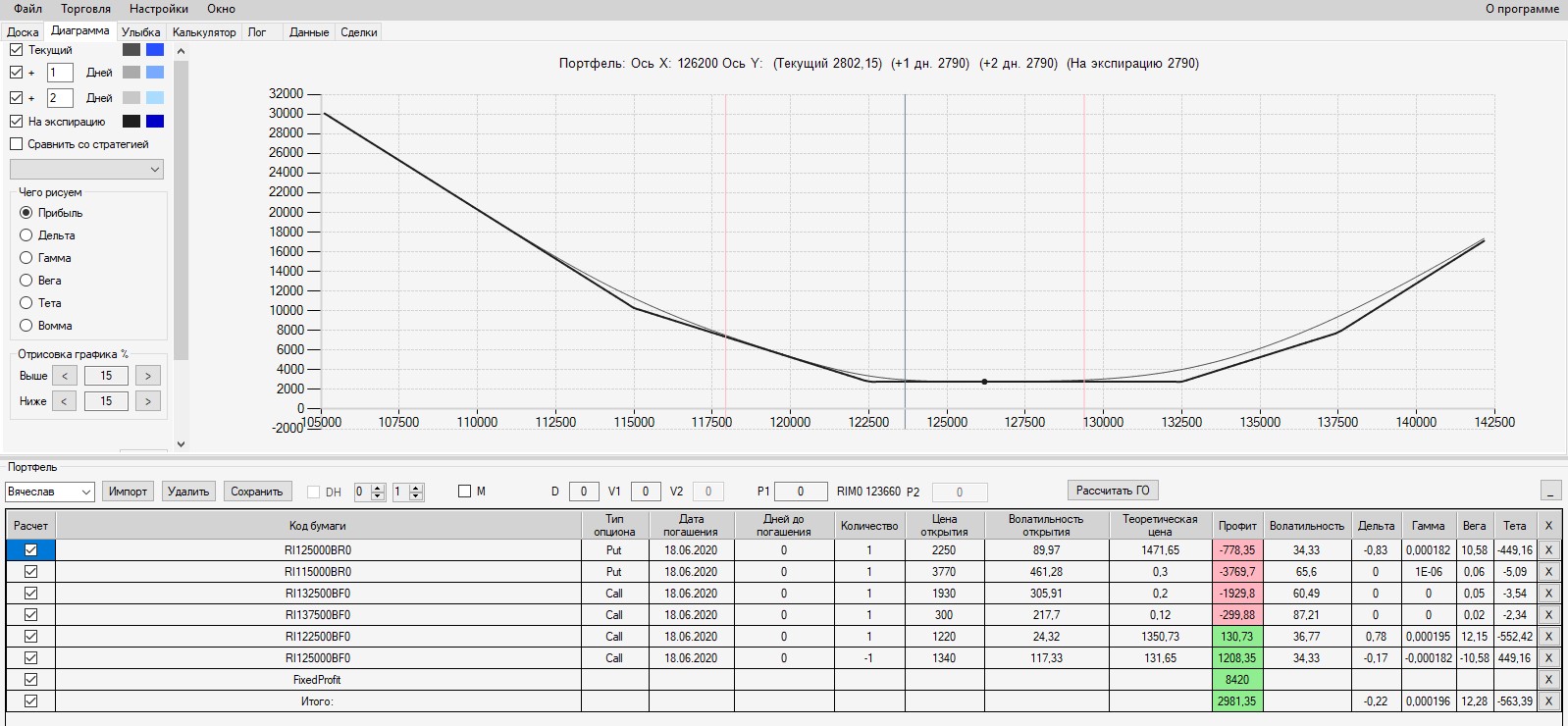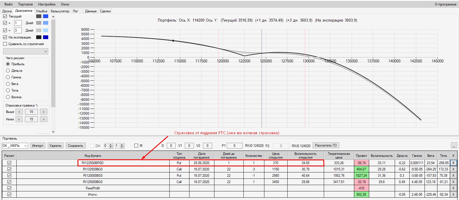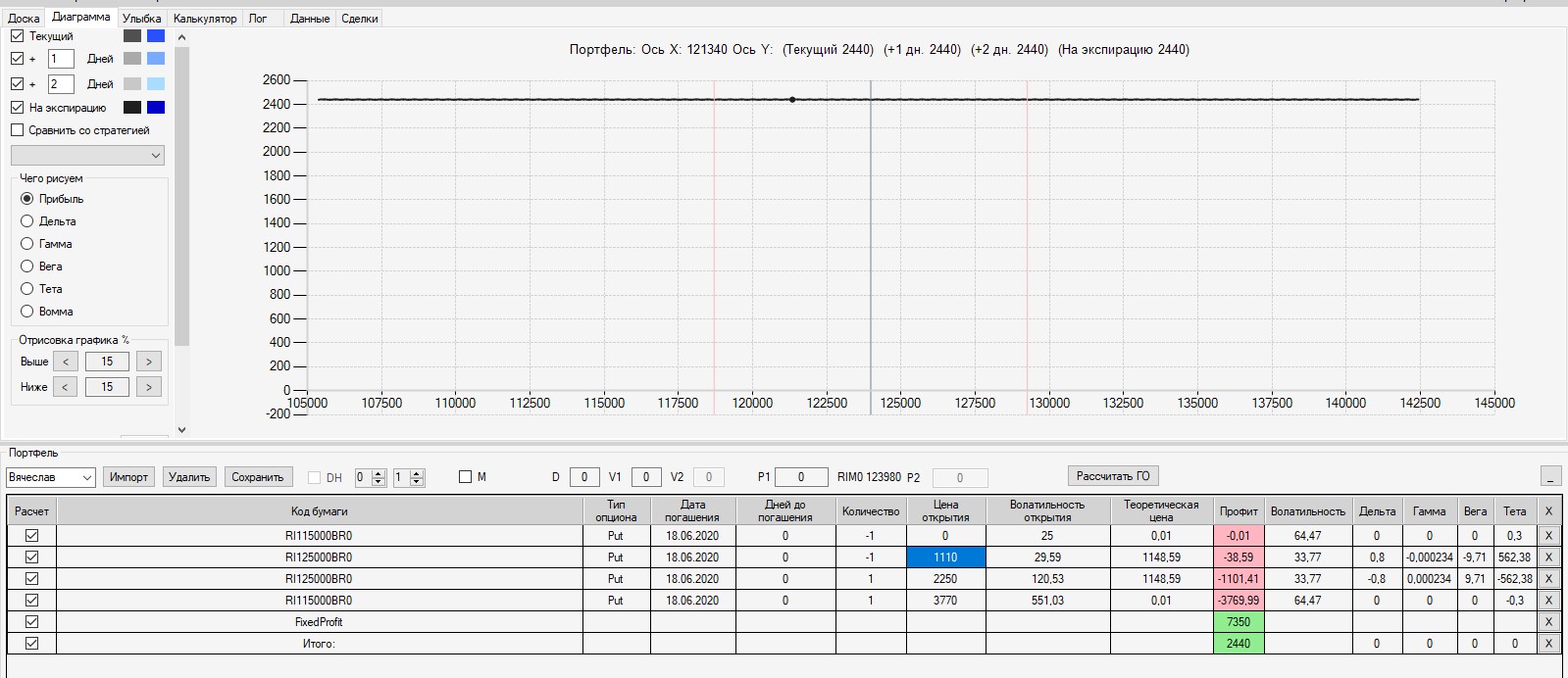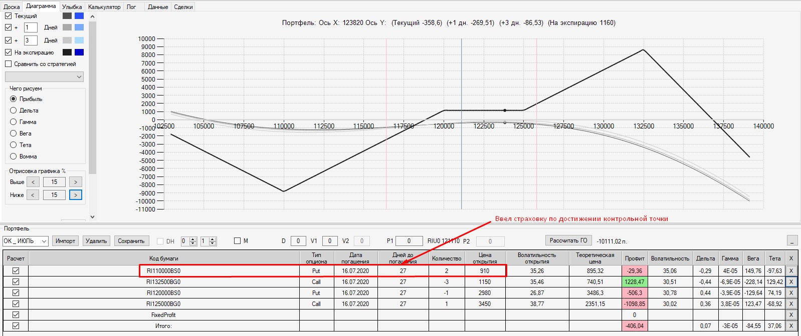 Интересно, что если выходить на экспмрацию 125-м путом, то в конструкцию был бы поставлен фьючерс в шорт по цене 125000. В этом случае сейчас по конструкции был бы околонулевой результат (зона безубытка). Поэтому, в данной конструкции было бы выгодно выходить на экспирацию.
