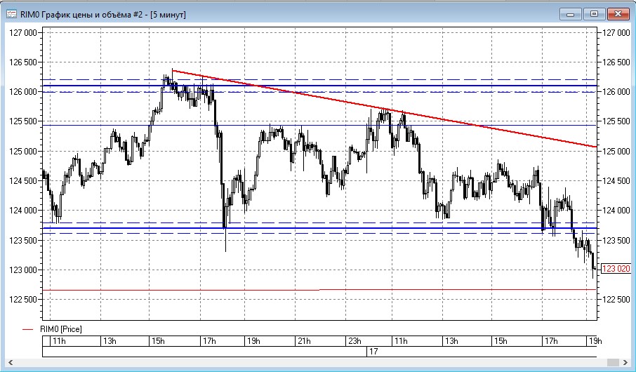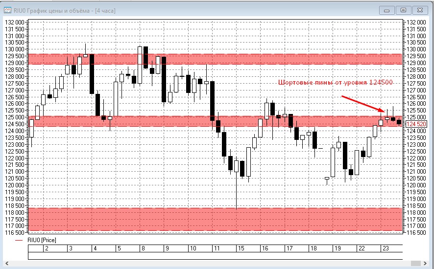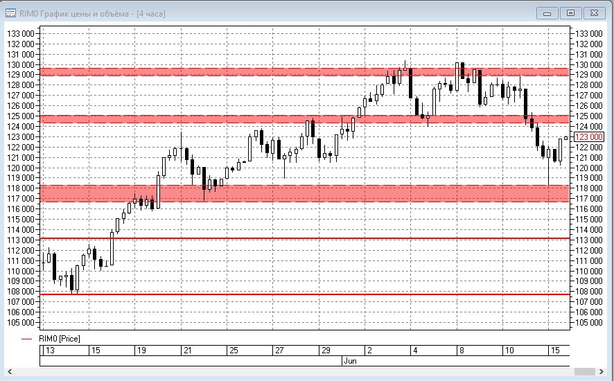 Вчера на вечерке на Н4 отрисовалось два шортовых пинбара от уровня 124500. Чтобы подстраховать себя от падения РТС ввел страховку 122-м путом экспирации 25.06 (он стоит всего 370п и при этом хорошо смотрится в качестве страховки).