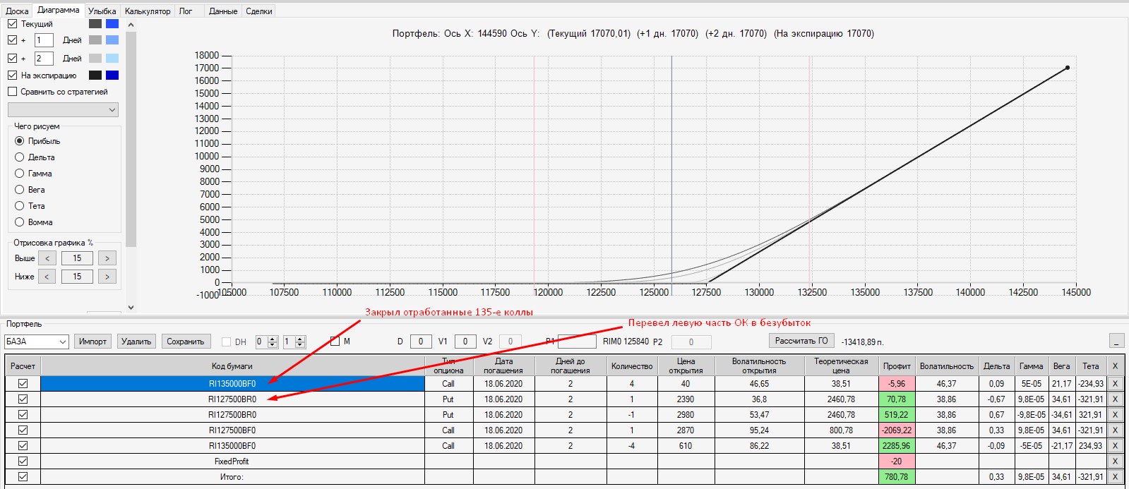 После выхода РТС выше 125000 (точка ноля для конструкции) ввел в ОК 127-й пут (перевел левую часть ОК в безубыток) и закрыл отработавшие 135-е коллы. в итоге конструкция преобразовалась в безрисковый колл