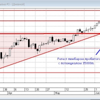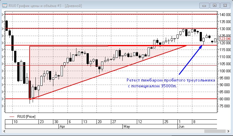 По РТС на ТФ 1 день пару дней назад случился ретест ранее пробитого лонгового треугольника с потенциалом 35000п. Ретестовая свеча - пинбар. Т.о. приоритетное направление - лонг.