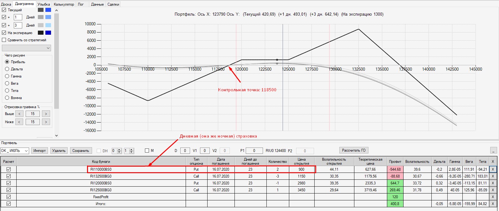 Всего суммарно за 740п. полностью убрал риск с правой стороны конструкции. Кроме того, при росте РТС конструкция будет более динамично набирать профит.