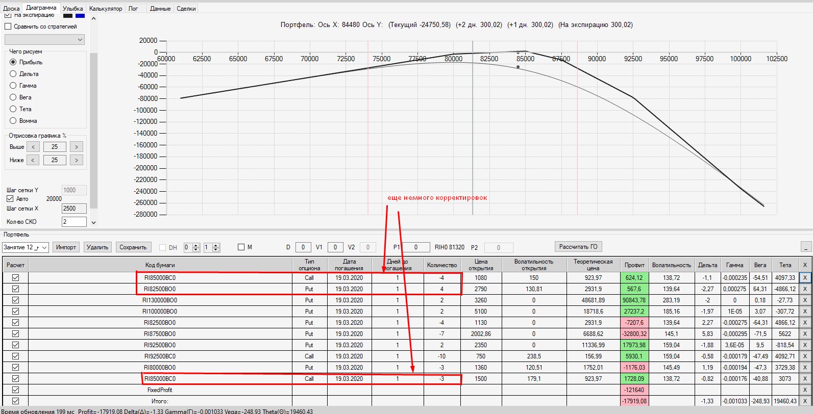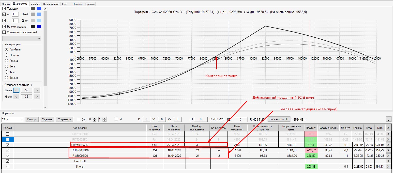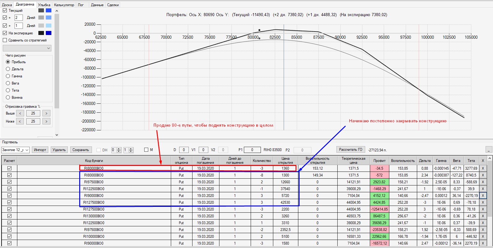 При этом, поскольку сейчас бешенная волатильность, в колл-спред внедряю проданный колл 23.03. в расчете на его распад за ближайшие 4 дня