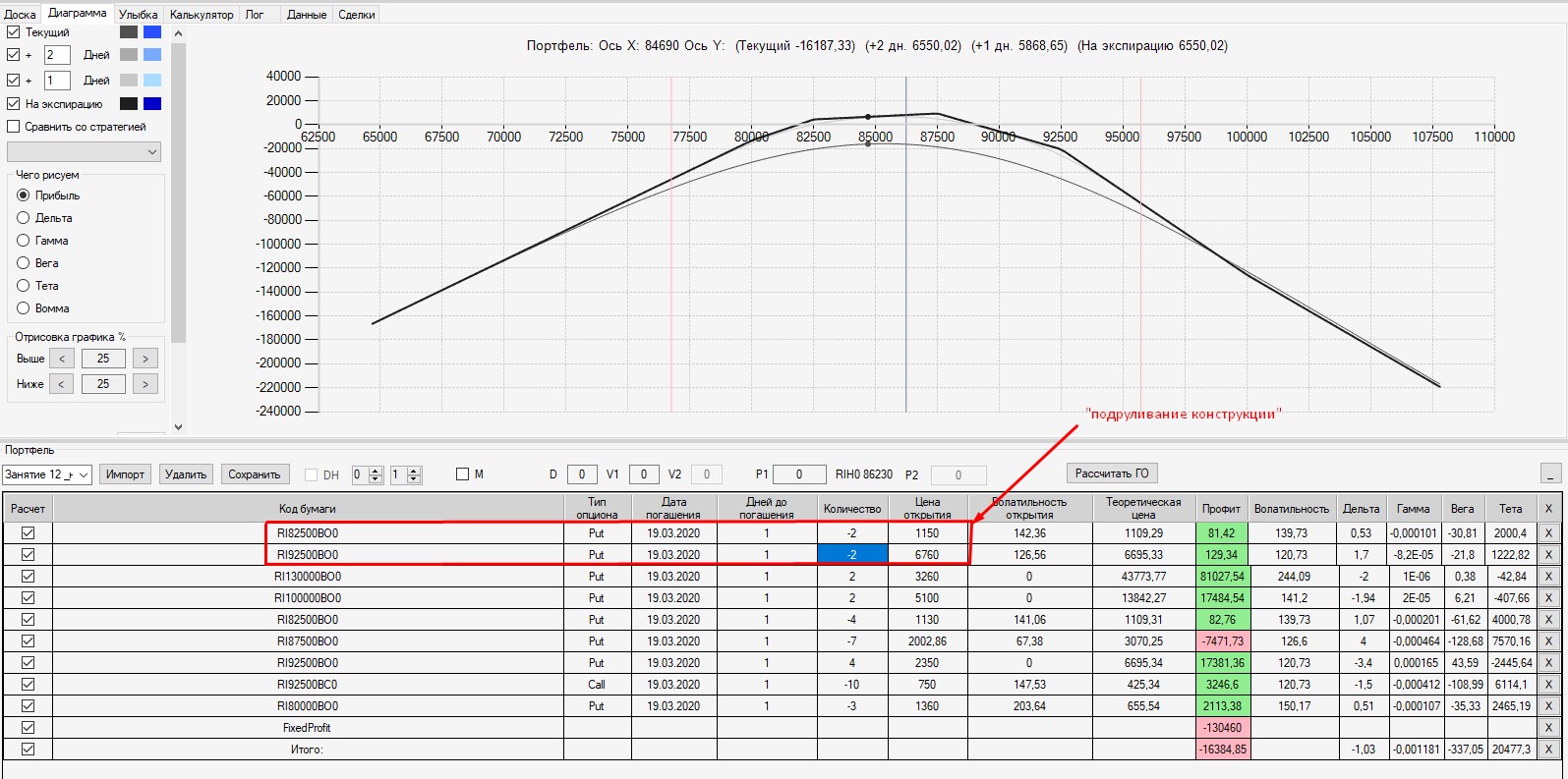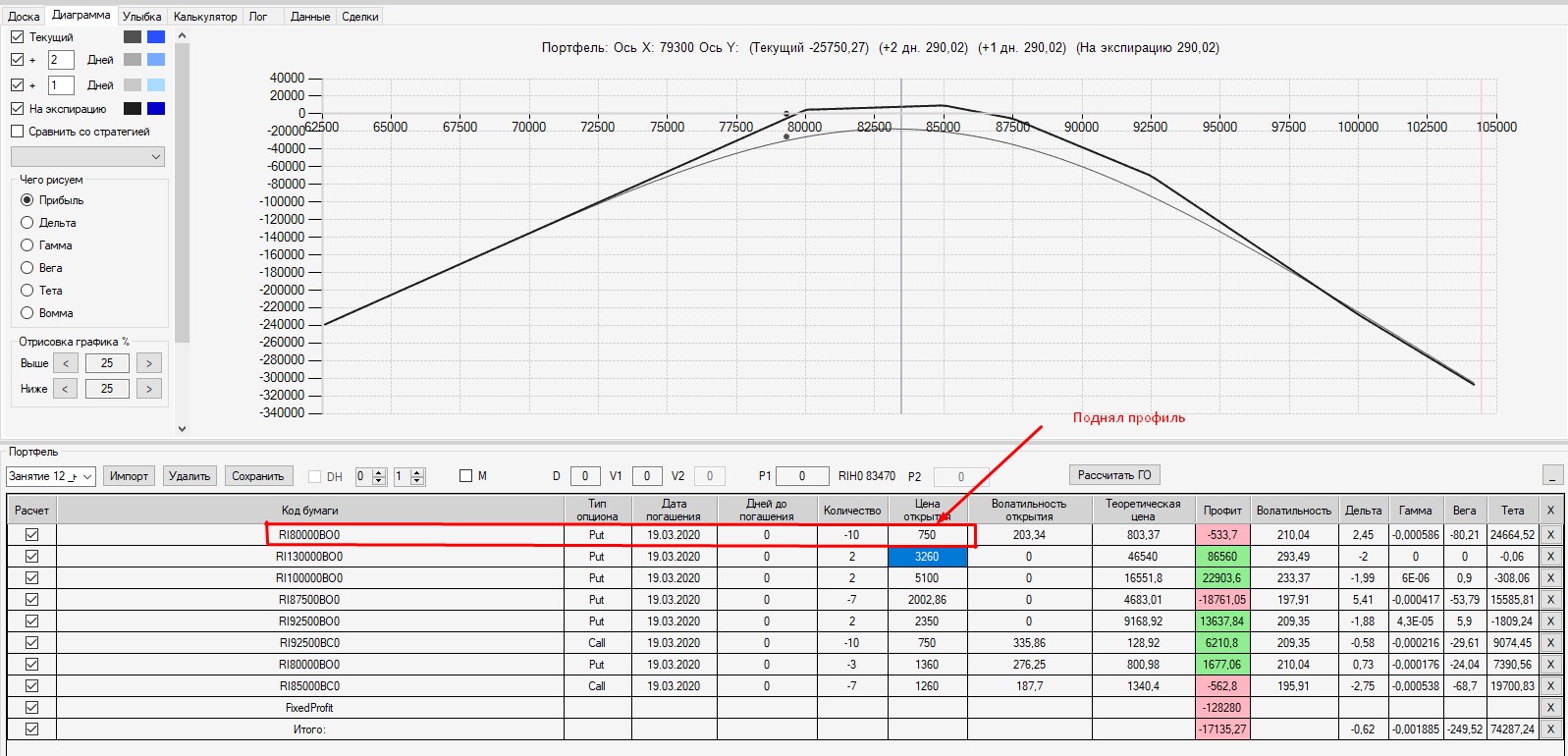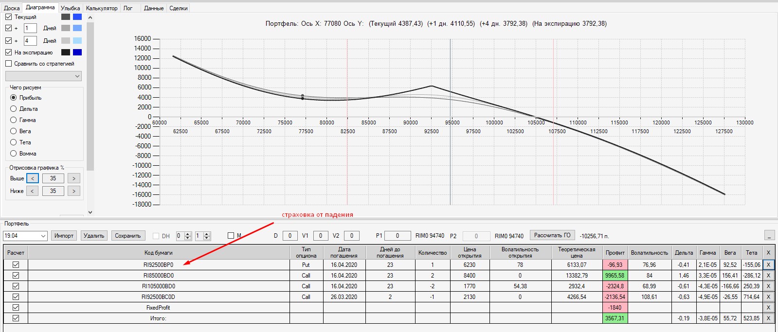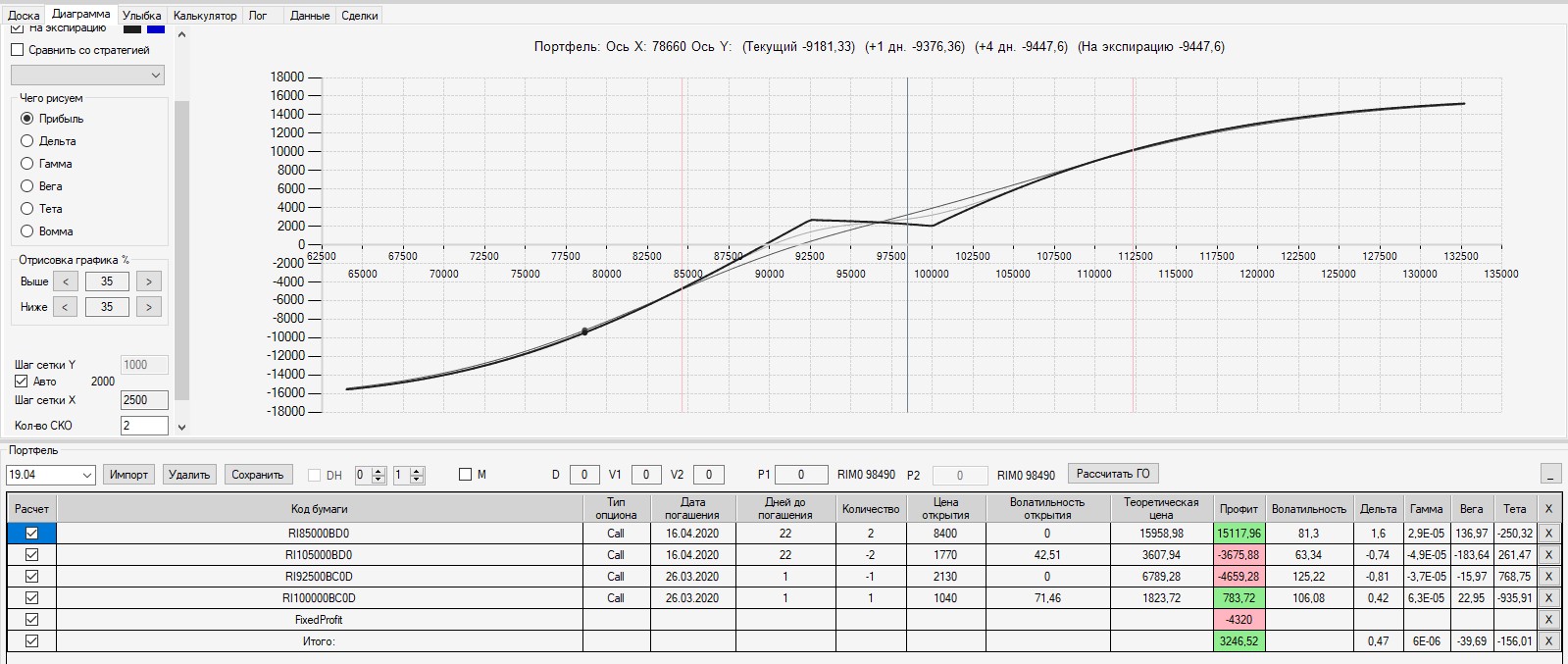 При этом, поскольку сейчас бешенная волатильность, в колл-спред внедряю проданный колл 23.03. в расчете на его распад за ближайшие 4 дня