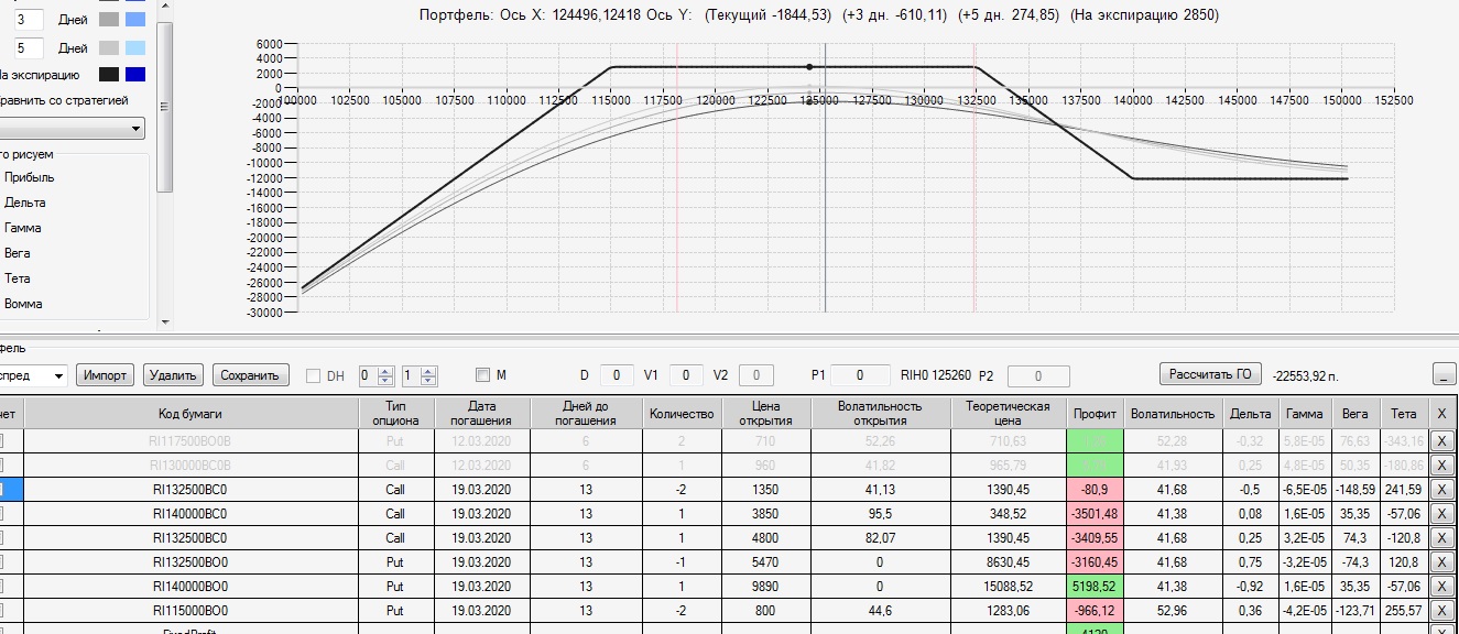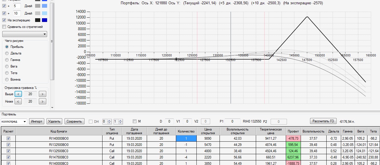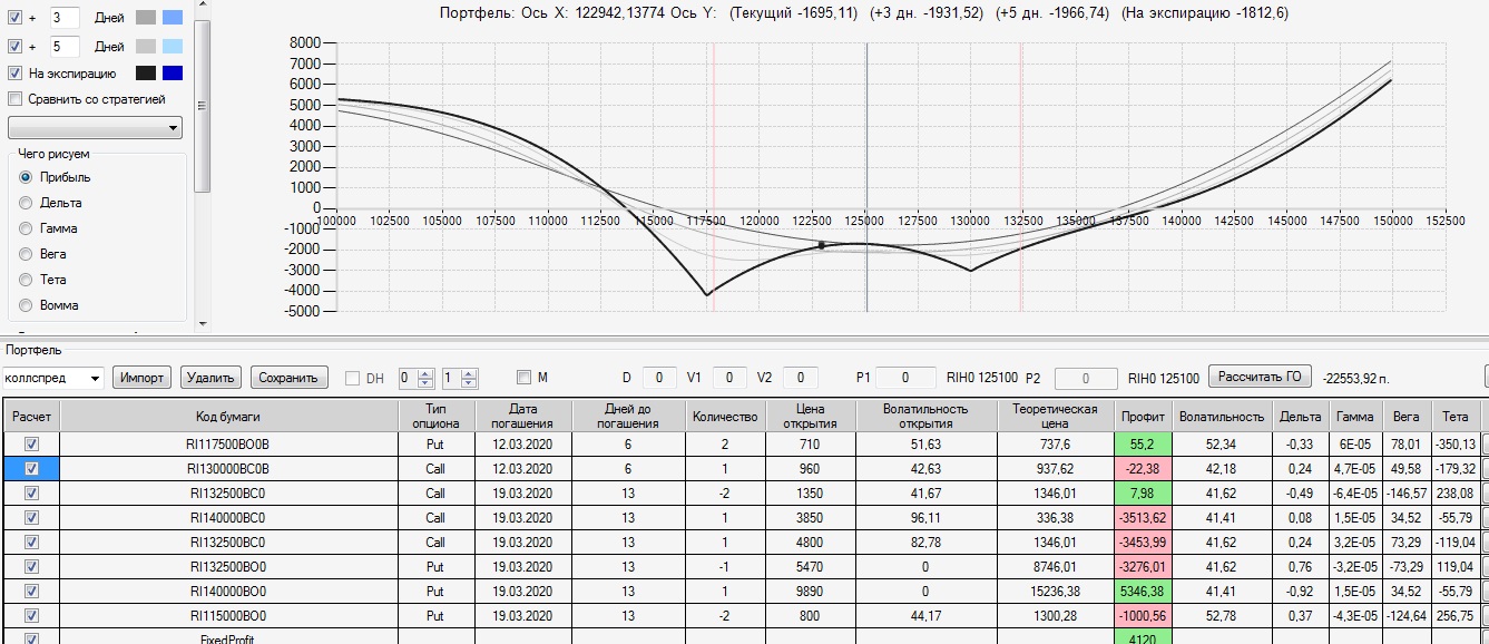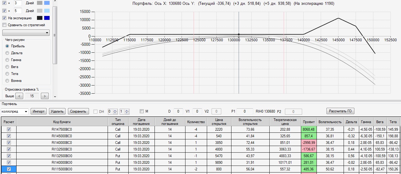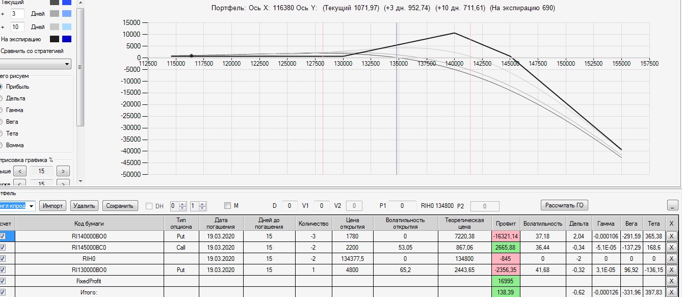 на 28.02. была следующая картина по построенному 17,02 колл-спреду. Цена ФРТС двигается в диапазоне 130000-136000, убыток по конструкции 2570п. 03.03 внес следующие изменения в конструкцию: продал четыре 145 колла и два 115 пута. на экспирацию профиль стал плюсовой (+1190п), левый край на 114500 правый край на 148500. Вот теперь думаю: до экспирации 2 недели стоит ли на праздники делать страховку?
