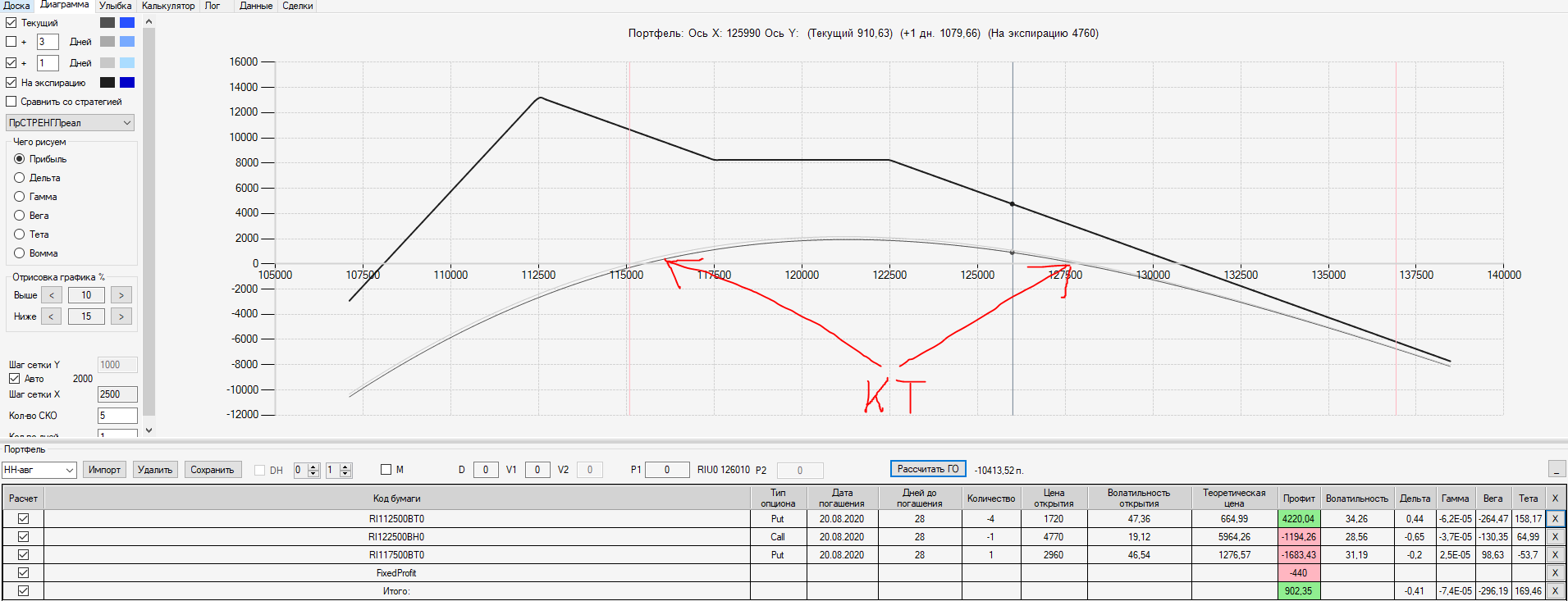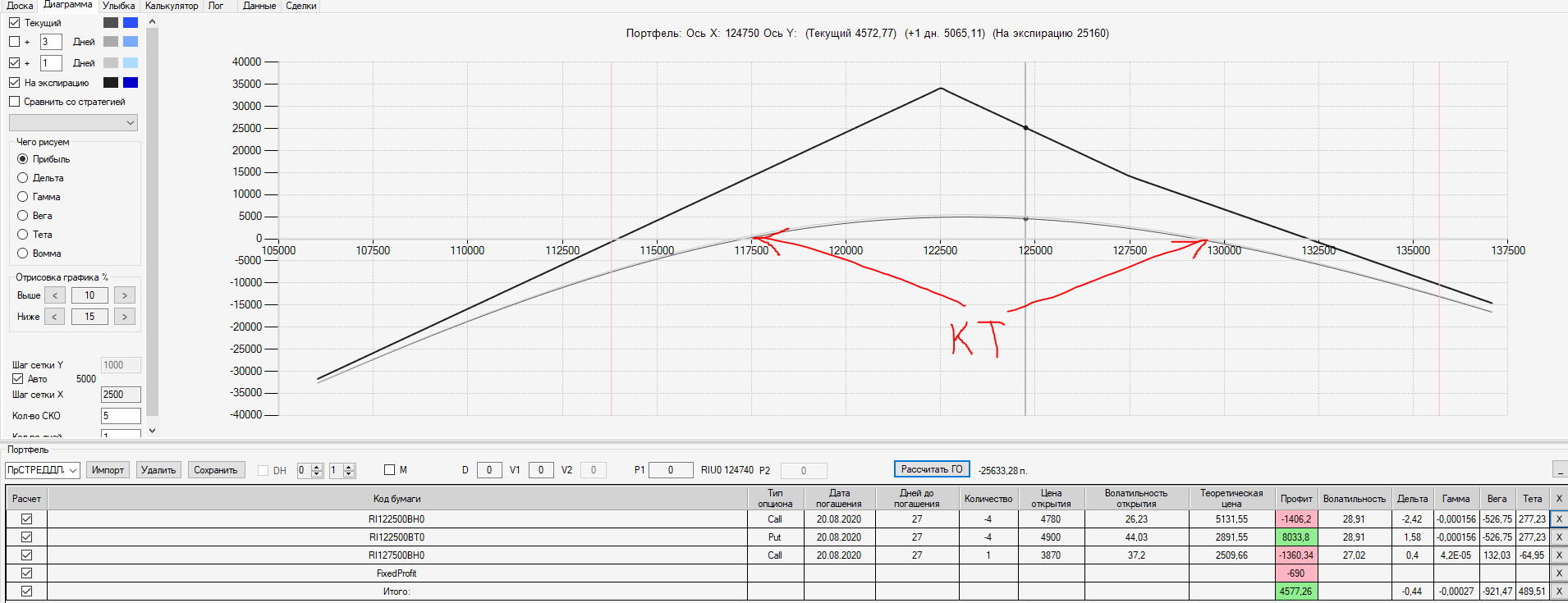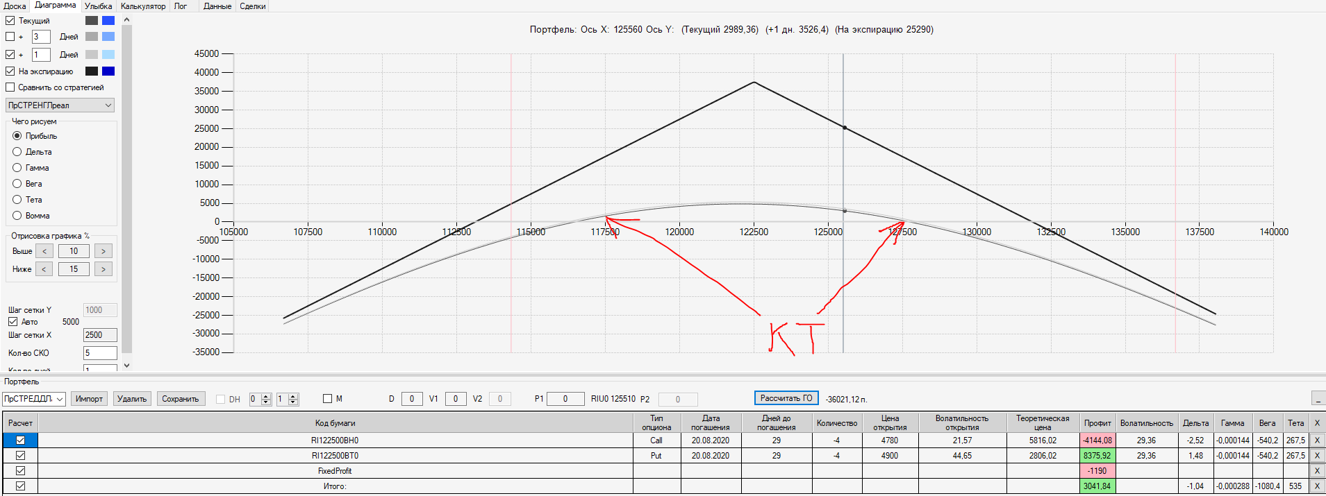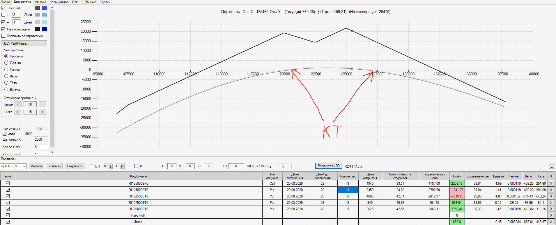 При пробое уровня 125000 (КТ) добавил в имеющуюся ОК новую ОК "Проданный Стреддл" на 125 серии опционов