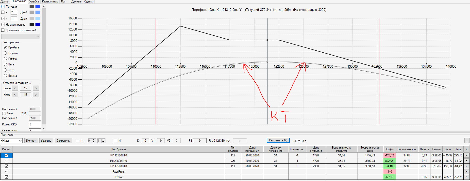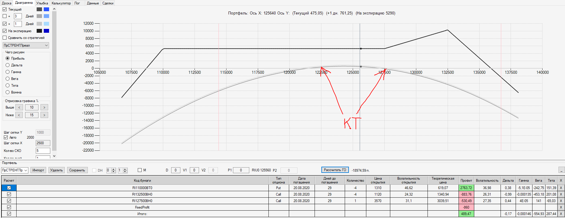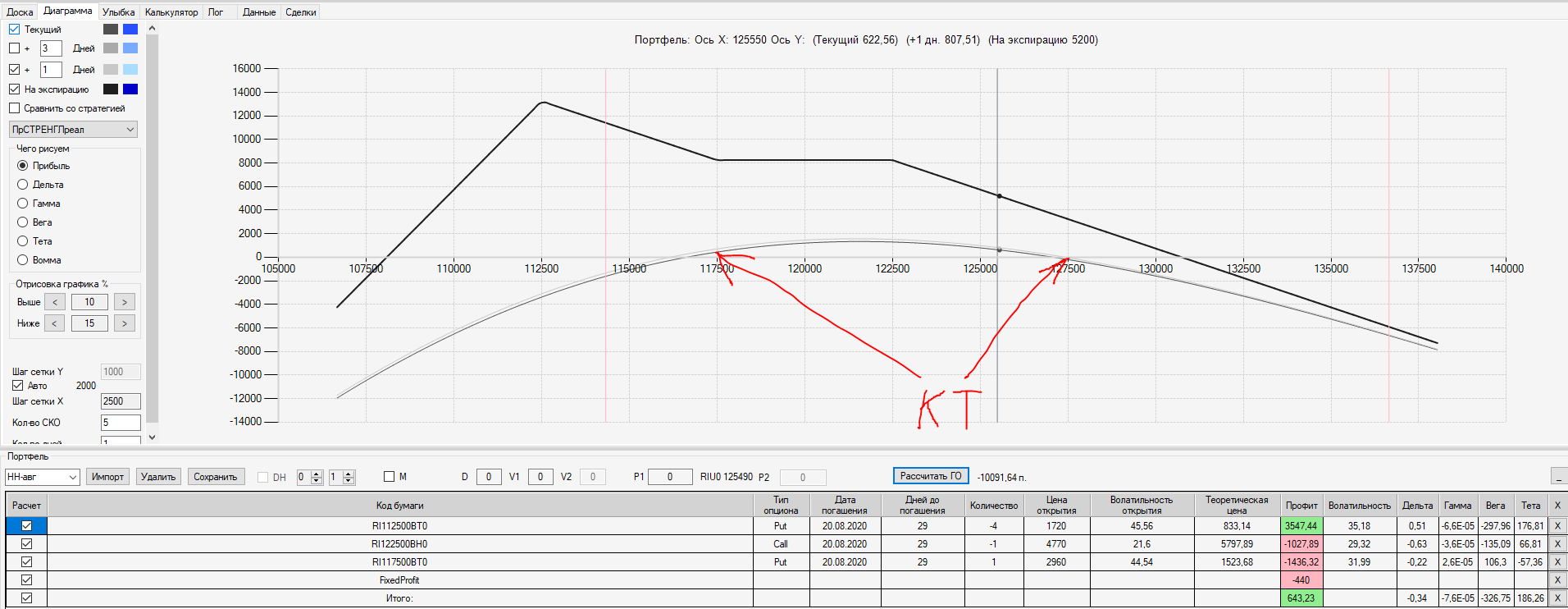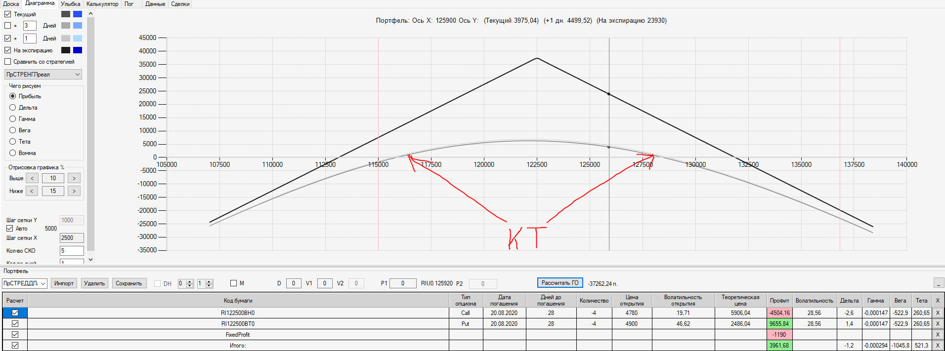 При пробое уровня 125000 (КТ) добавил в имеющуюся ОК новую ОК "Проданный Стреддл" на 125 серии опционов