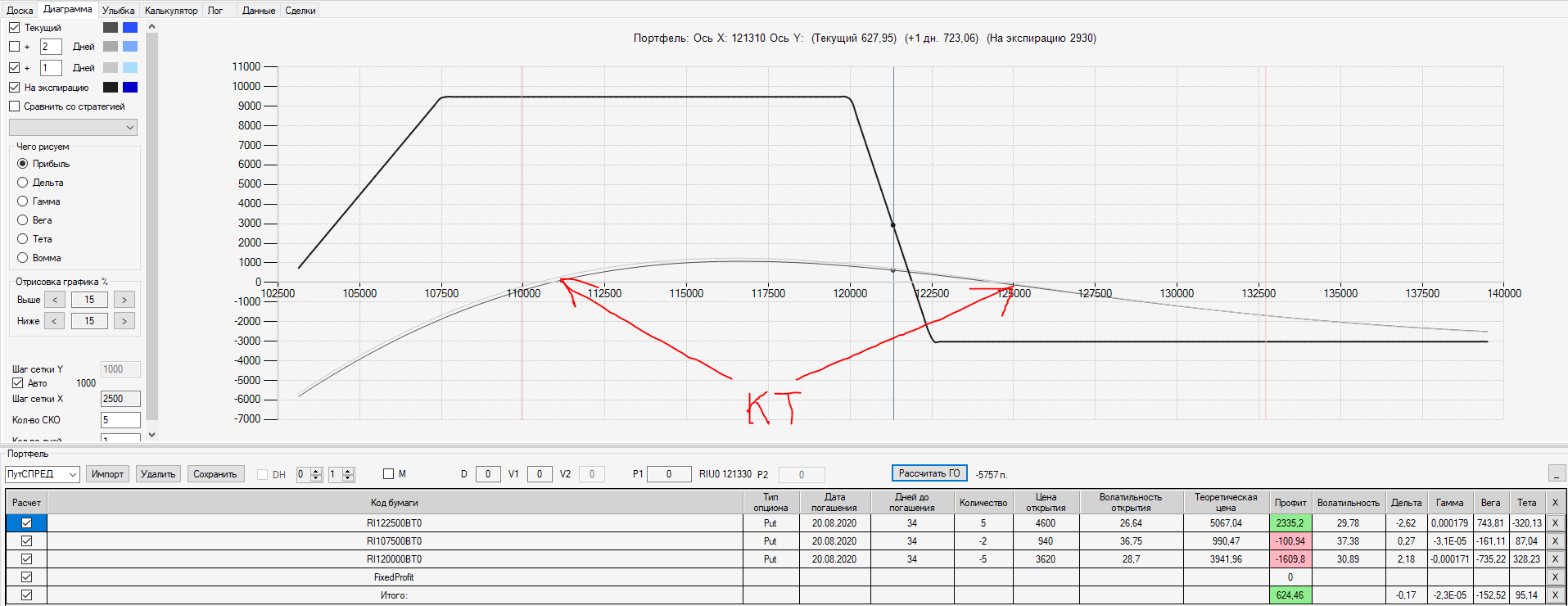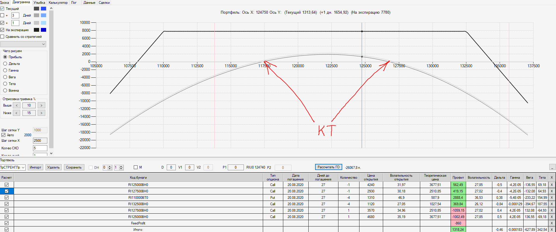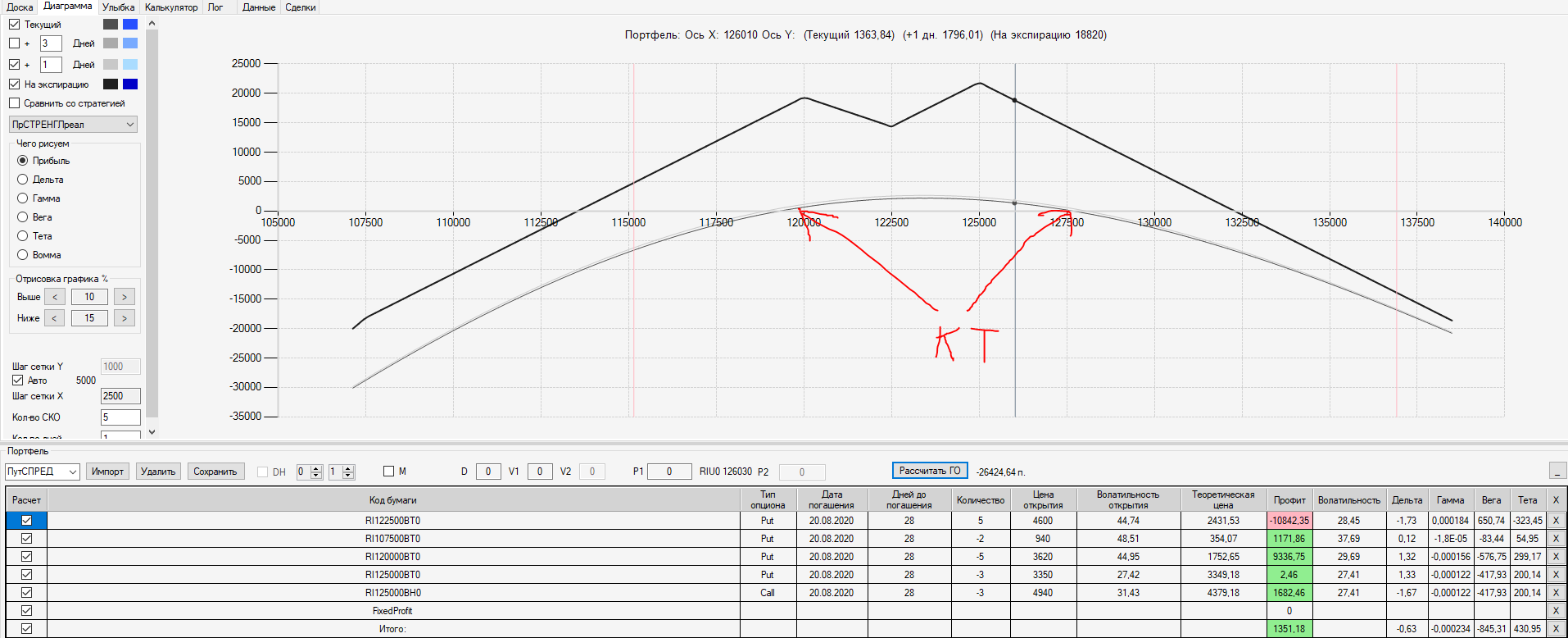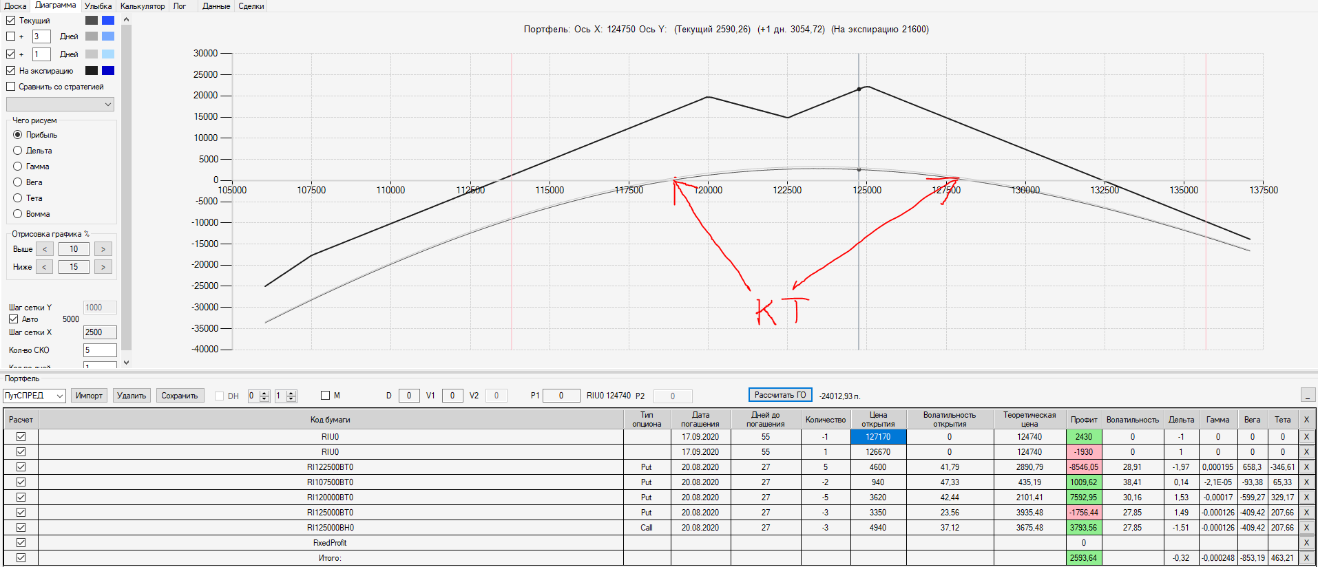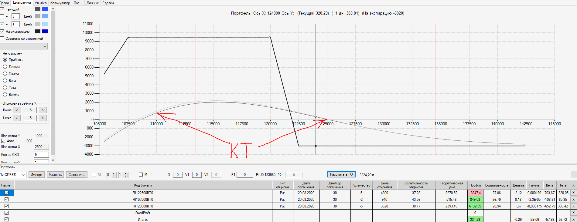 При пробое уровня 125000 (КТ) добавил в имеющуюся ОК новую ОК "Проданный Стреддл" на 125 серии опционов
