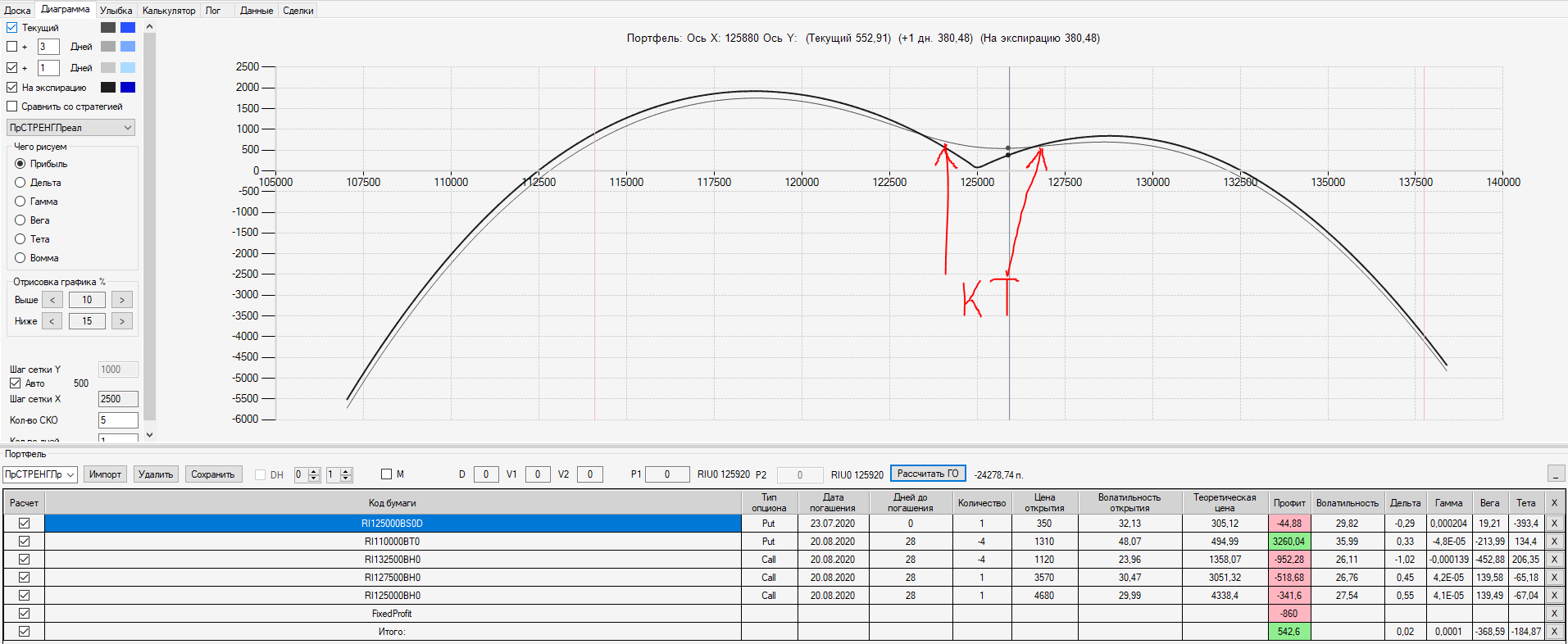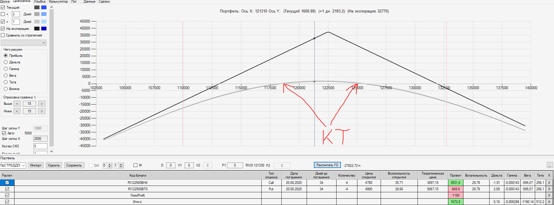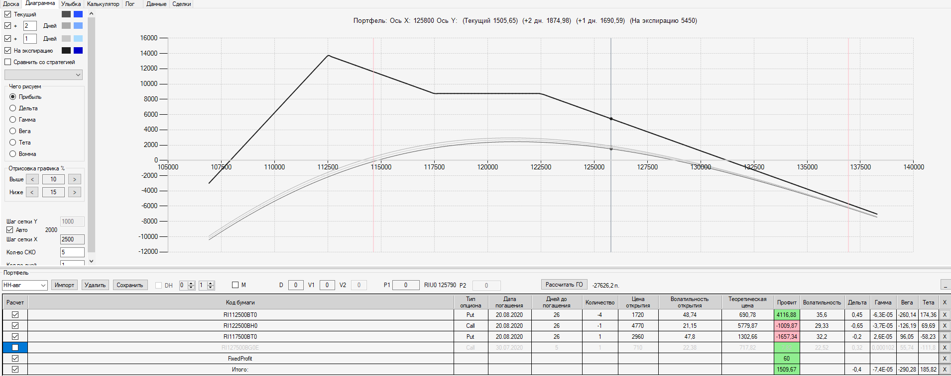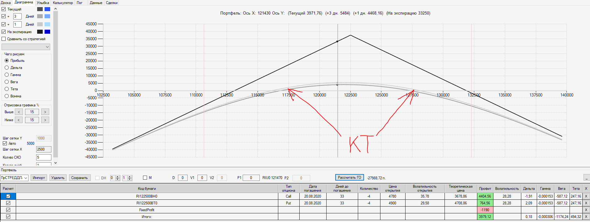 При пробое уровня 125000 (КТ) добавил в имеющуюся ОК новую ОК "Проданный Стреддл" на 125 серии опционов