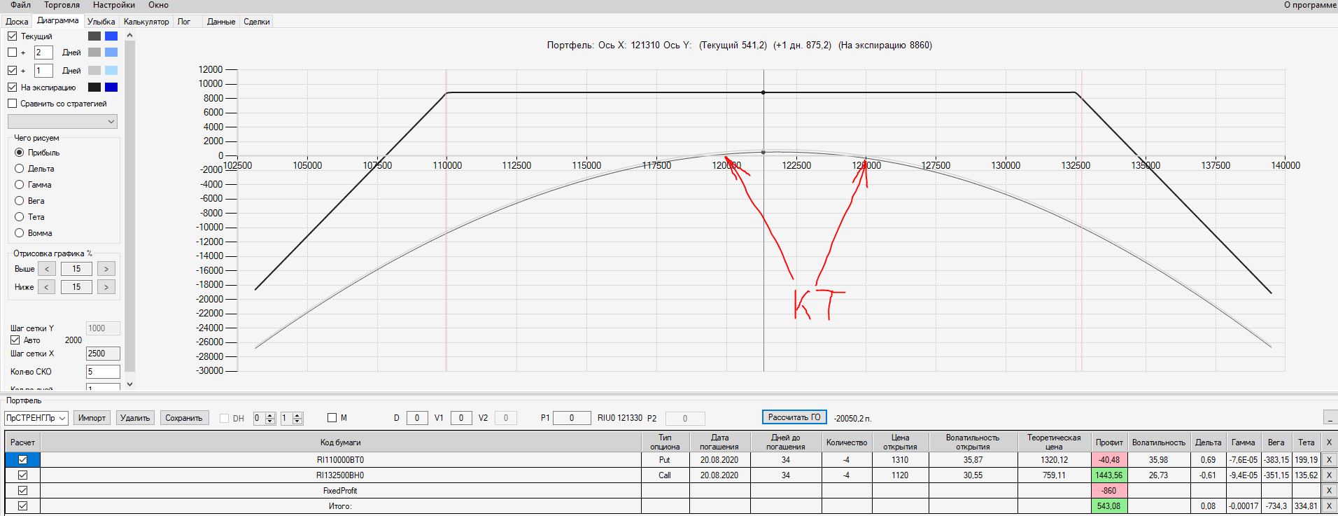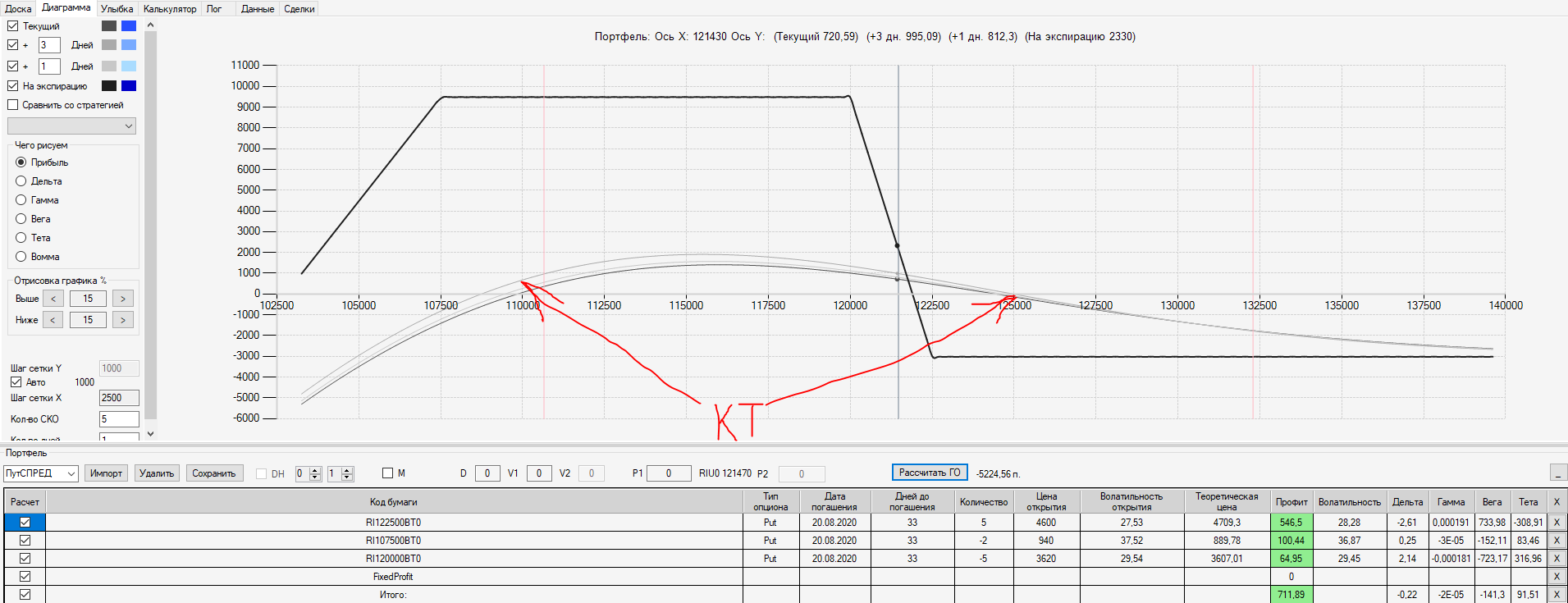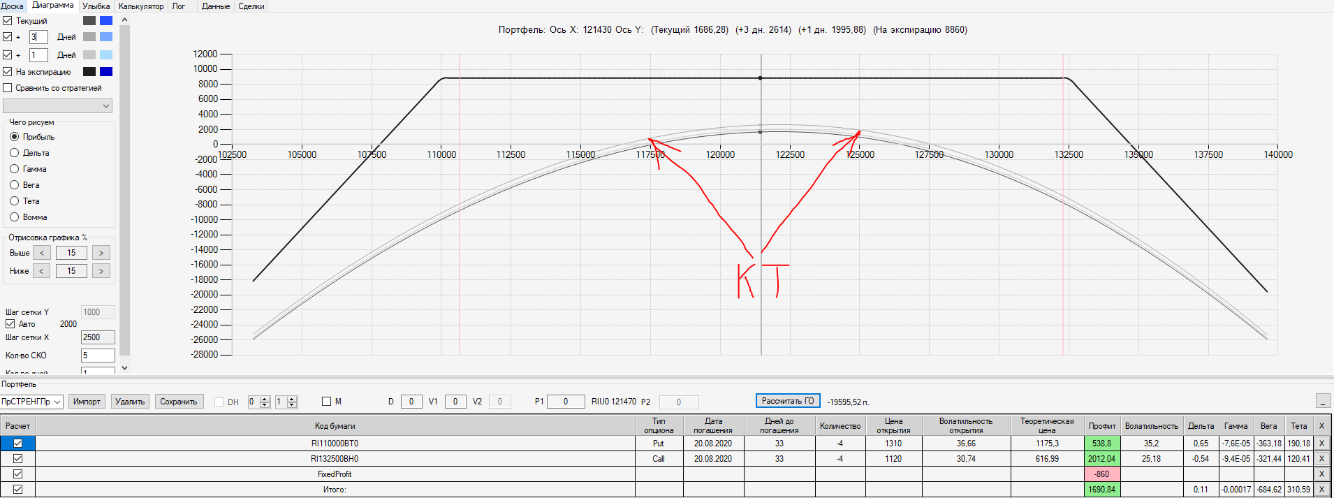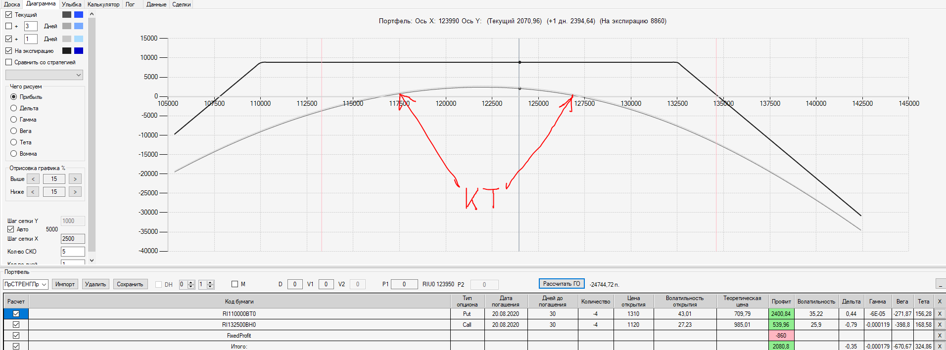 При пробое уровня 125000 (КТ) добавил в имеющуюся ОК новую ОК "Проданный Стреддл" на 125 серии опционов