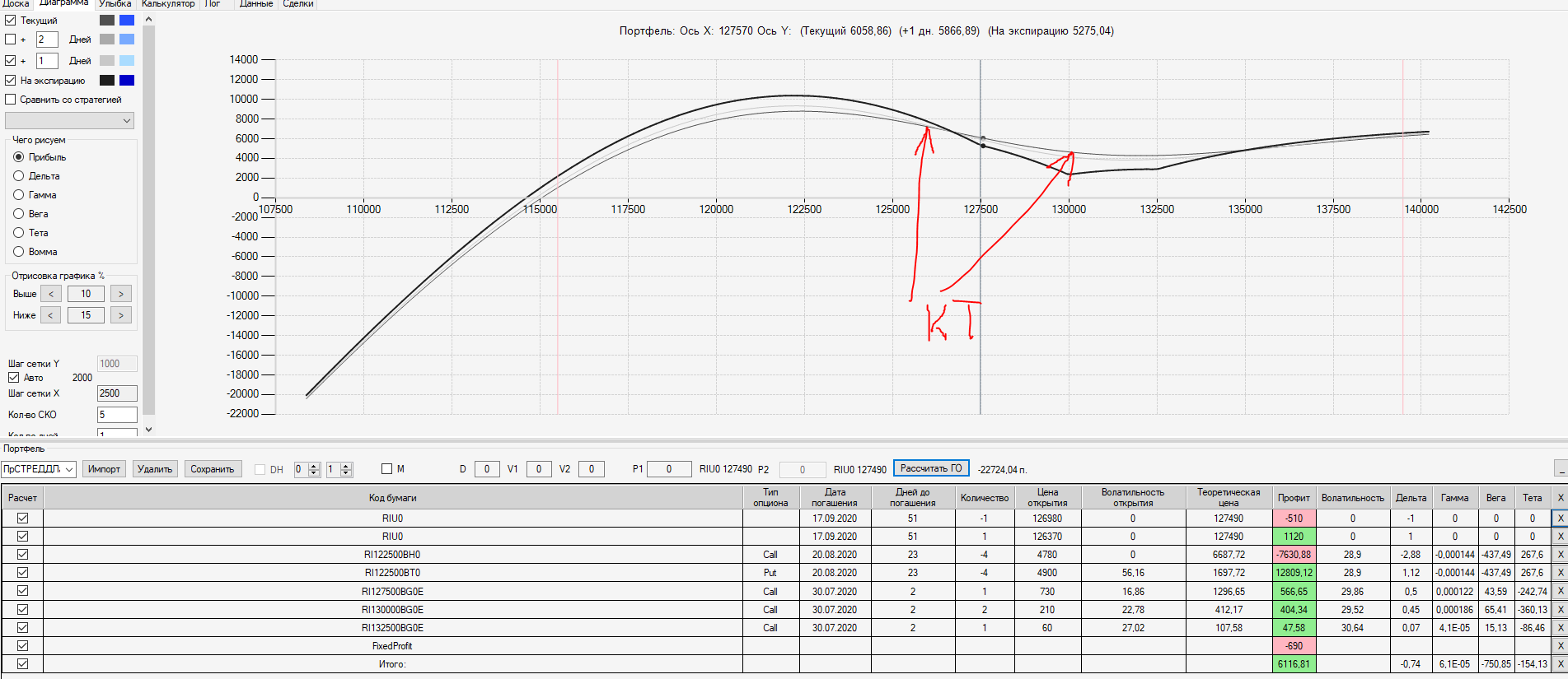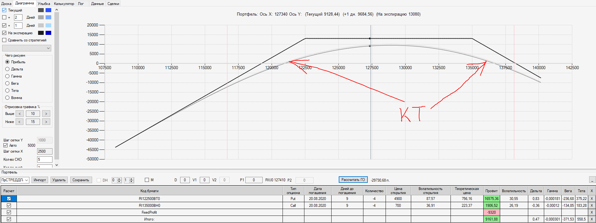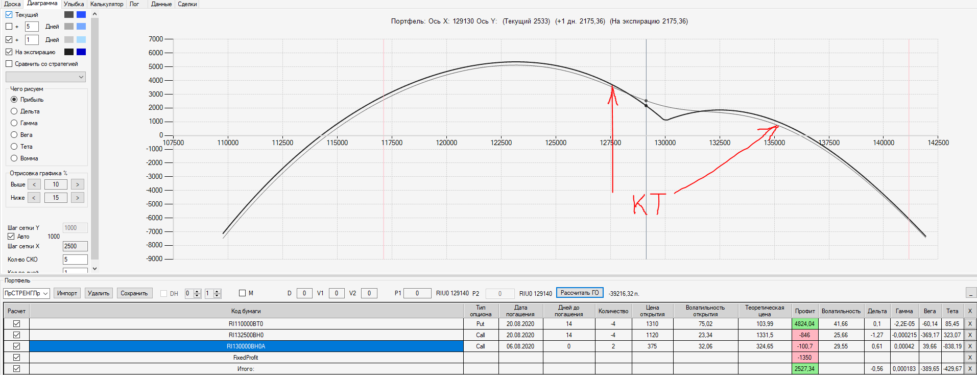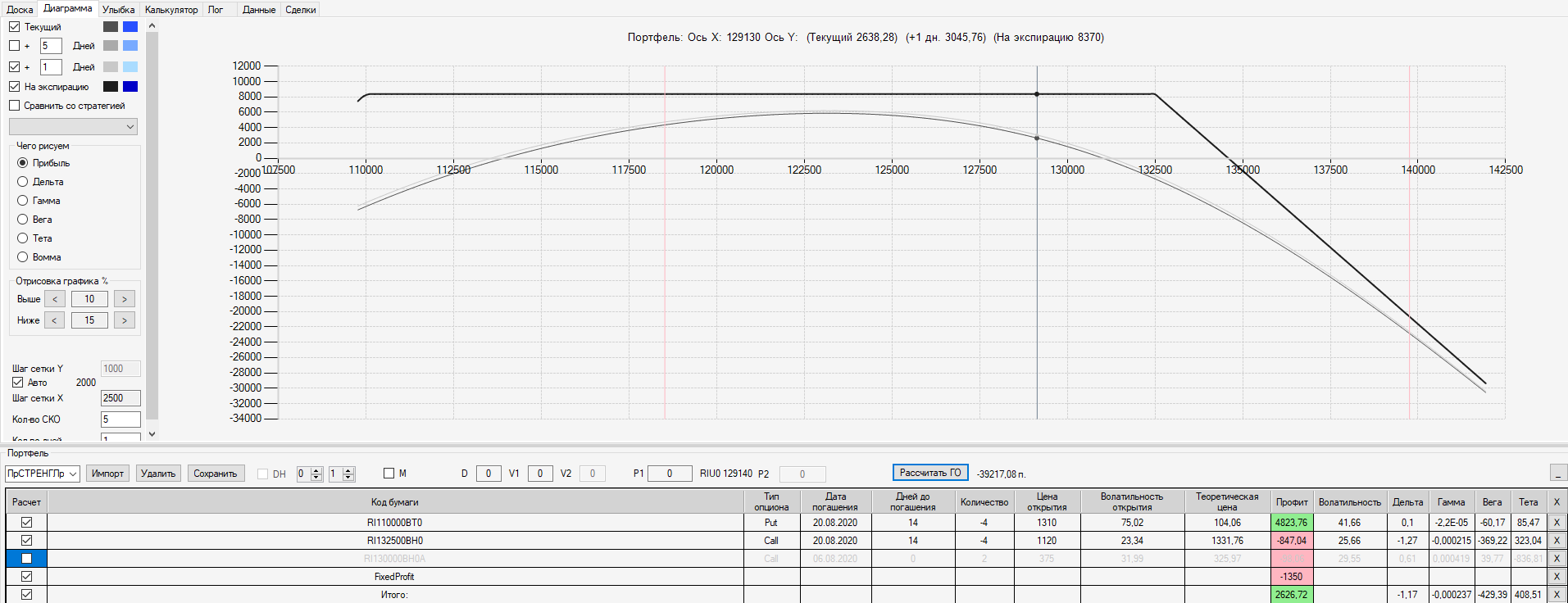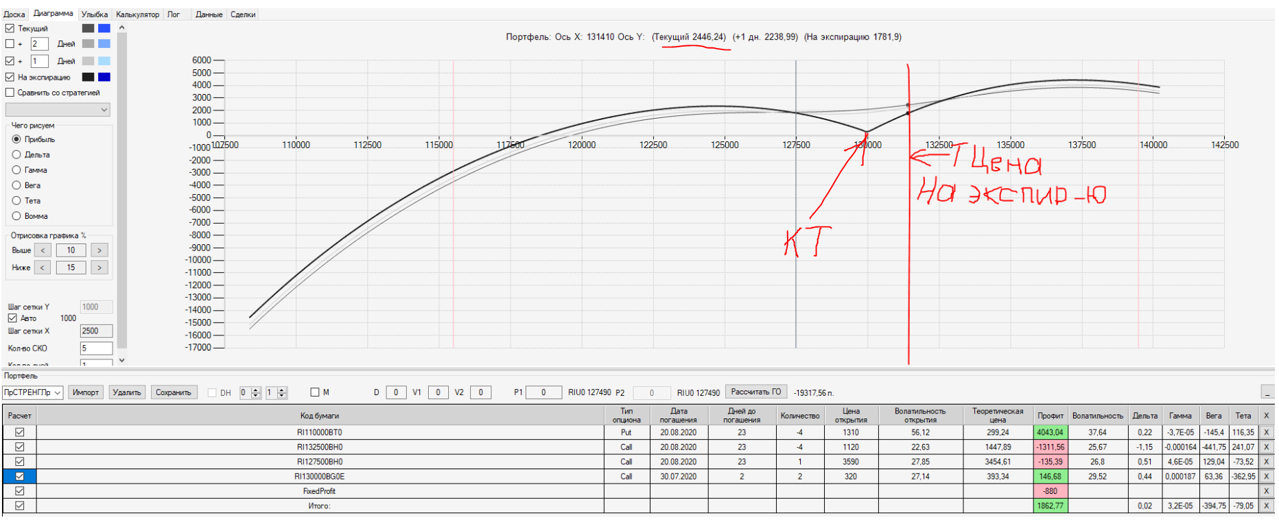 Например, мы ввели страховку недельными опционами и профиль получается нормальный. Но если мы оставляем эту страховку до экспирации (цена за это время будет находится в диапазоне 127500 - 132500), то может получиться, что страховку мы закрываем с прибылью, а профиль оставшейся позиции может оказаться в "-" (((. Предположим, что Текущая Цена БА на экспирацию будет 131410 пунктов. По профилю на экспирацию (+4 дня) Аналитик показывает прибыль. А после экспирации опциона уже показывает убыток (без учёта прибыли опциона). Опцион стоимостью 320 пунктов, допустим, не компенсирует своей прибылью убыток. Значит надо начинать управлять ОК уже тогда, когда профиль позиции (без учёта страховки недельными опционами)  приближается к "0"? И надеяться только на такую страховку (недельными опционами, в случае оставления их до экспирации) нельзя, необходимо добавлять месячные опционы?