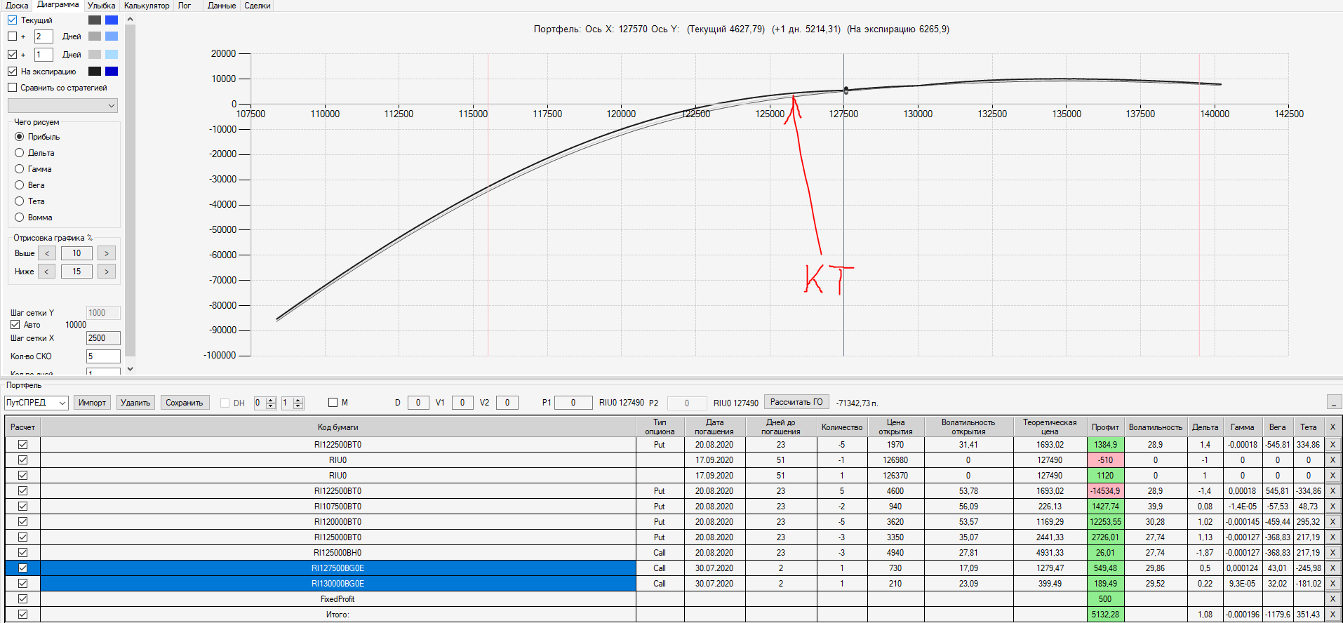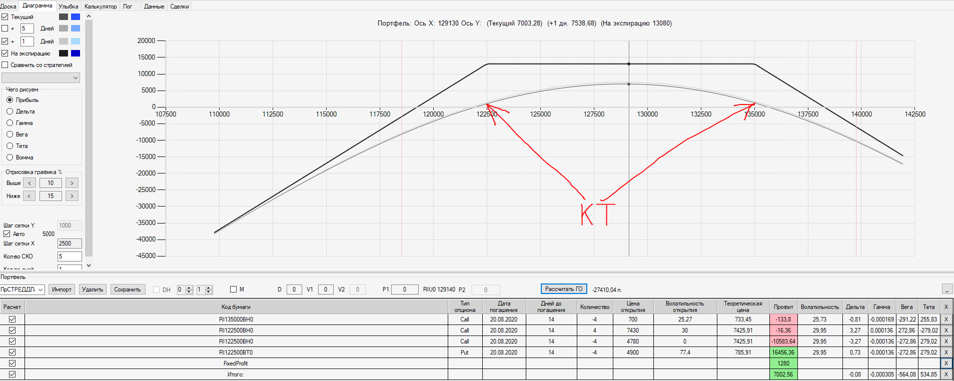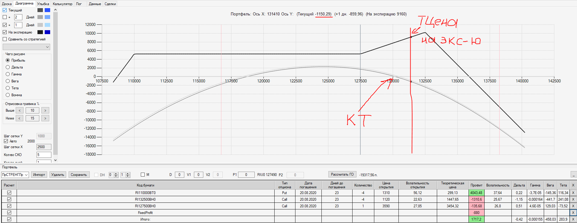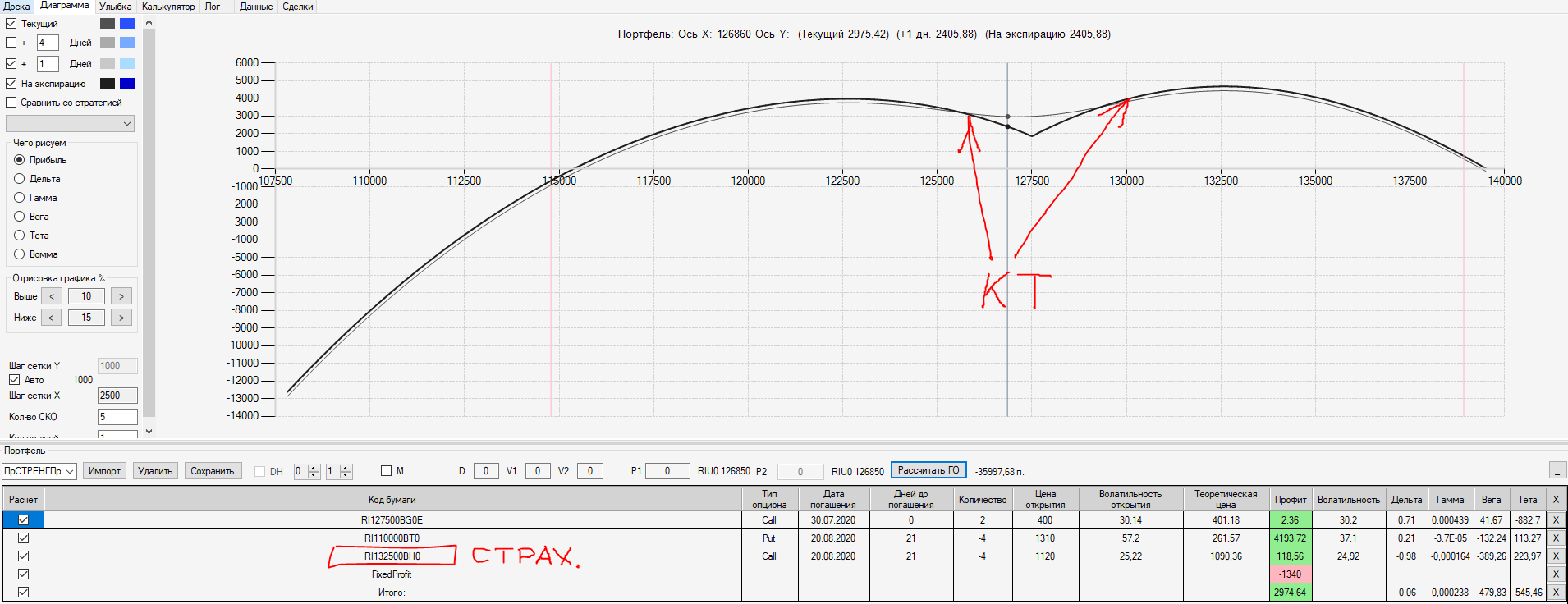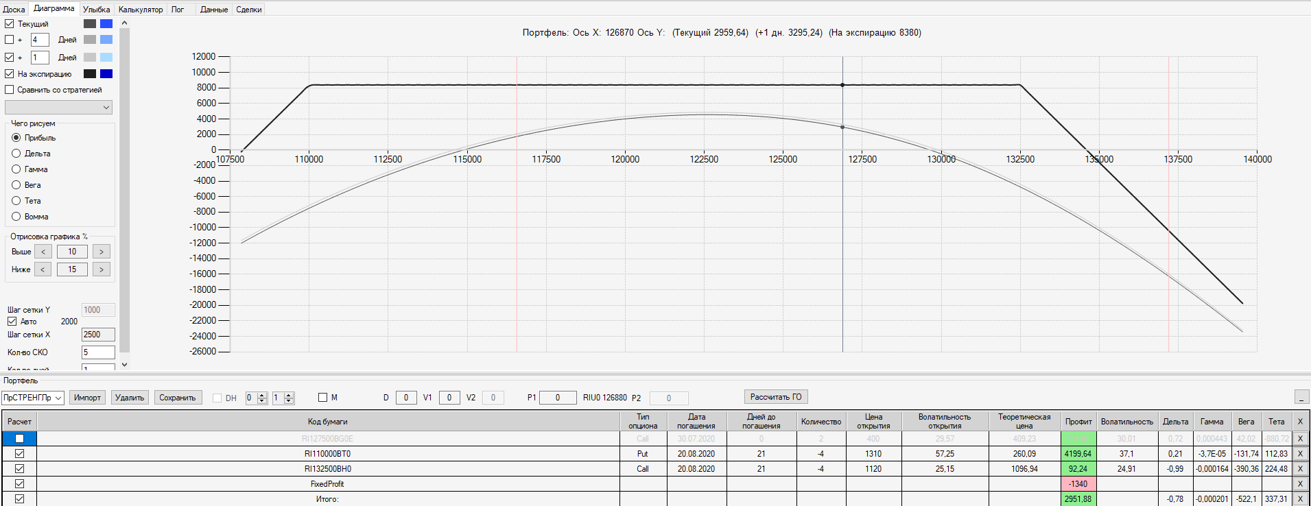 Например, мы ввели страховку недельными опционами и профиль получается нормальный. Но если мы оставляем эту страховку до экспирации (цена за это время будет находится в диапазоне 127500 - 132500), то может получиться, что страховку мы закрываем с прибылью, а профиль оставшейся позиции может оказаться в "-" (((. Предположим, что Текущая Цена БА на экспирацию будет 131410 пунктов. По профилю на экспирацию (+4 дня) Аналитик показывает прибыль. А после экспирации опциона уже показывает убыток (без учёта прибыли опциона). Опцион стоимостью 320 пунктов, допустим, не компенсирует своей прибылью убыток. Значит надо начинать управлять ОК уже тогда, когда профиль позиции (без учёта страховки недельными опционами)  приближается к "0"? И надеяться только на такую страховку (недельными опционами, в случае оставления их до экспирации) нельзя, необходимо добавлять месячные опционы?