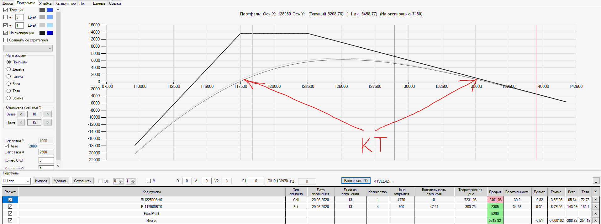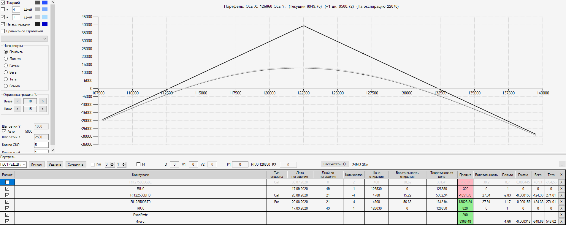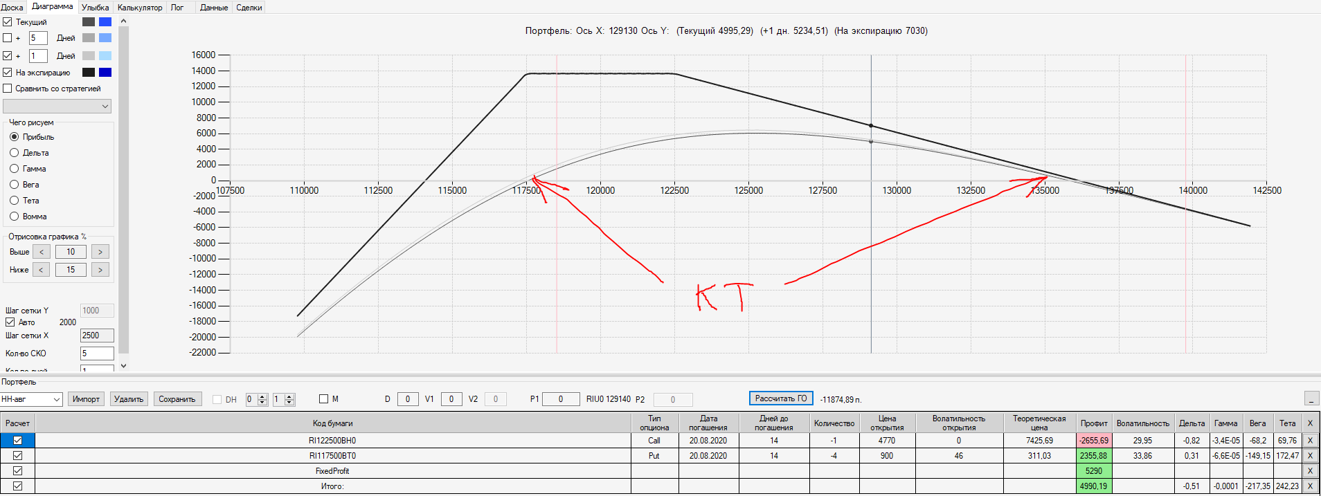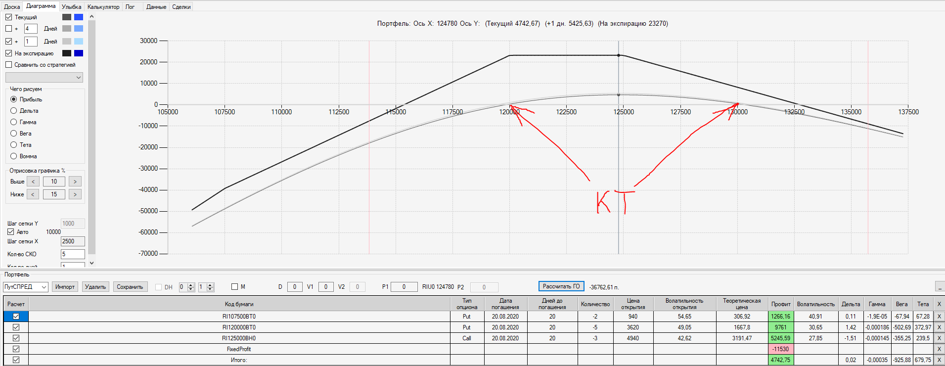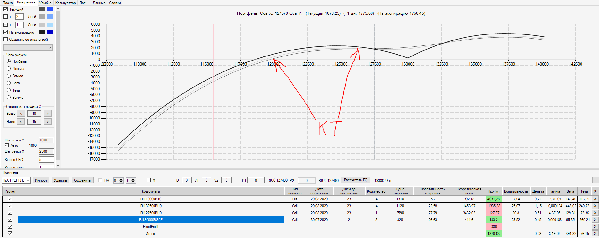 Например, мы ввели страховку недельными опционами и профиль получается нормальный. Но если мы оставляем эту страховку до экспирации (цена за это время будет находится в диапазоне 127500 - 132500), то может получиться, что страховку мы закрываем с прибылью, а профиль оставшейся позиции может оказаться в "-" (((. Предположим, что Текущая Цена БА на экспирацию будет 131410 пунктов. По профилю на экспирацию (+4 дня) Аналитик показывает прибыль. А после экспирации опциона уже показывает убыток (без учёта прибыли опциона). Опцион стоимостью 320 пунктов, допустим, не компенсирует своей прибылью убыток. Значит надо начинать управлять ОК уже тогда, когда профиль позиции (без учёта страховки недельными опционами)  приближается к "0"? И надеяться только на такую страховку (недельными опционами, в случае оставления их до экспирации) нельзя, необходимо добавлять месячные опционы?