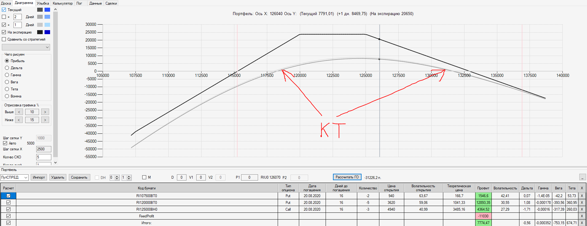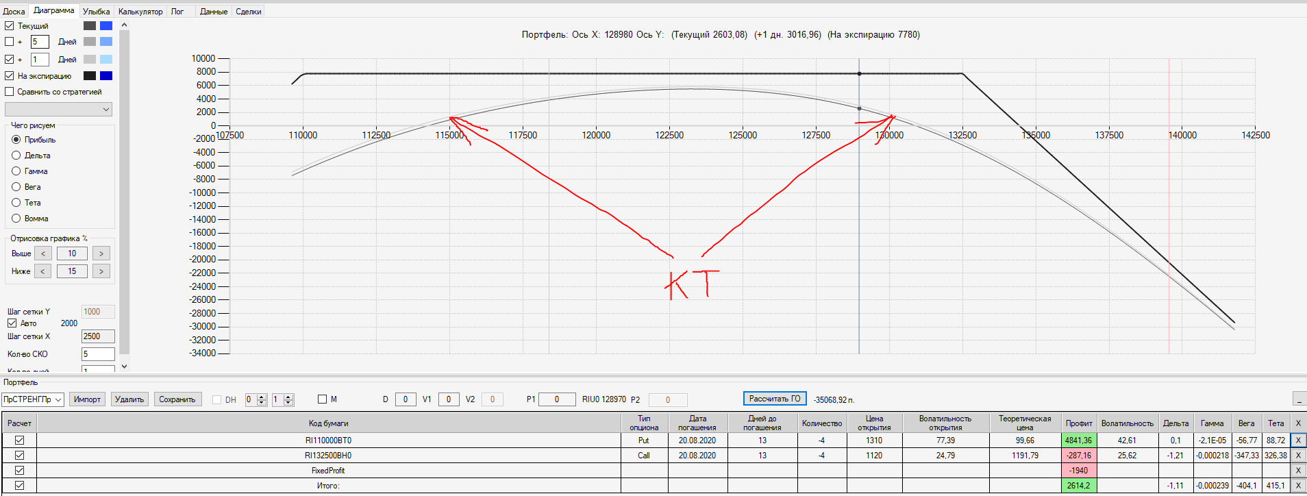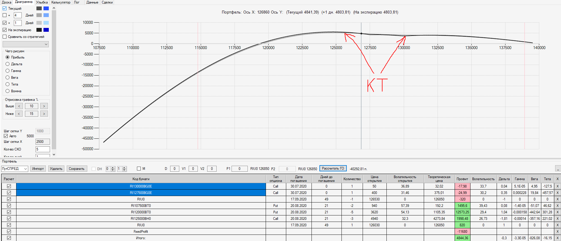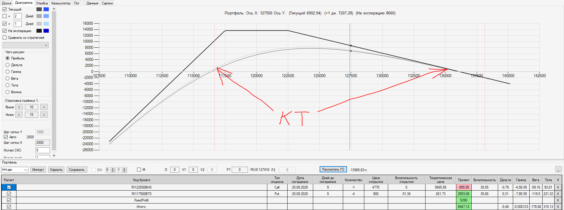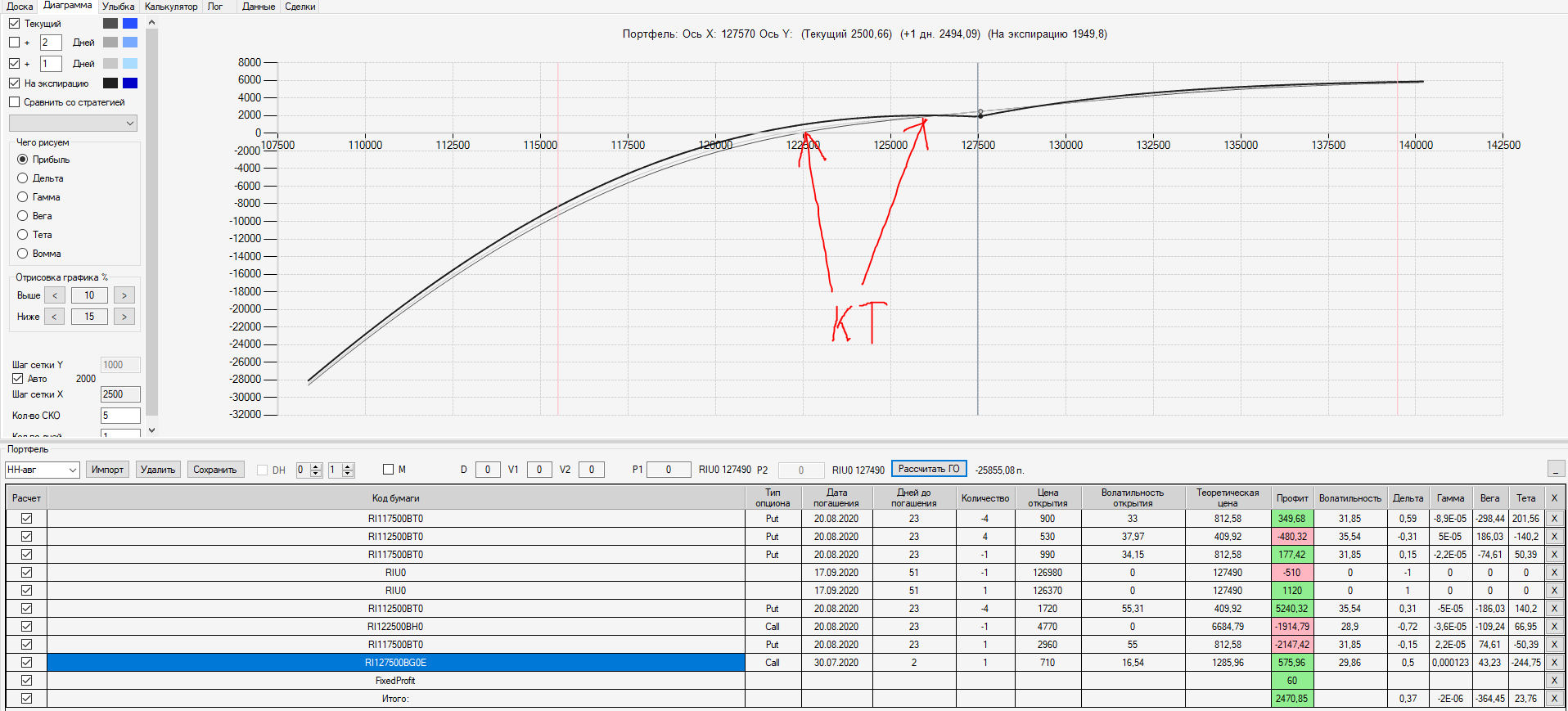 Например, мы ввели страховку недельными опционами и профиль получается нормальный. Но если мы оставляем эту страховку до экспирации (цена за это время будет находится в диапазоне 127500 - 132500), то может получиться, что страховку мы закрываем с прибылью, а профиль оставшейся позиции может оказаться в "-" (((. Предположим, что Текущая Цена БА на экспирацию будет 131410 пунктов. По профилю на экспирацию (+4 дня) Аналитик показывает прибыль. А после экспирации опциона уже показывает убыток (без учёта прибыли опциона). Опцион стоимостью 320 пунктов, допустим, не компенсирует своей прибылью убыток. Значит надо начинать управлять ОК уже тогда, когда профиль позиции (без учёта страховки недельными опционами)  приближается к "0"? И надеяться только на такую страховку (недельными опционами, в случае оставления их до экспирации) нельзя, необходимо добавлять месячные опционы?