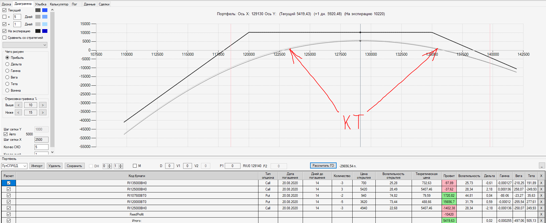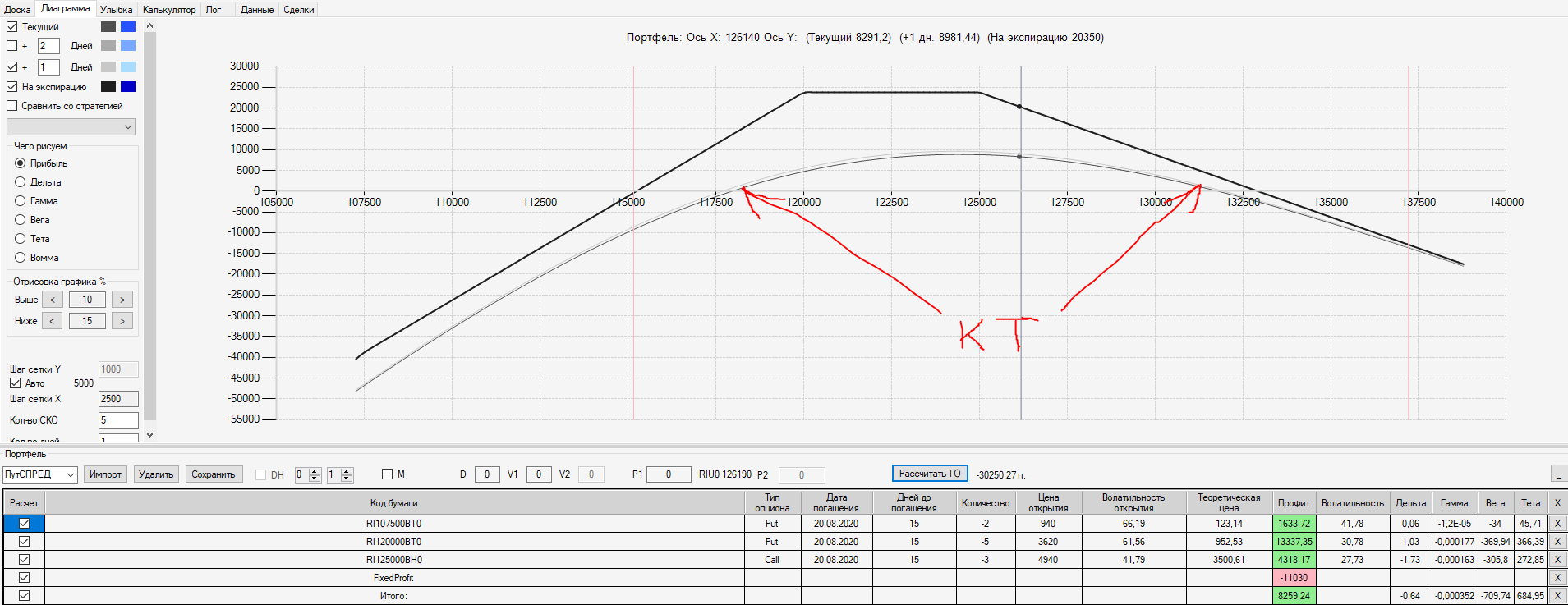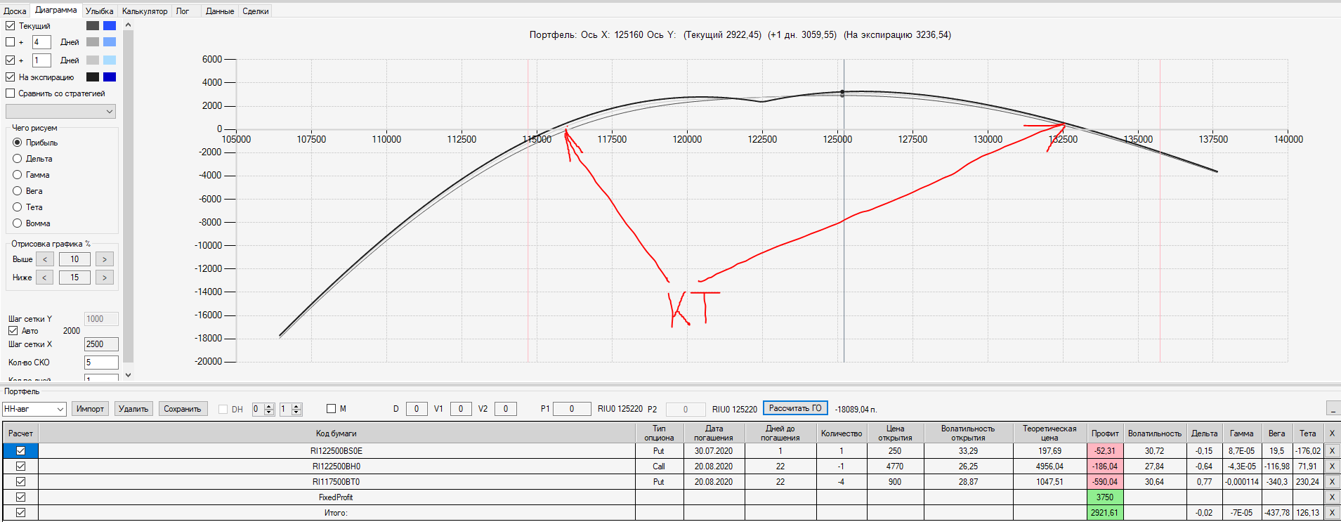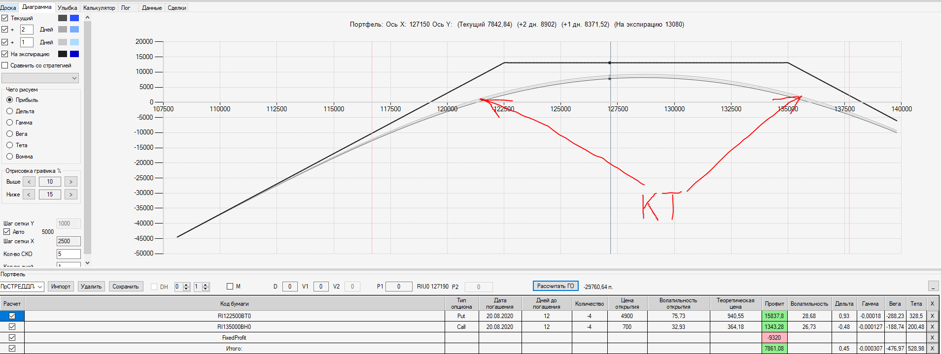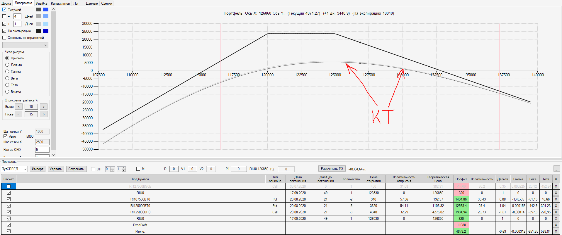 Например, мы ввели страховку недельными опционами и профиль получается нормальный. Но если мы оставляем эту страховку до экспирации (цена за это время будет находится в диапазоне 127500 - 132500), то может получиться, что страховку мы закрываем с прибылью, а профиль оставшейся позиции может оказаться в "-" (((. Предположим, что Текущая Цена БА на экспирацию будет 131410 пунктов. По профилю на экспирацию (+4 дня) Аналитик показывает прибыль. А после экспирации опциона уже показывает убыток (без учёта прибыли опциона). Опцион стоимостью 320 пунктов, допустим, не компенсирует своей прибылью убыток. Значит надо начинать управлять ОК уже тогда, когда профиль позиции (без учёта страховки недельными опционами)  приближается к "0"? И надеяться только на такую страховку (недельными опционами, в случае оставления их до экспирации) нельзя, необходимо добавлять месячные опционы?