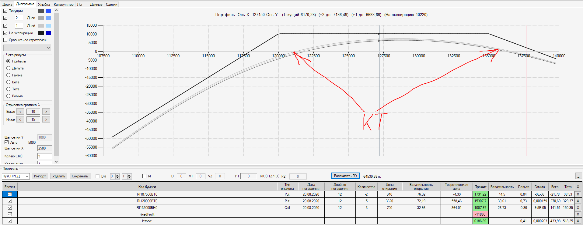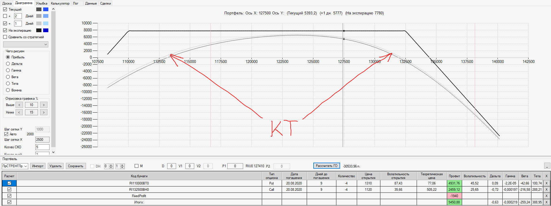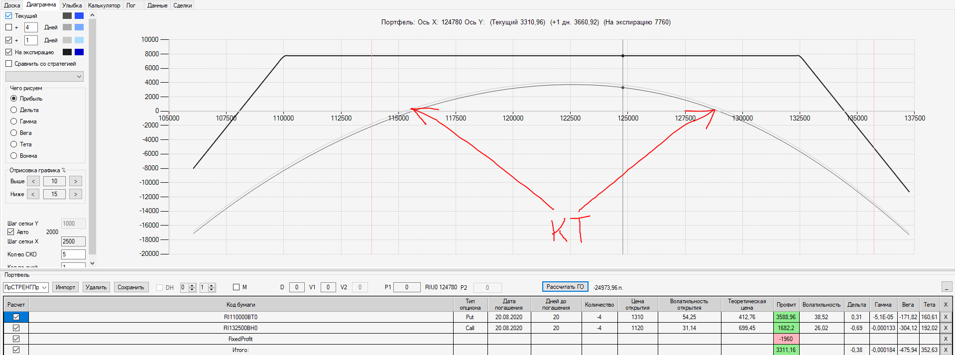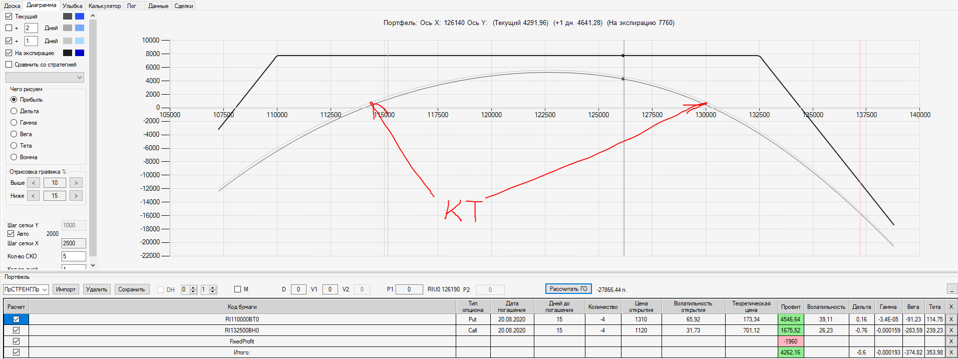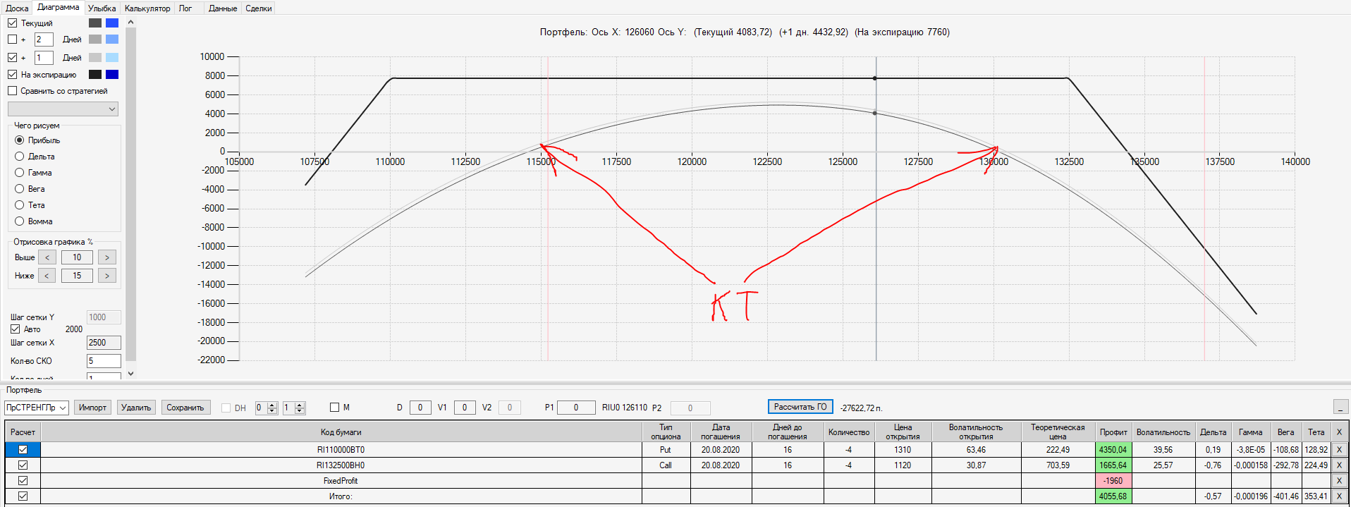 Например, мы ввели страховку недельными опционами и профиль получается нормальный. Но если мы оставляем эту страховку до экспирации (цена за это время будет находится в диапазоне 127500 - 132500), то может получиться, что страховку мы закрываем с прибылью, а профиль оставшейся позиции может оказаться в "-" (((. Предположим, что Текущая Цена БА на экспирацию будет 131410 пунктов. По профилю на экспирацию (+4 дня) Аналитик показывает прибыль. А после экспирации опциона уже показывает убыток (без учёта прибыли опциона). Опцион стоимостью 320 пунктов, допустим, не компенсирует своей прибылью убыток. Значит надо начинать управлять ОК уже тогда, когда профиль позиции (без учёта страховки недельными опционами)  приближается к "0"? И надеяться только на такую страховку (недельными опционами, в случае оставления их до экспирации) нельзя, необходимо добавлять месячные опционы?